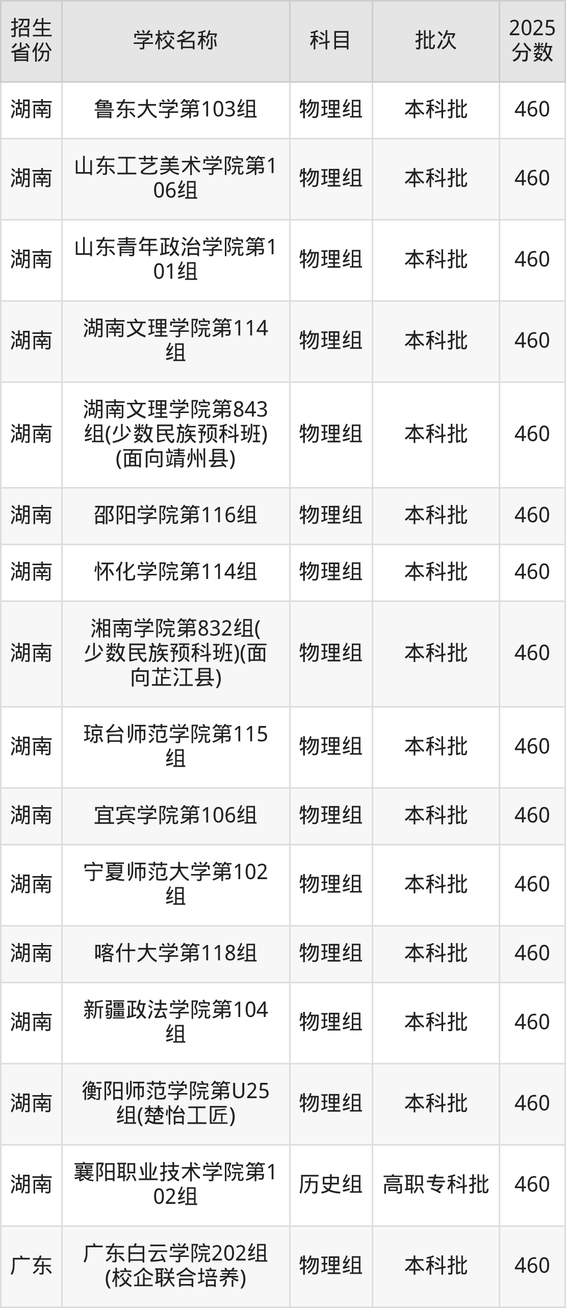 湖南省物理组分数线是460分的文科大学有:保定学院、莆田学院、鲁东大学、山东工艺美术学院、山东青年政治学院、湖南文理学院、邵阳学院、怀化学院、湘南学院、琼台师范学院。