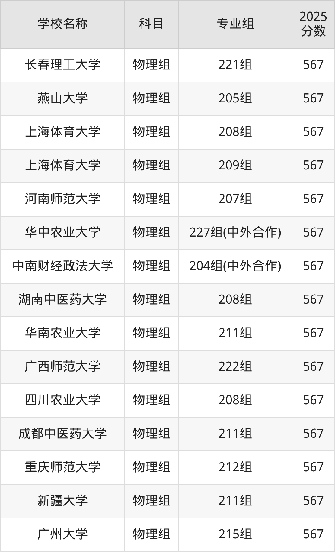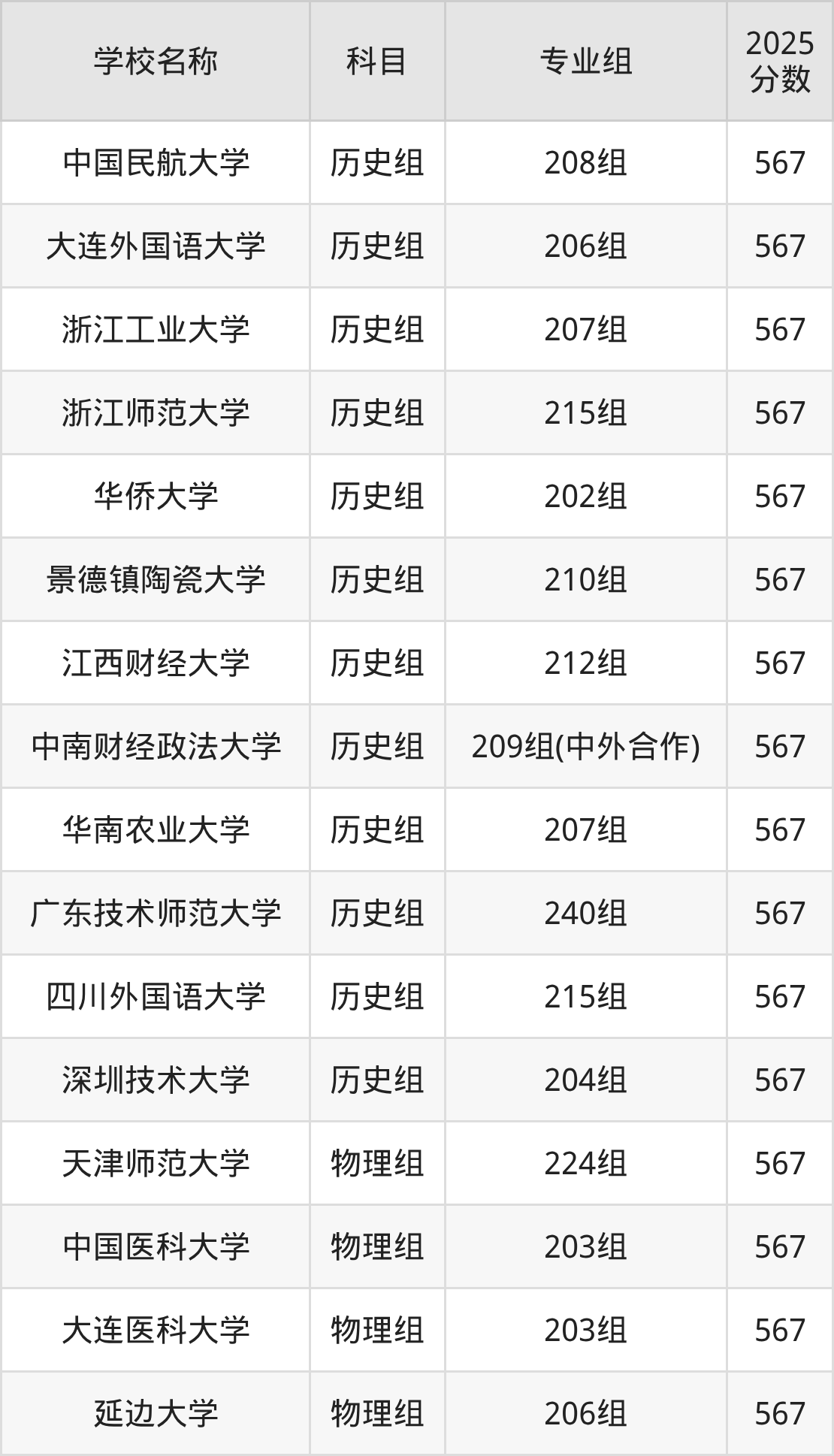 广东高考录取分数线在567分左右的公办院校专业组一共有31个,其中历史组有:中国民航大学(567分)、大连外国语大学(567分)、浙江工业大学(567分),物理组有:天津师范大学(567分)、中国医科大学(567分)、大连医科大学(567分)。