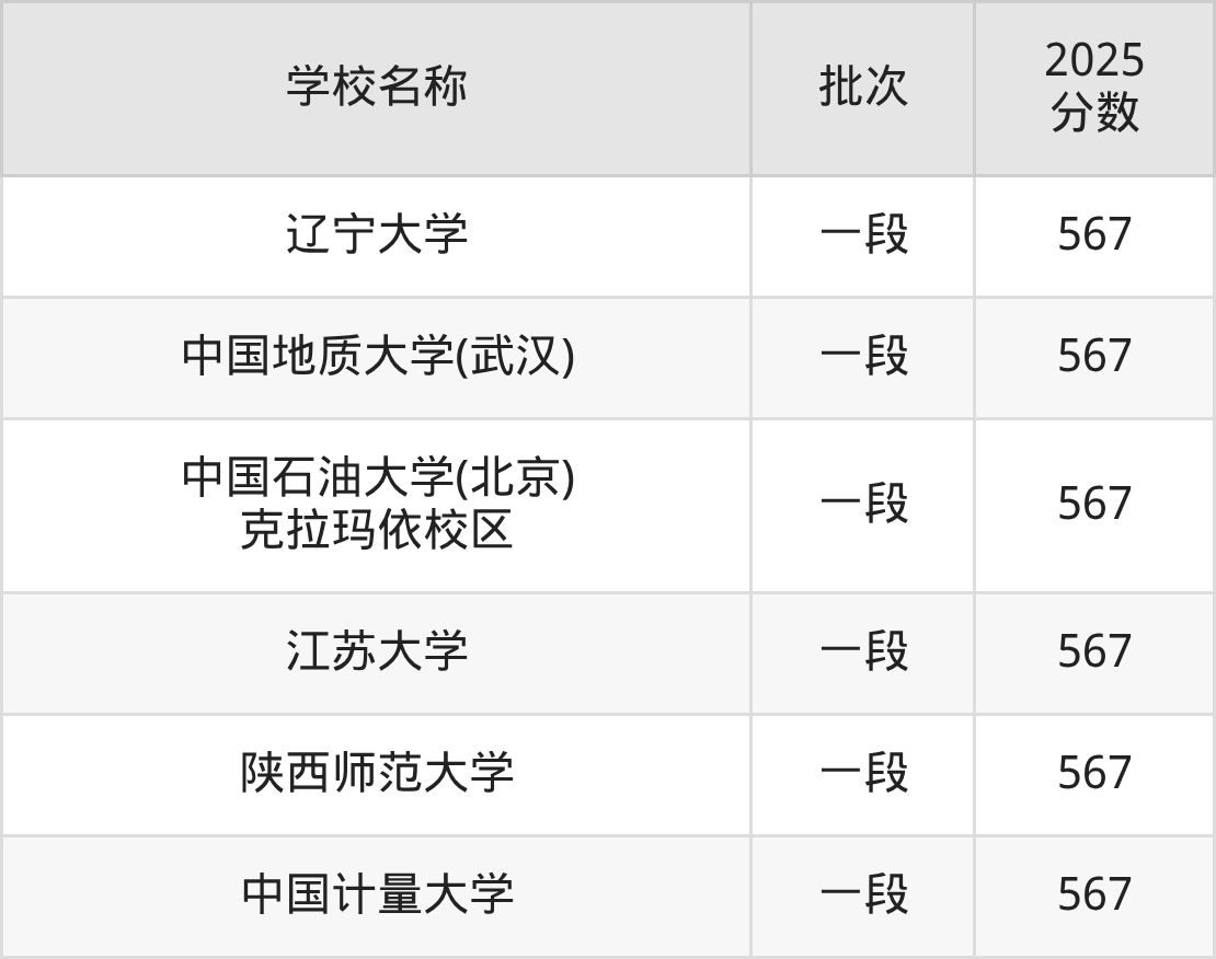 山东高考录取分数线在567分左右的公办大学一共有6所。分别是辽宁大学(567分)、中国地质大学(武汉)(567分)、中国石油大学(北京)克拉玛依校区(567分)
