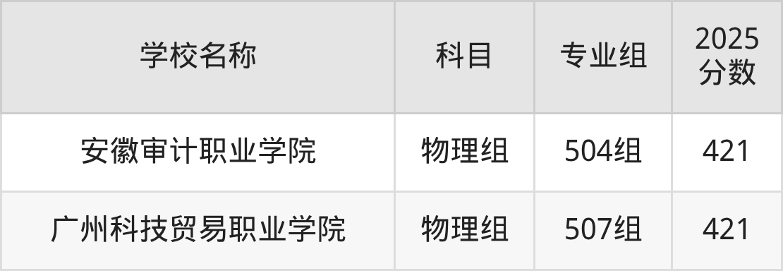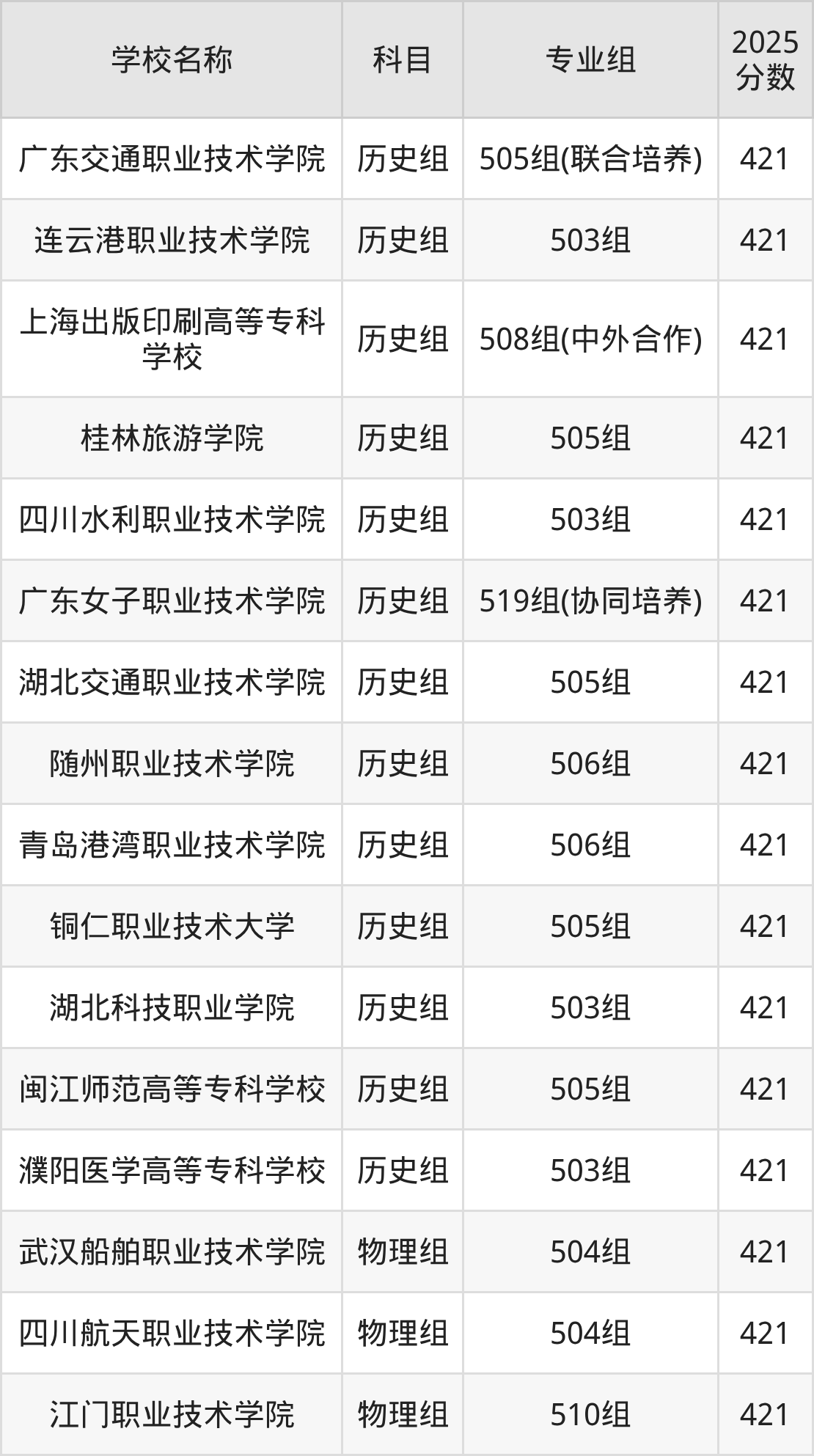 广东高考录取分数线在421分左右的公办院校专业组一共有18个,其中历史组有:广东交通职业技术学院(421分)、连云港职业技术学院(421分)、上海出版印刷高等专科学校(421分),物理组有:武汉船舶职业技术学院(421分)、四川航天职业技术学院(421分)、江门职业技术学院(421分)。