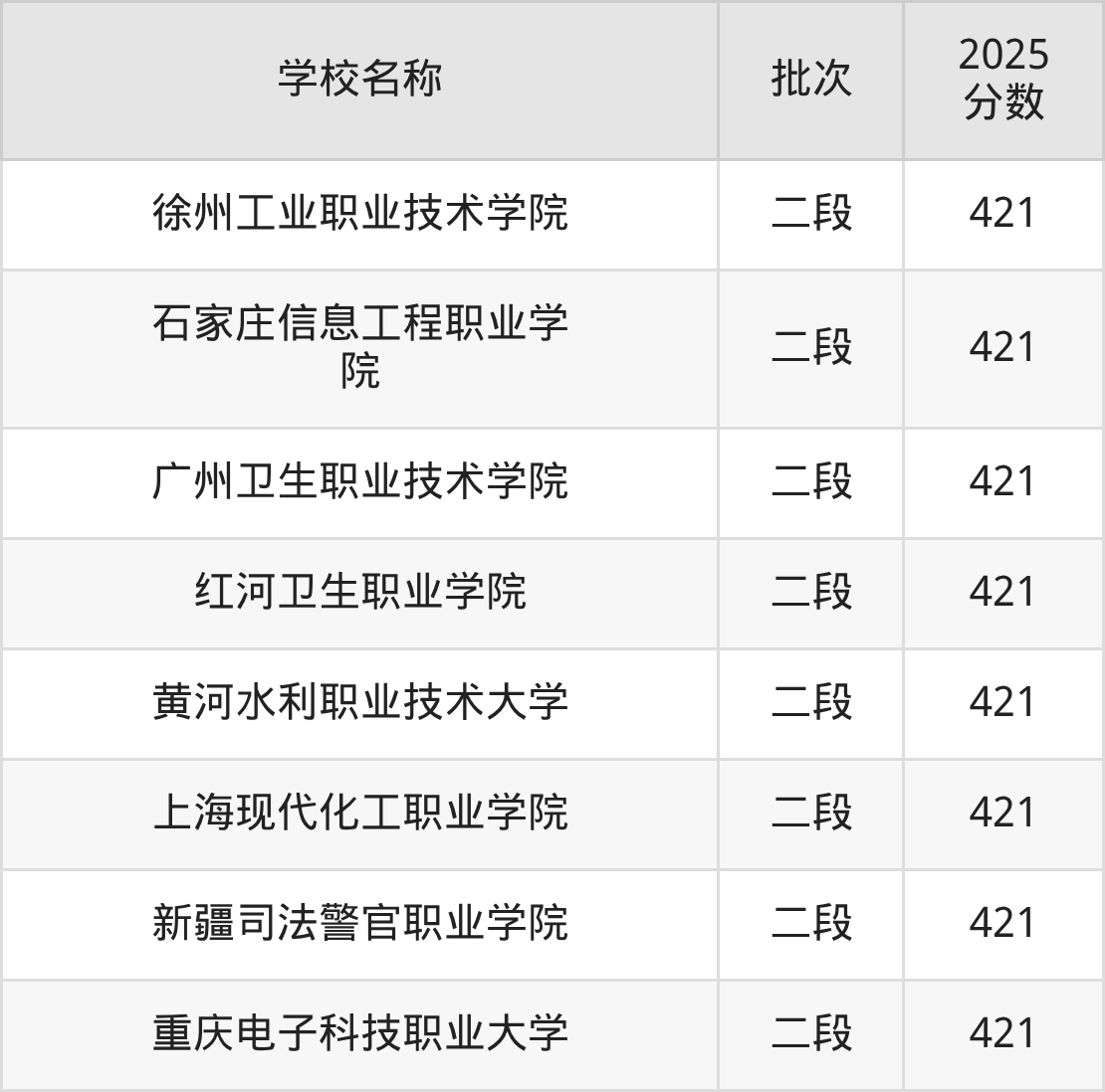 山东高考录取分数线在421分左右的公办大学一共有8所。分别是徐州工业职业技术学院(421分)、石家庄信息工程职业学院(421分)、广州卫生职业技术学院(421分)