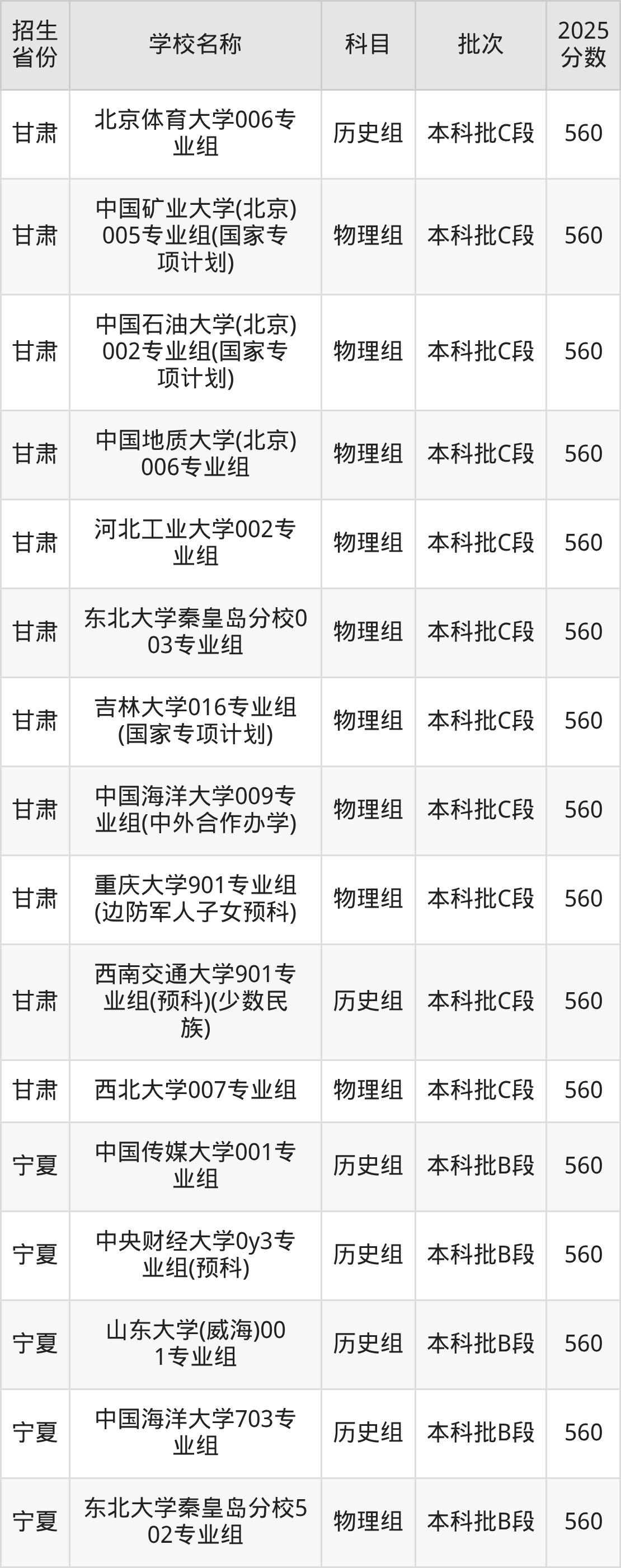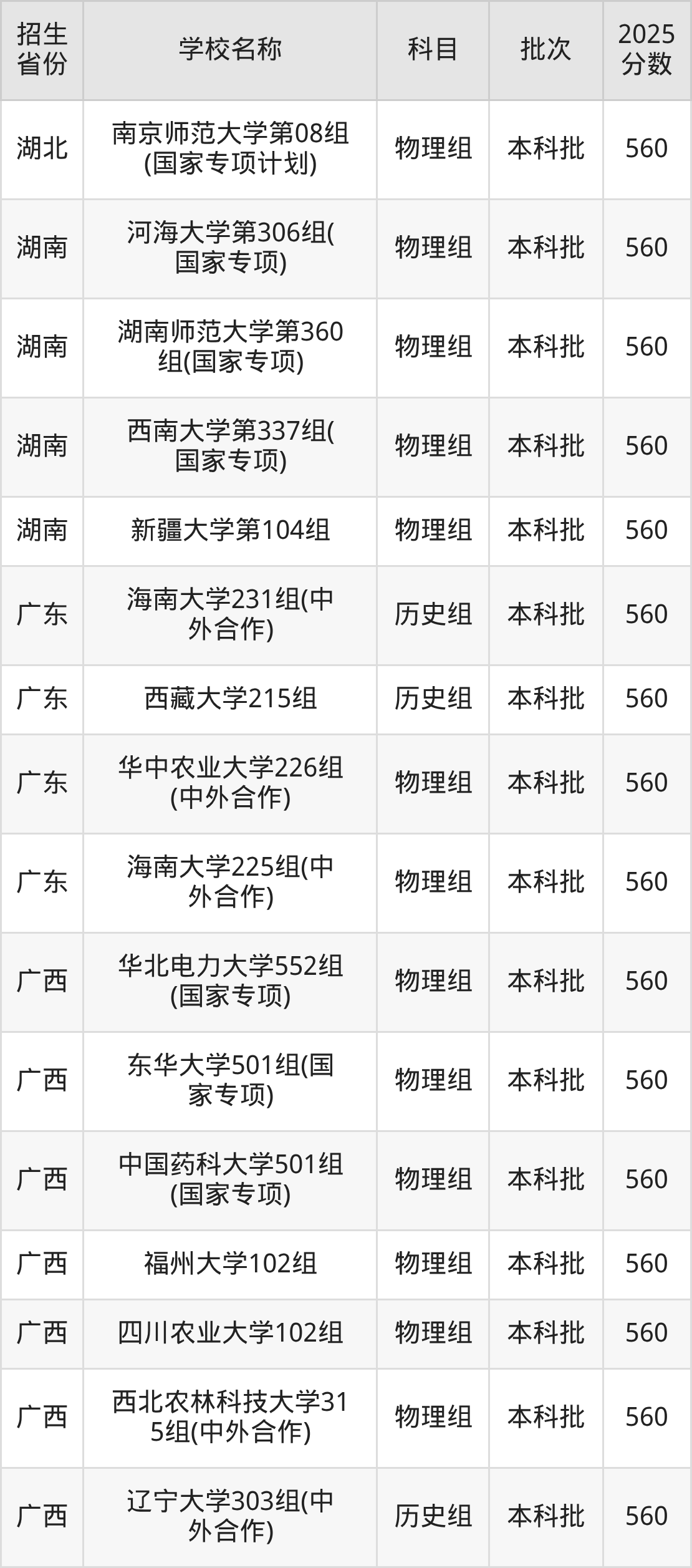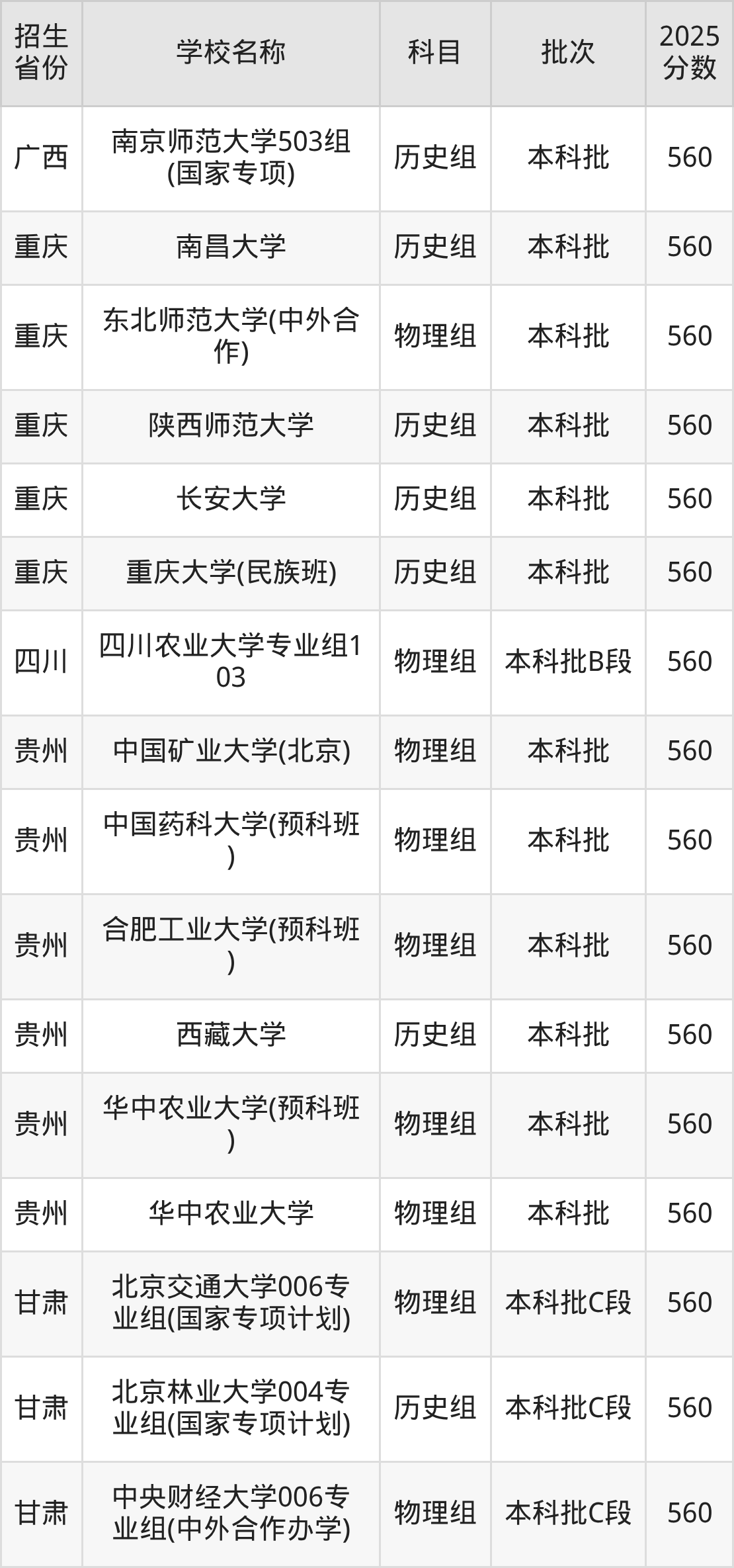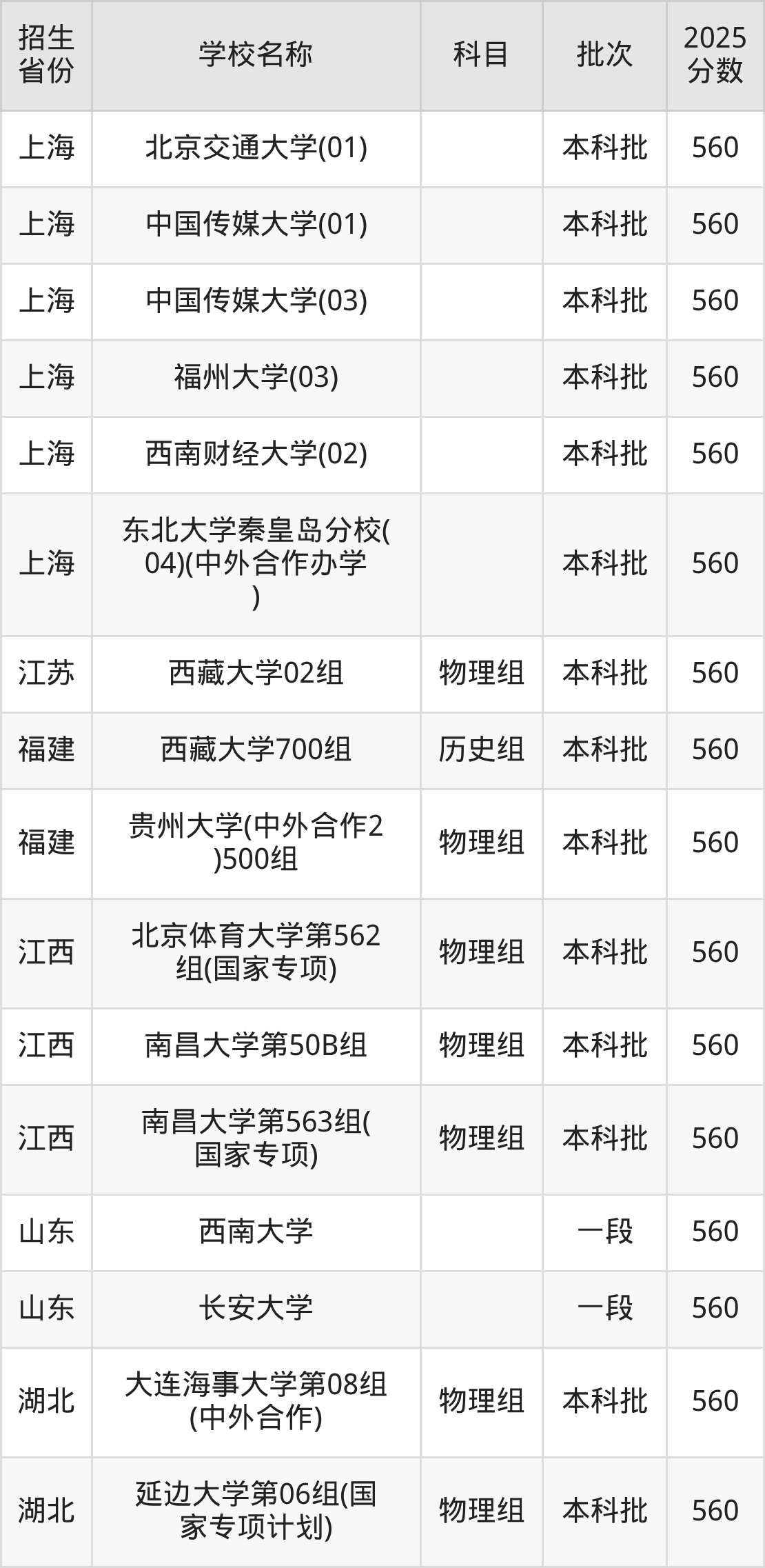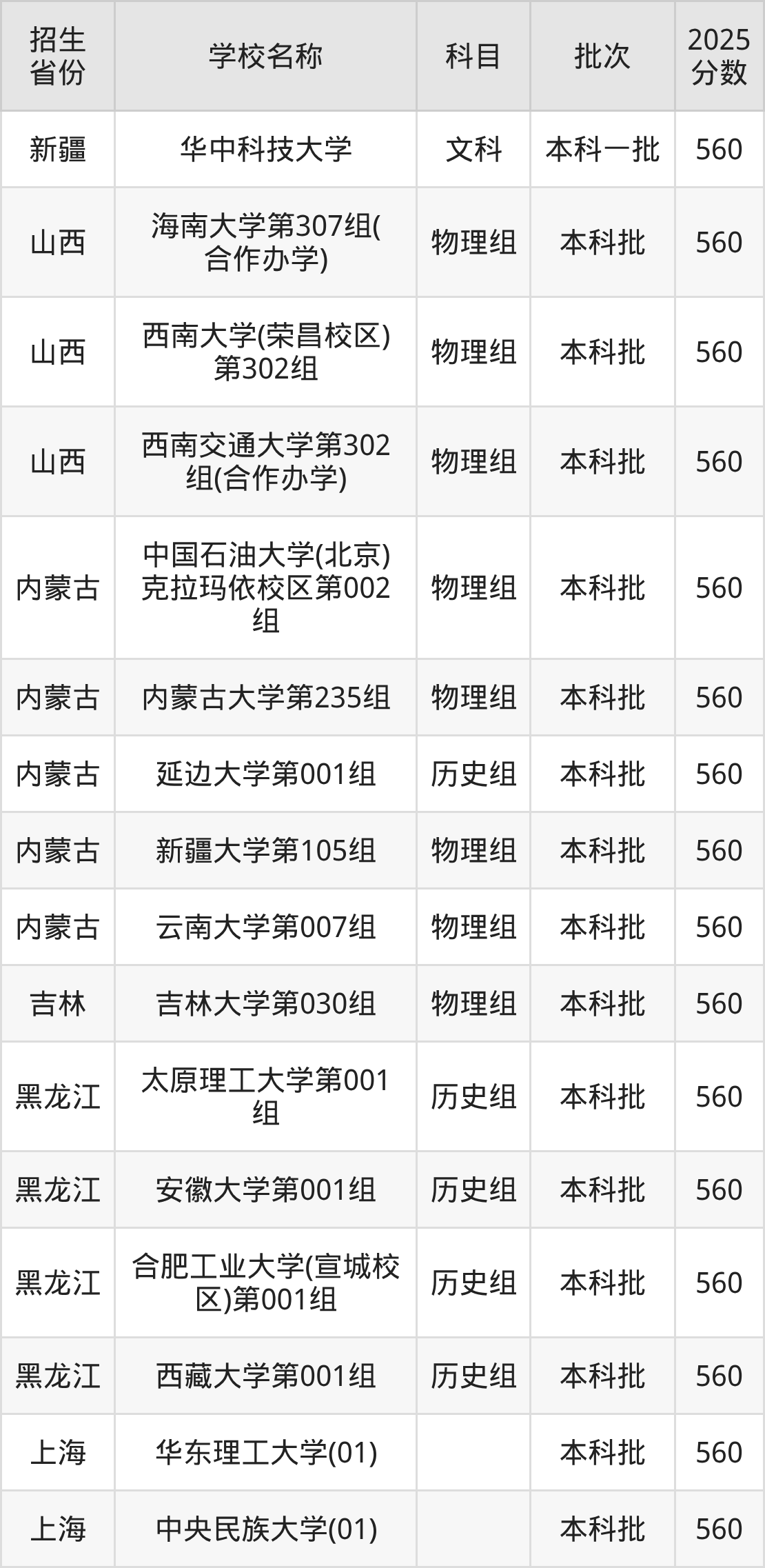 筛选全国各省2025年录取分数线为560分的211大学如下: