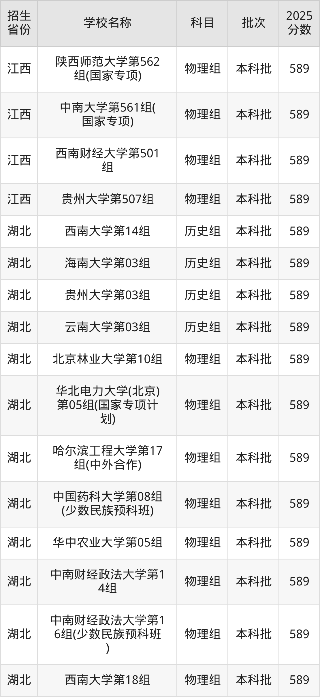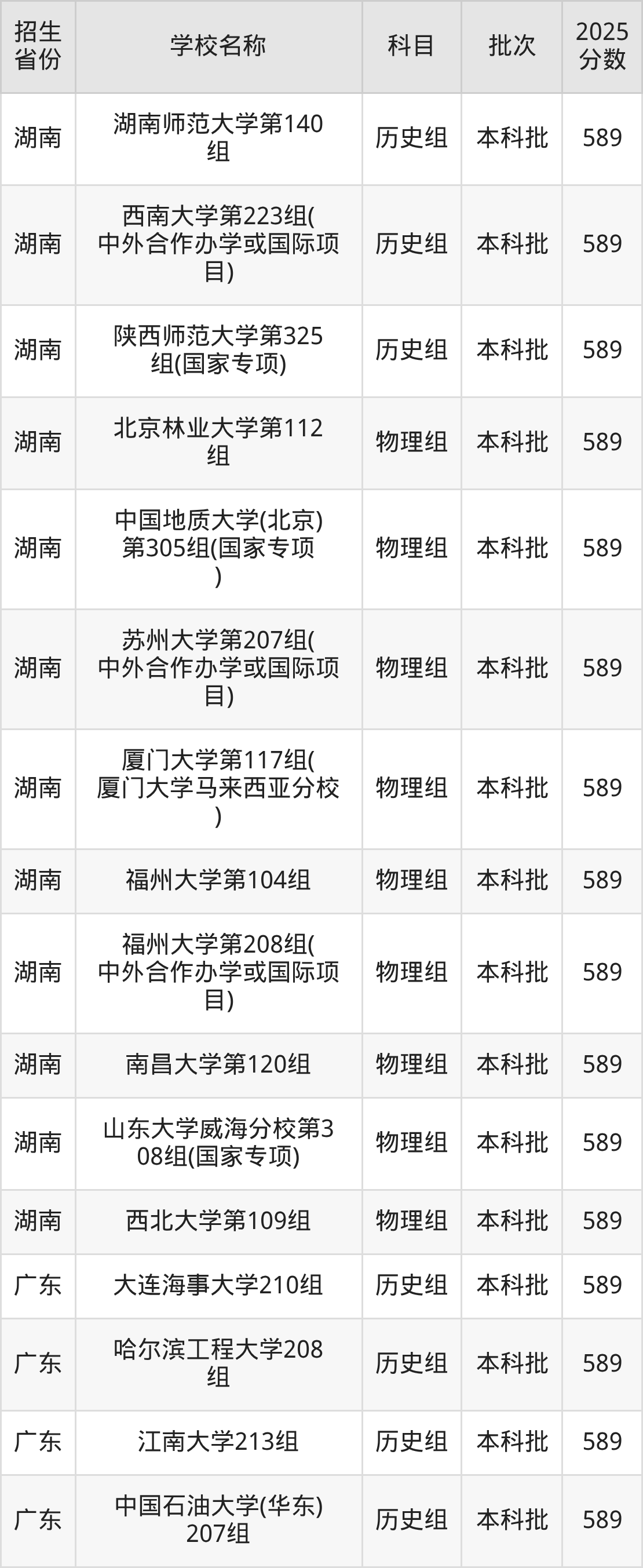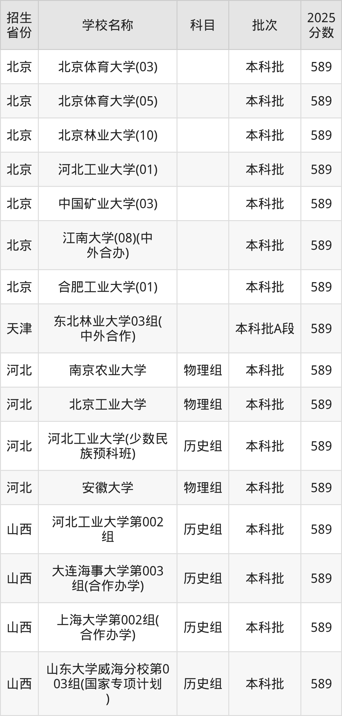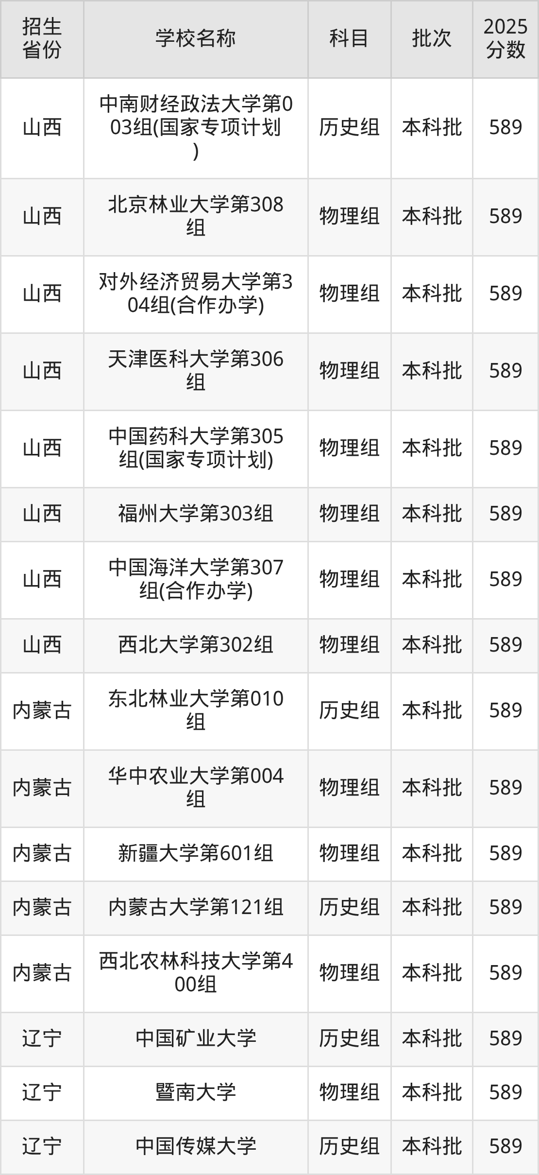筛选全国各省2025年录取分数线为589分的211大学如下: