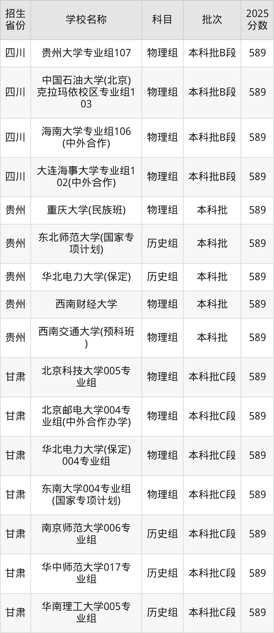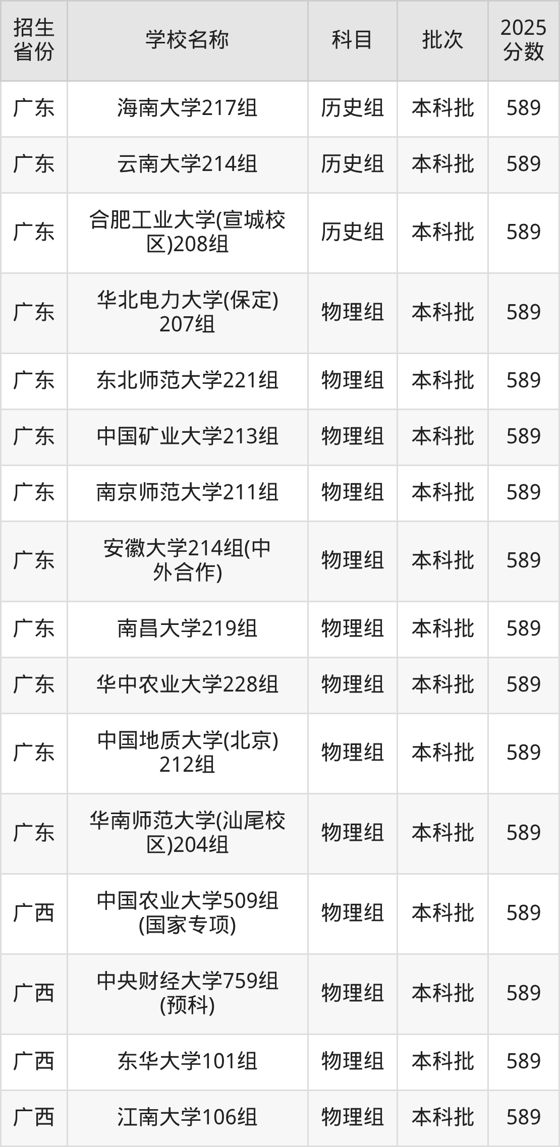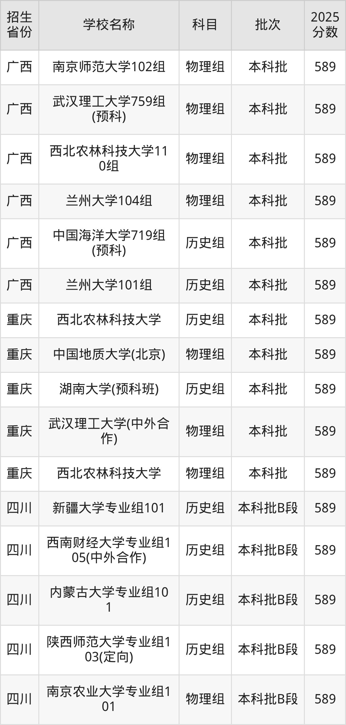 筛选全国各省2025年录取分数线为589分的211大学如下:
