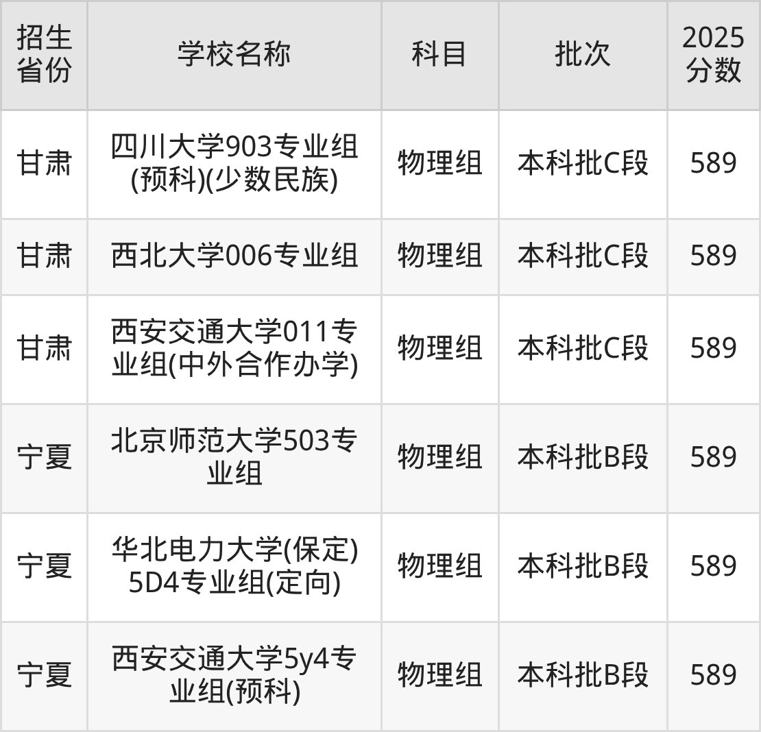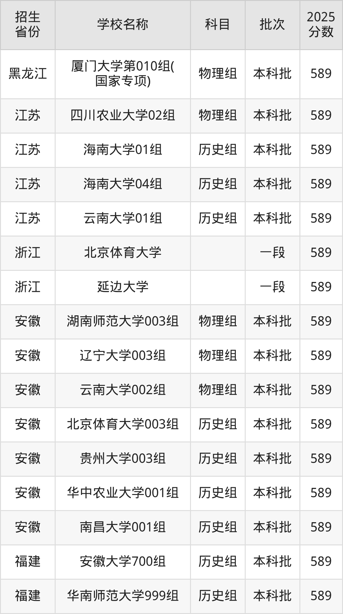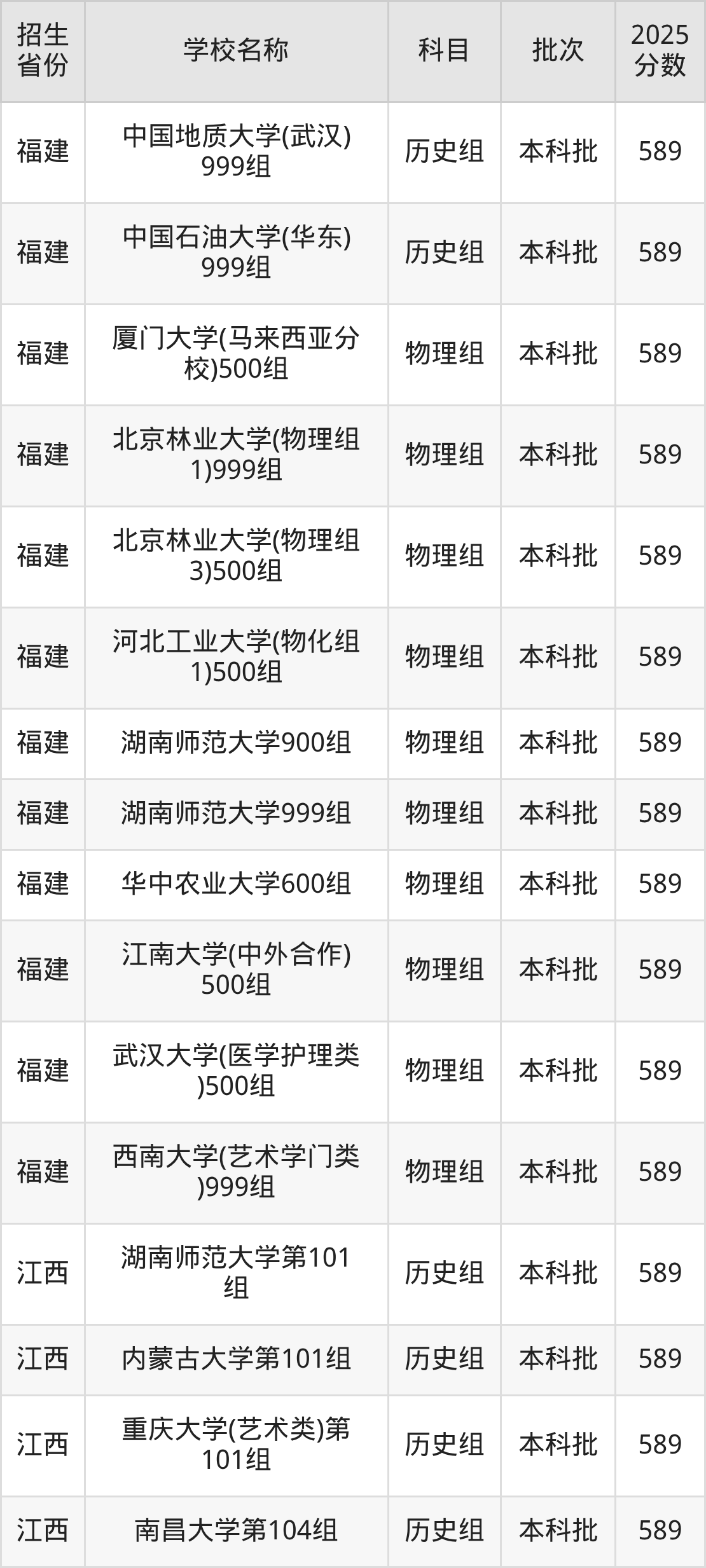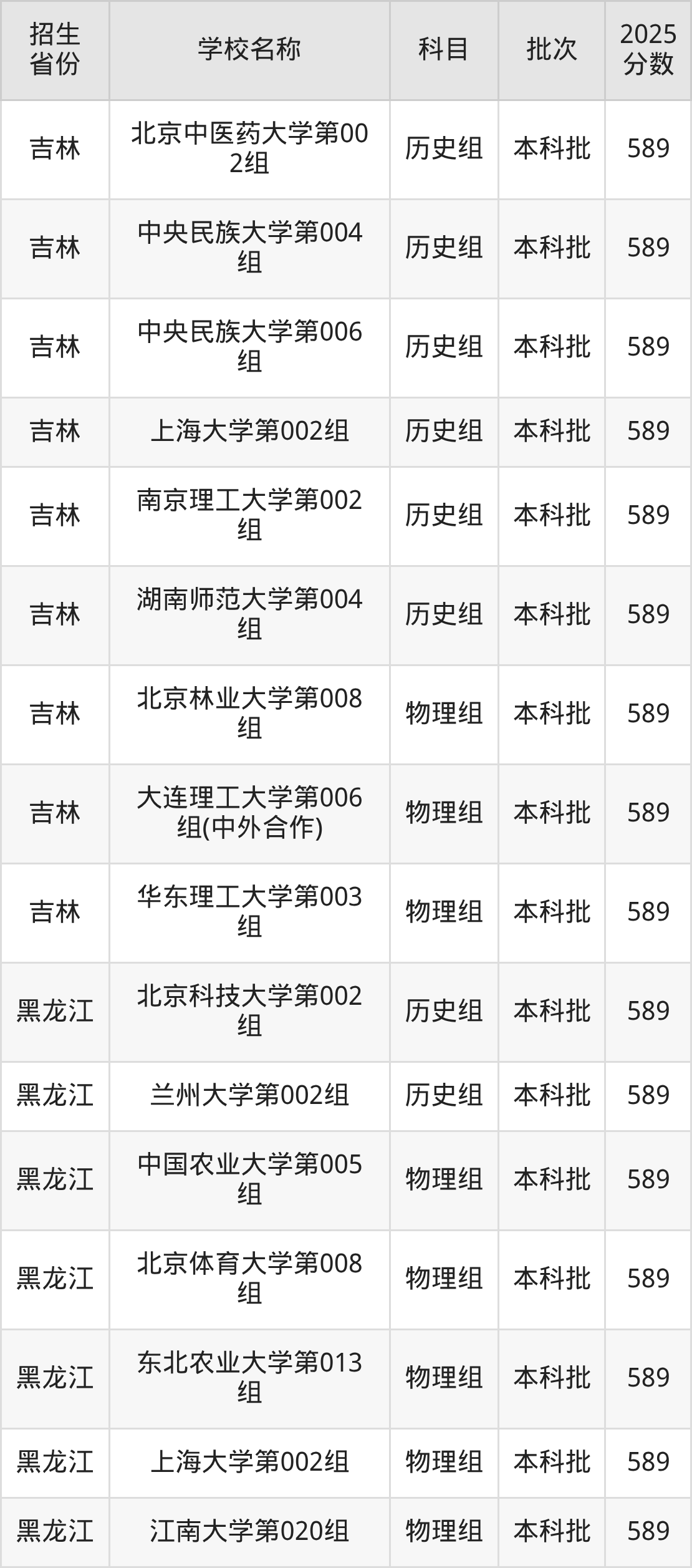 筛选全国各省2025年录取分数线为589分的211大学如下: