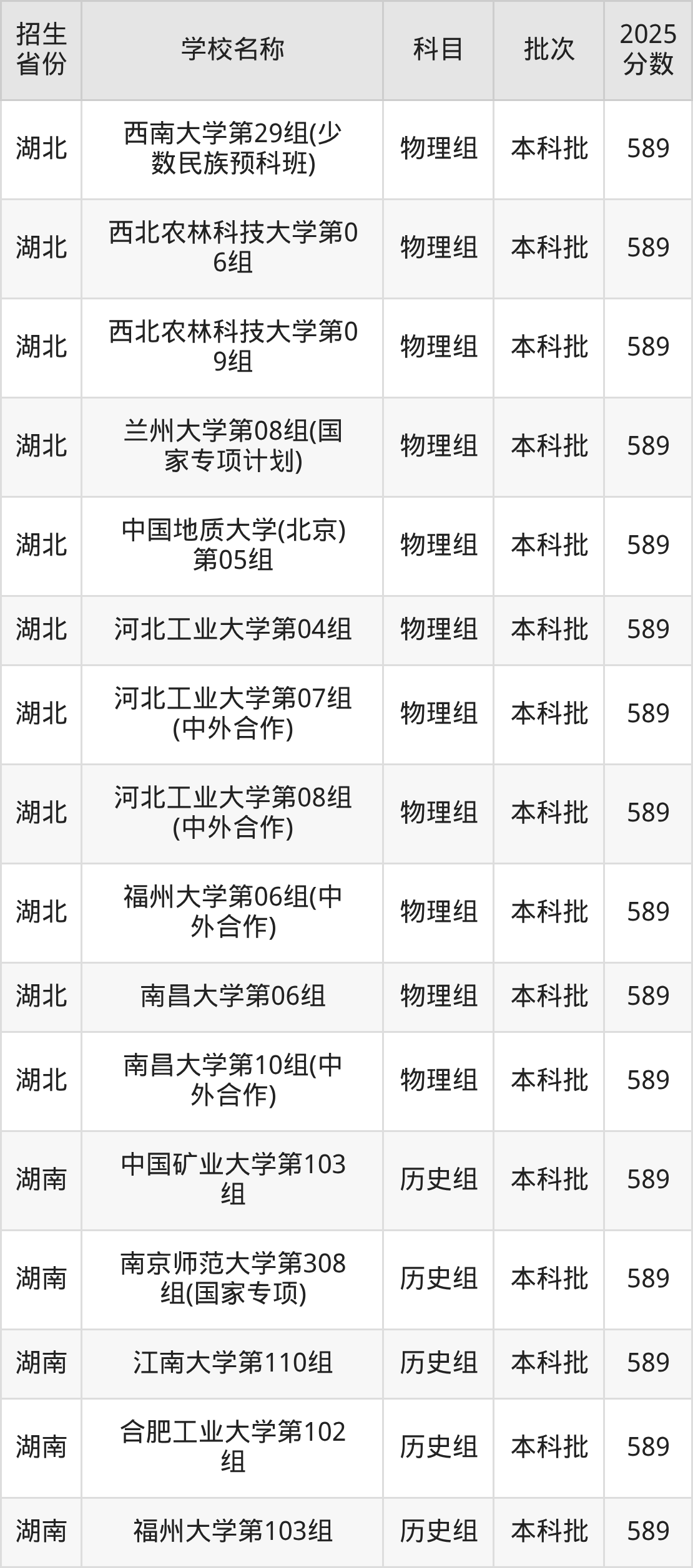湖北省历史组分数线是589分的211大学有:西南大学、海南大学、贵州大学、云南大学。