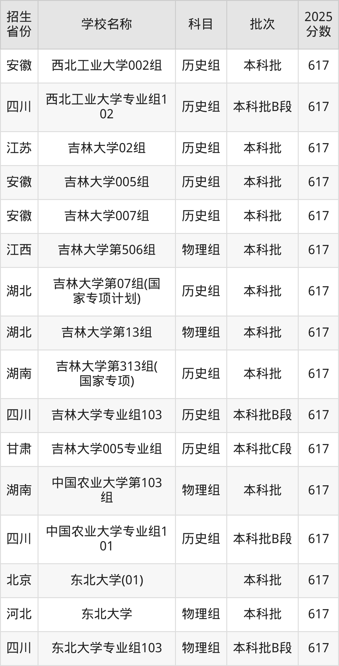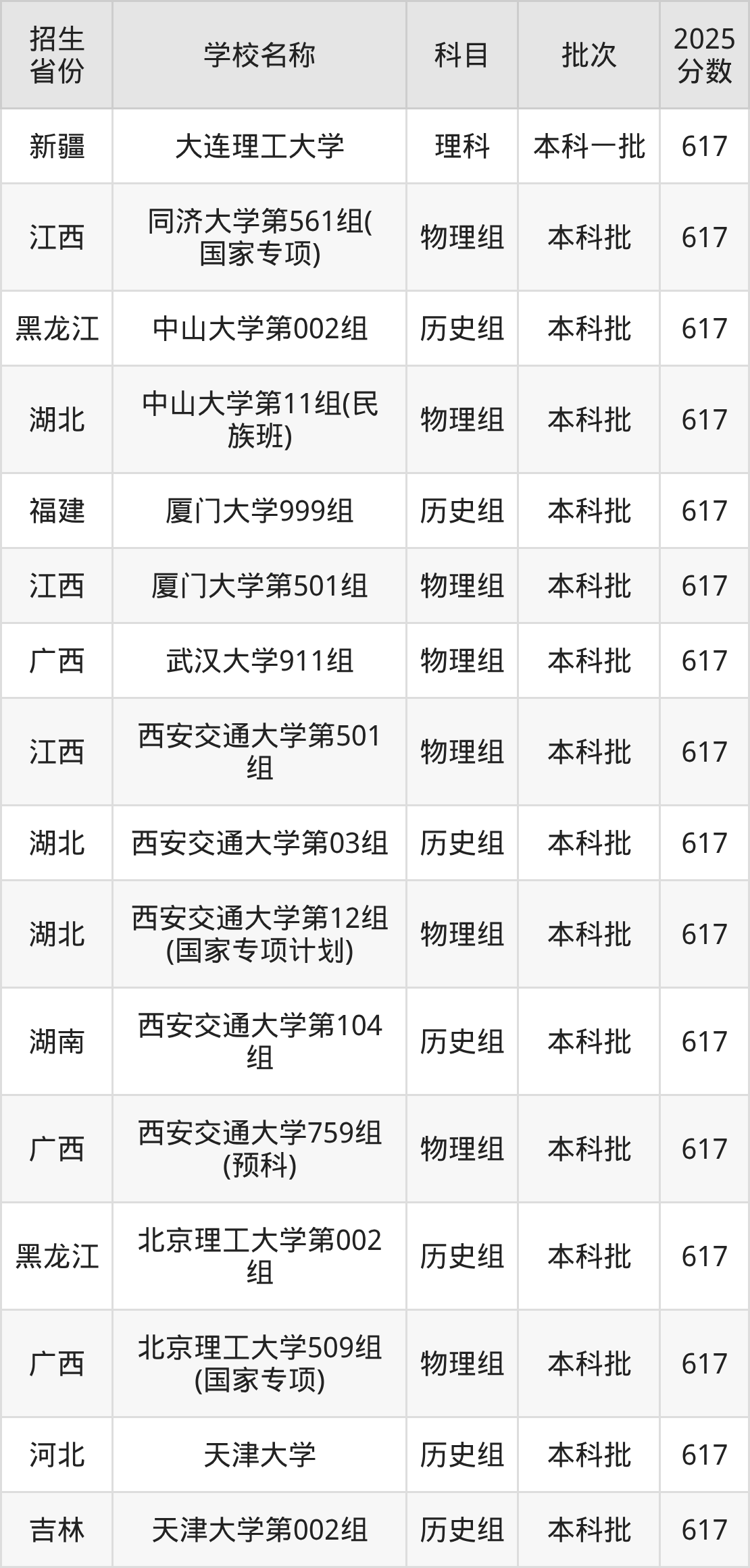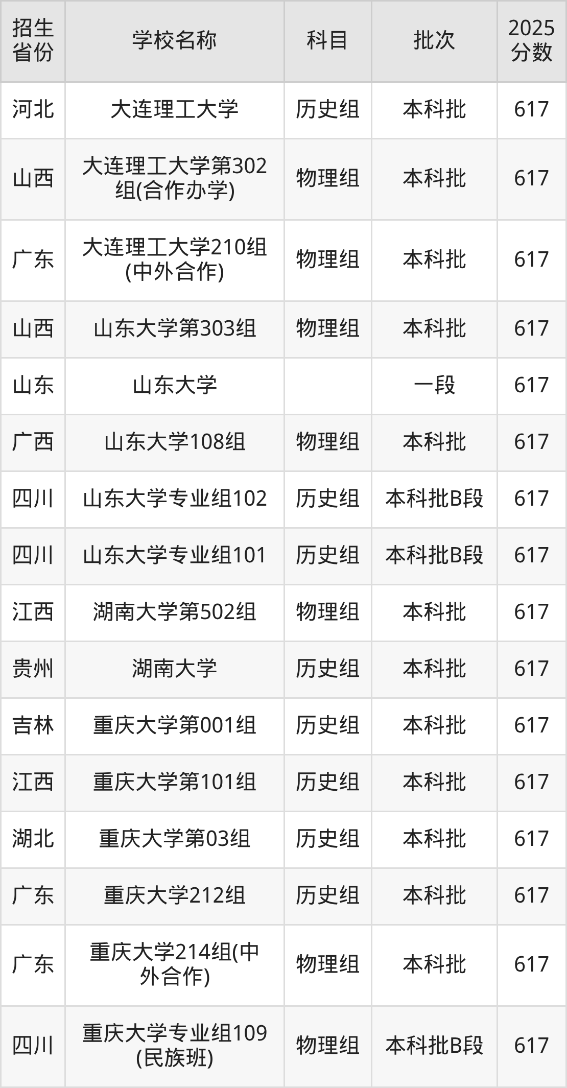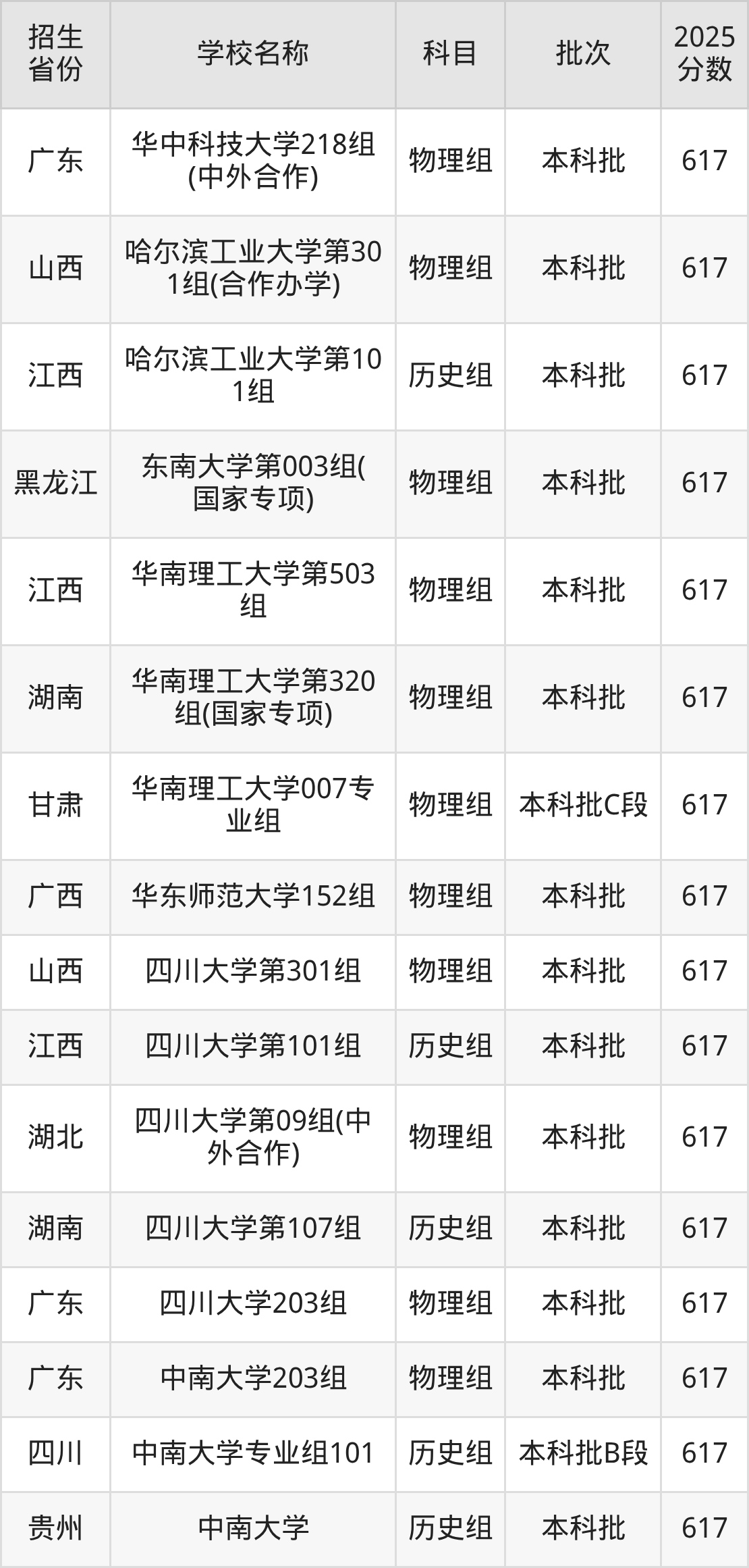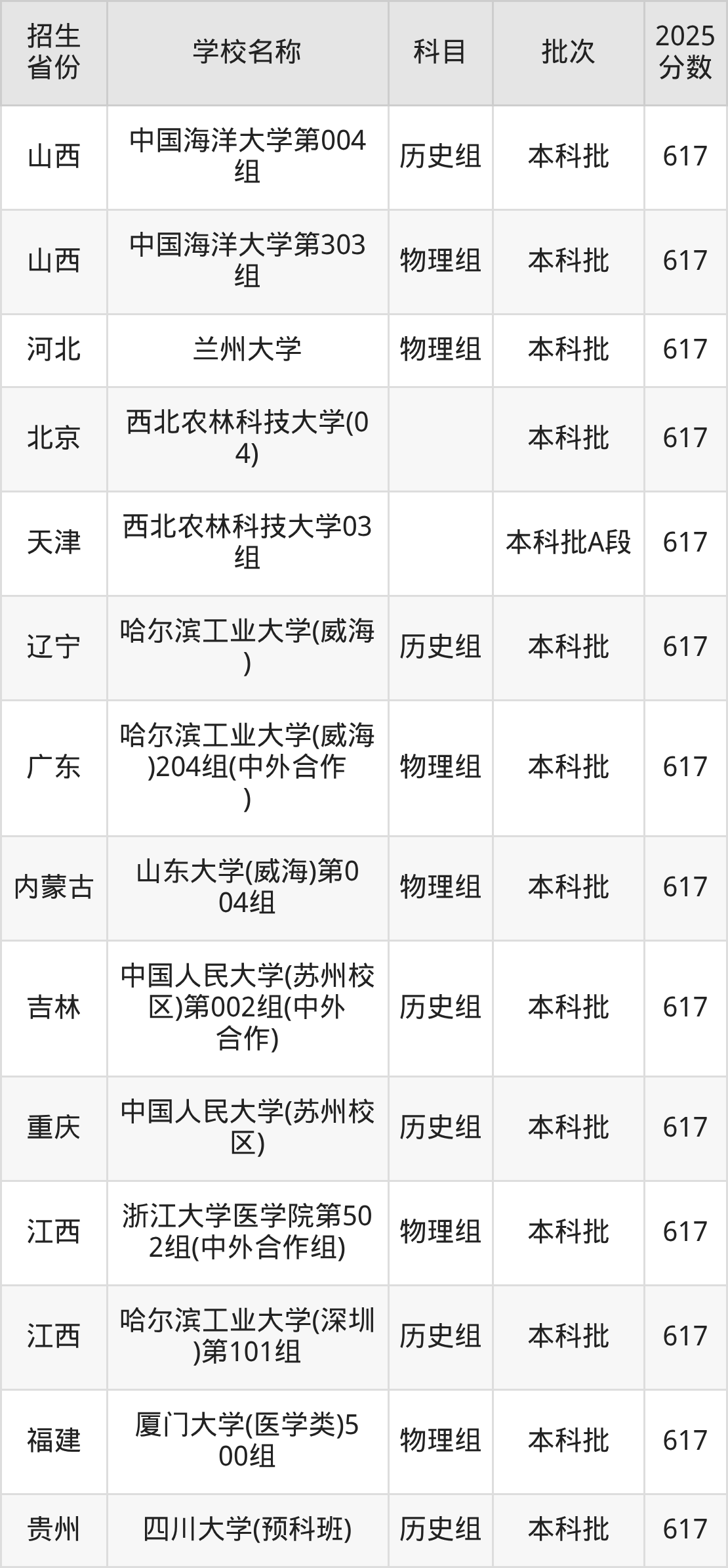 筛选全国各省2025年录取分数线为617分的985大学如下: