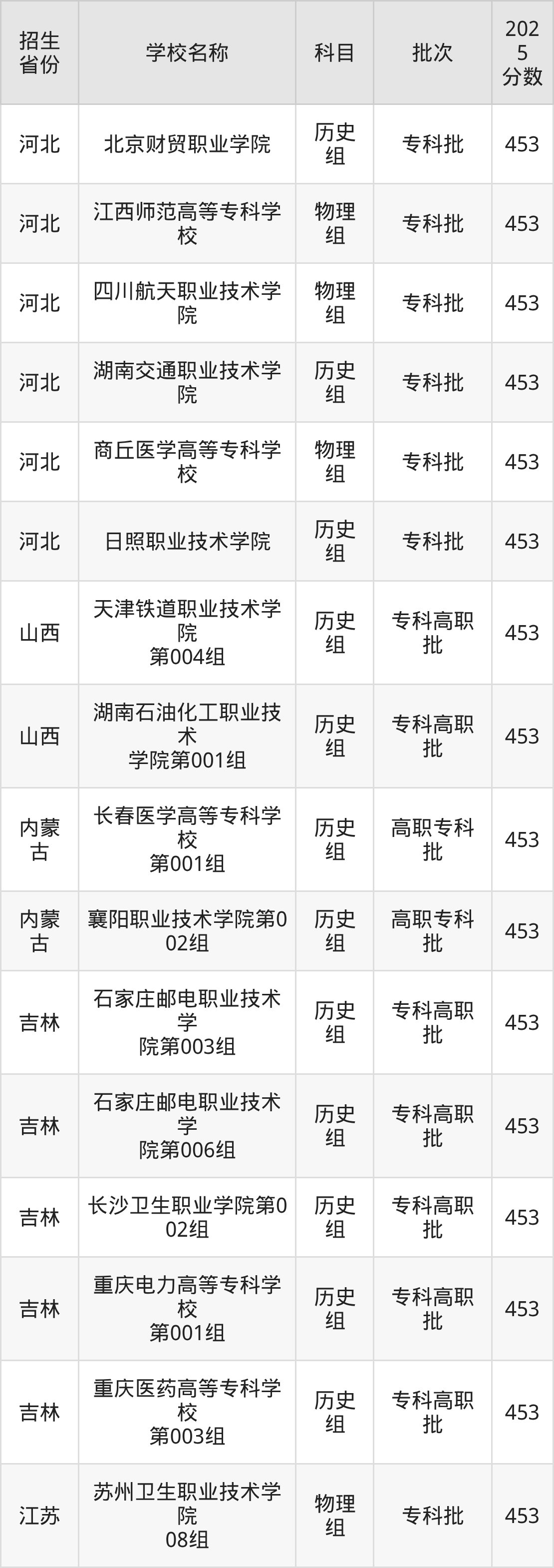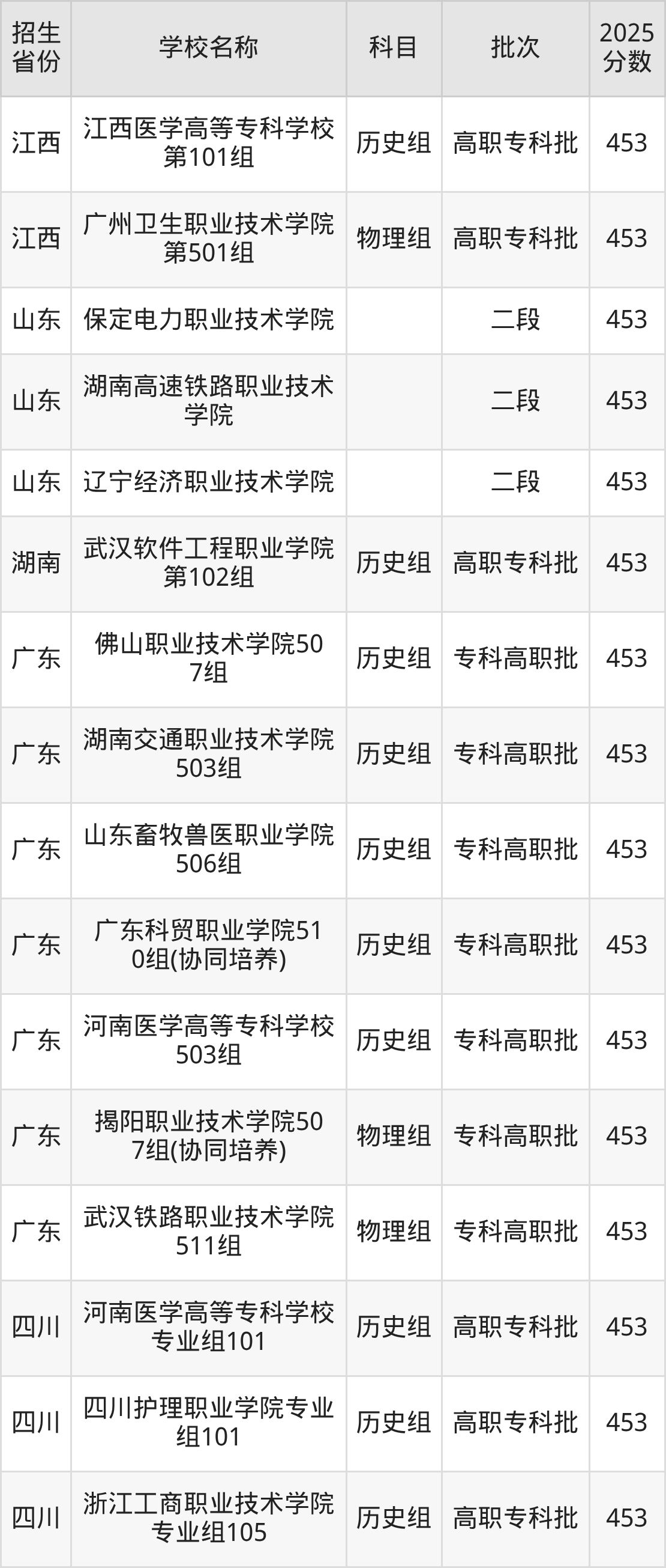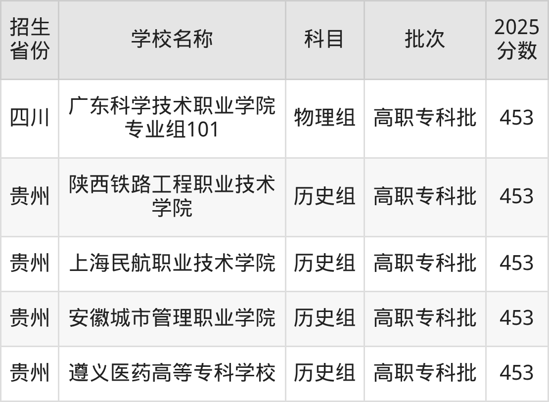 筛选全国各省2025年录取分数线为453分的公办专科大学如下:
