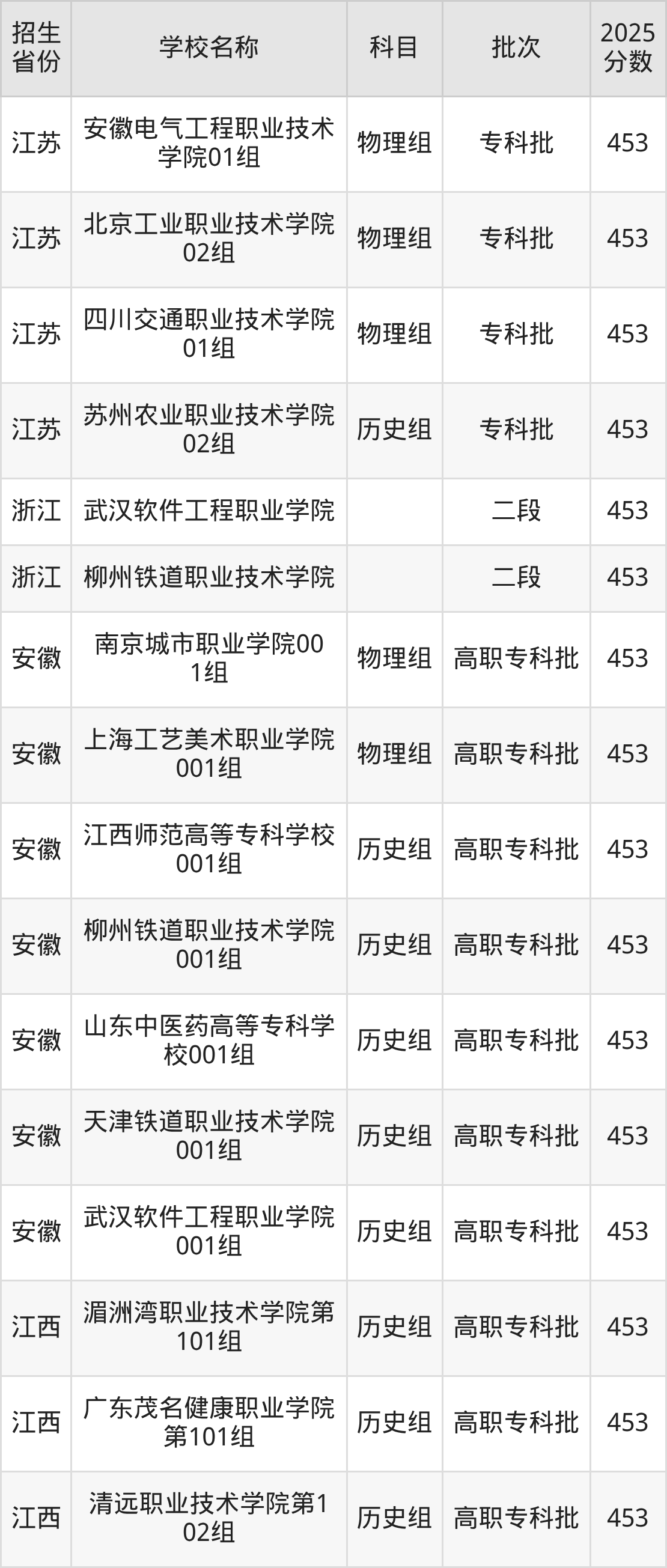 安徽省历史组分数线是453分的公办专科大学有:江西师范高等专科学校、柳州铁道职业技术学院、山东中医药高等专科学校、天津铁道职业技术学院、武汉软件工程职业学院。