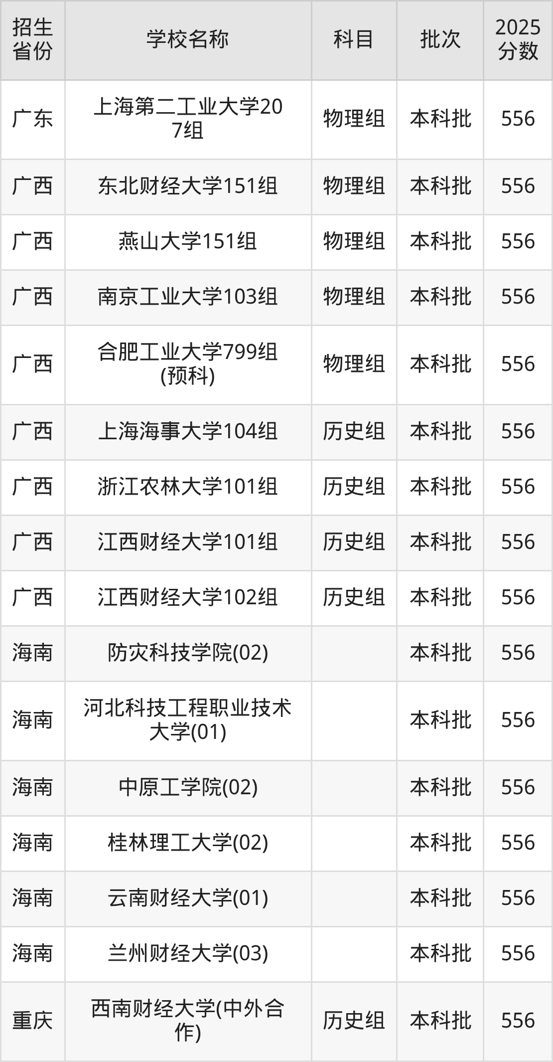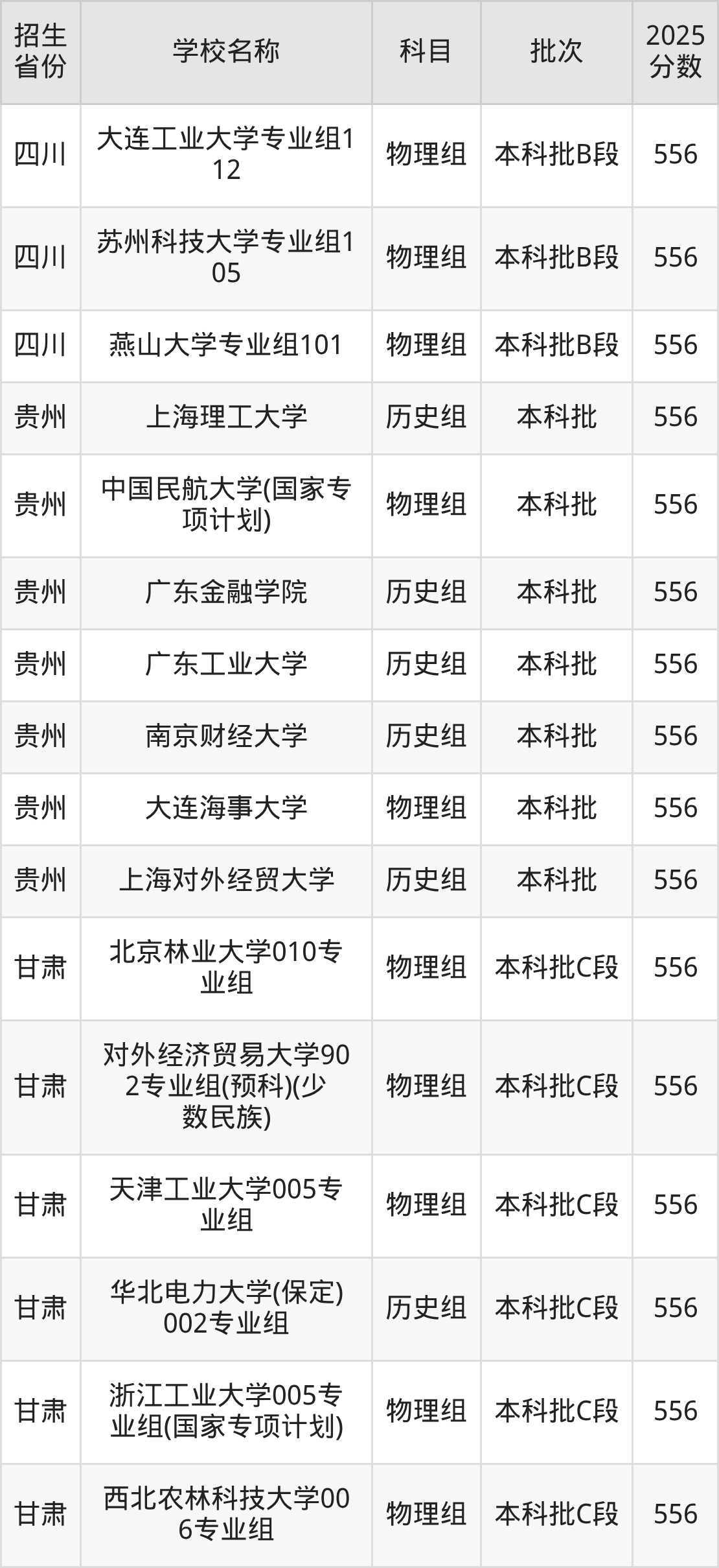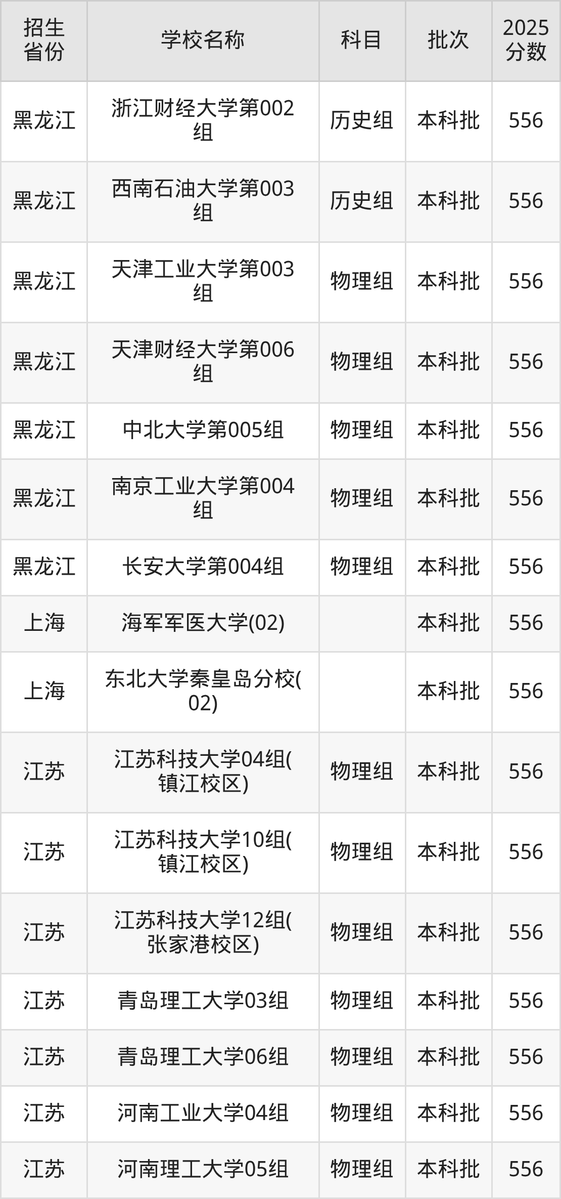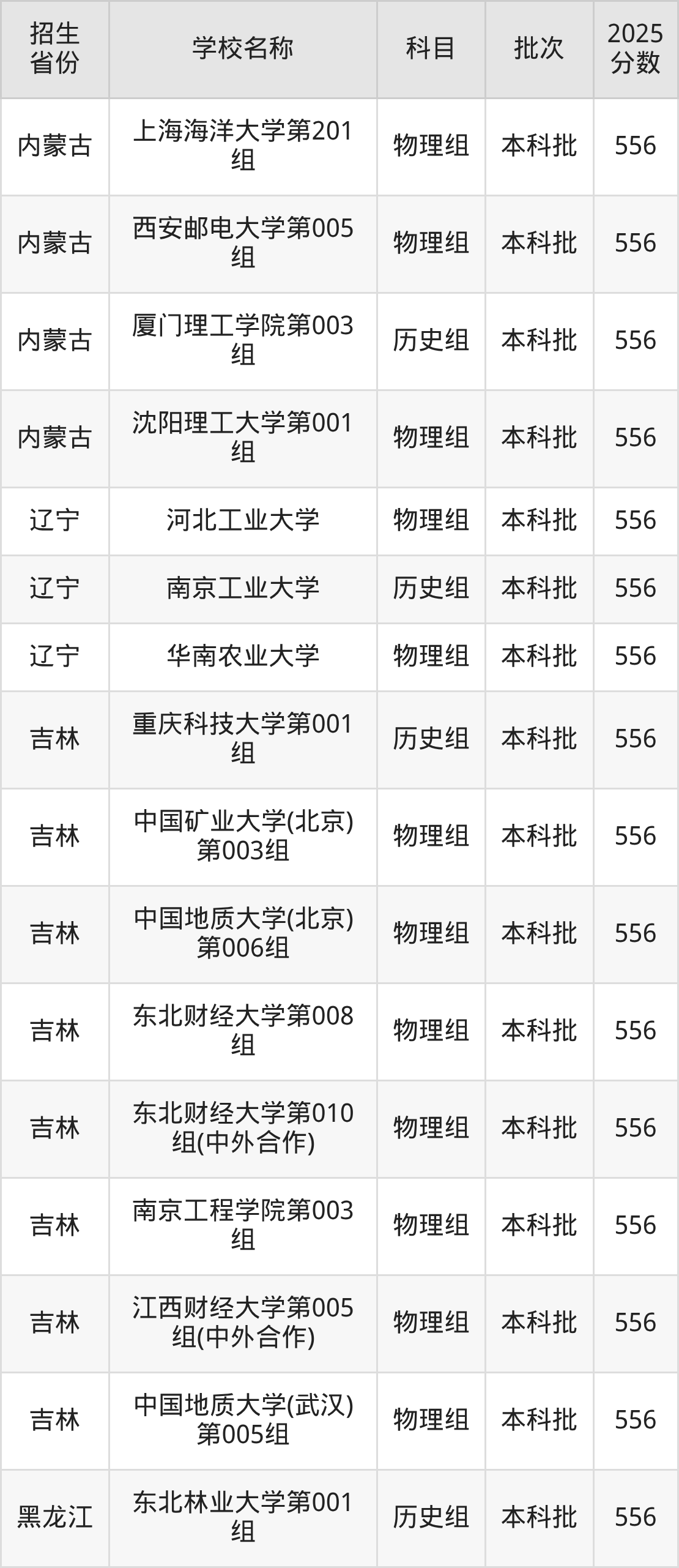 筛选全国各省2025年录取分数线为556分的理科大学如下:
