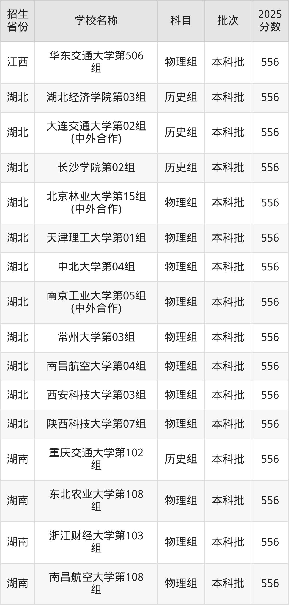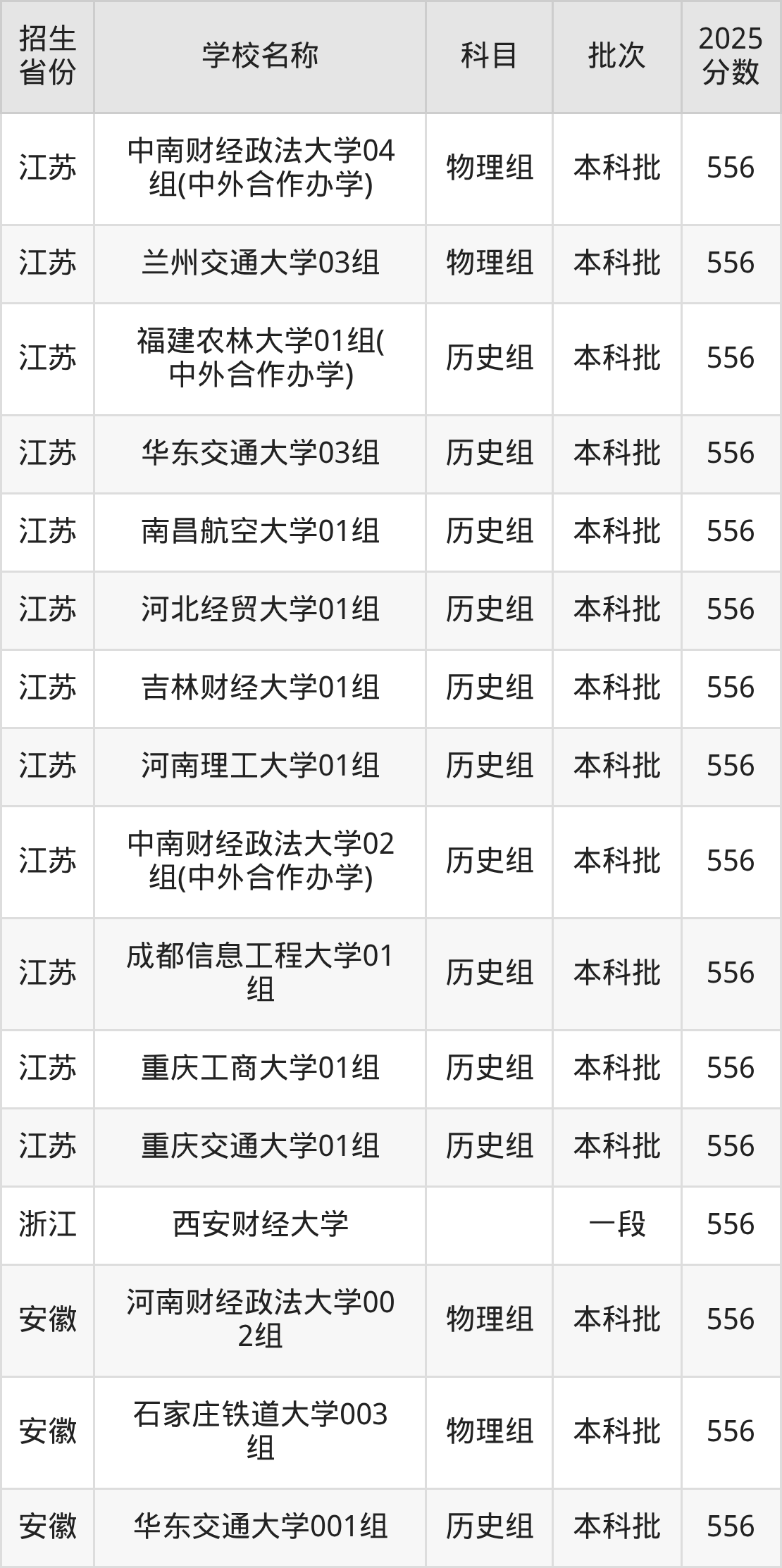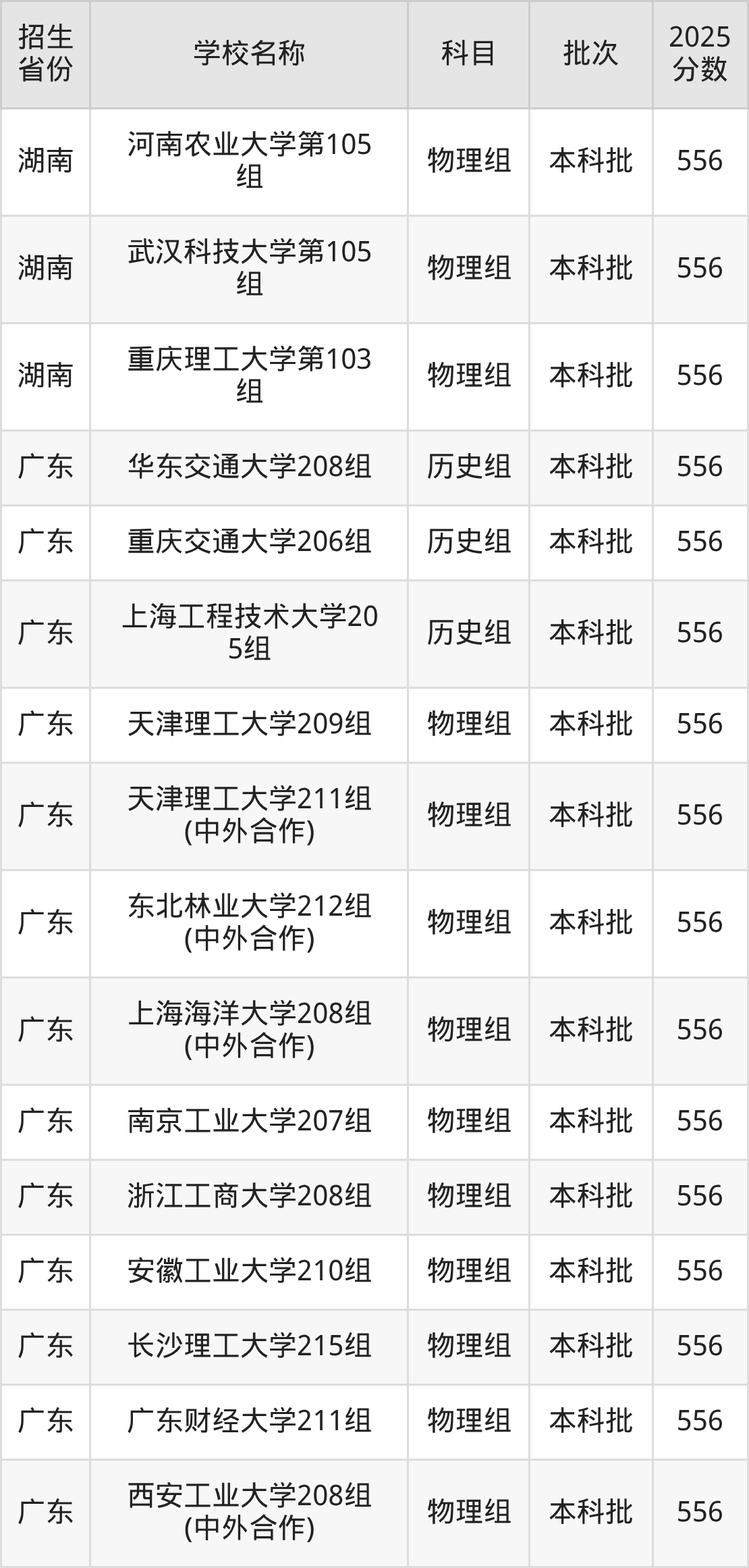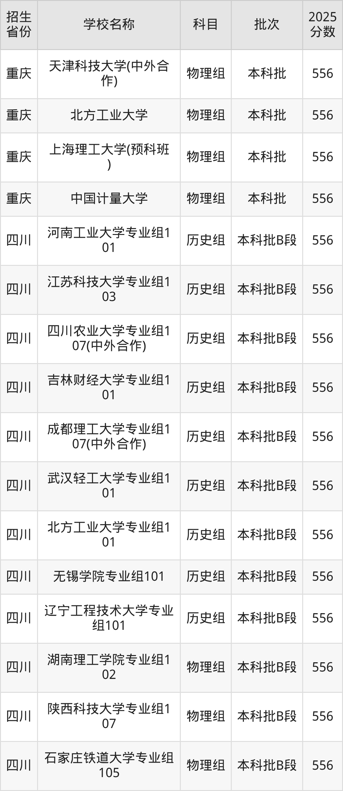 筛选全国各省2025年录取分数线为556分的理科大学如下:
