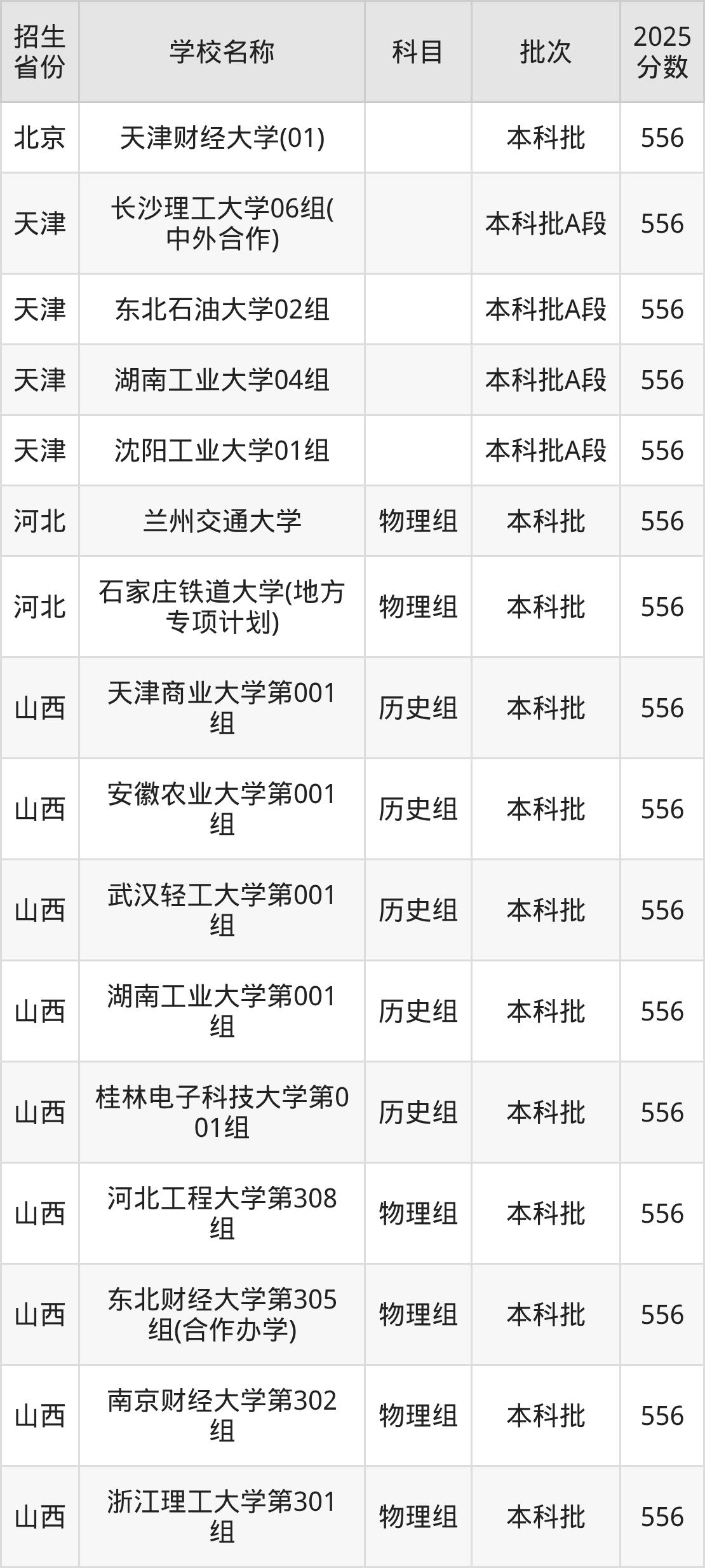 山西省物理组分数线是556分的理科大学有:河北工程大学、东北财经大学、南京财经大学、浙江理工大学。