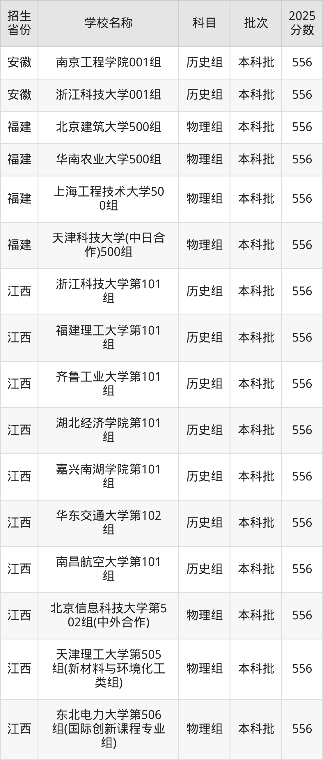 江西省历史组分数线是556分的理科大学有:浙江科技大学、福建理工大学、齐鲁工业大学、湖北经济学院、嘉兴南湖学院、华东交通大学、南昌航空大学。