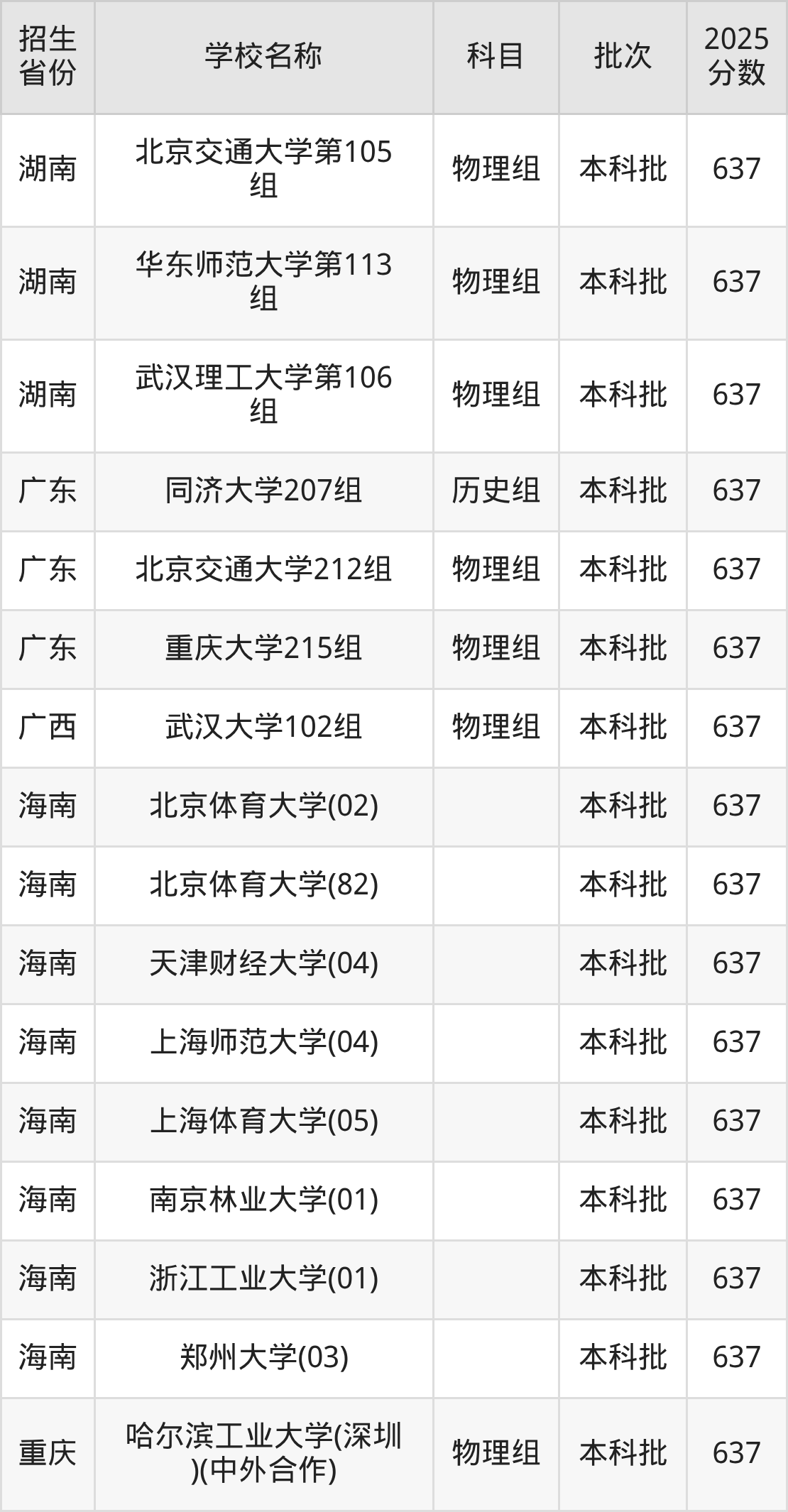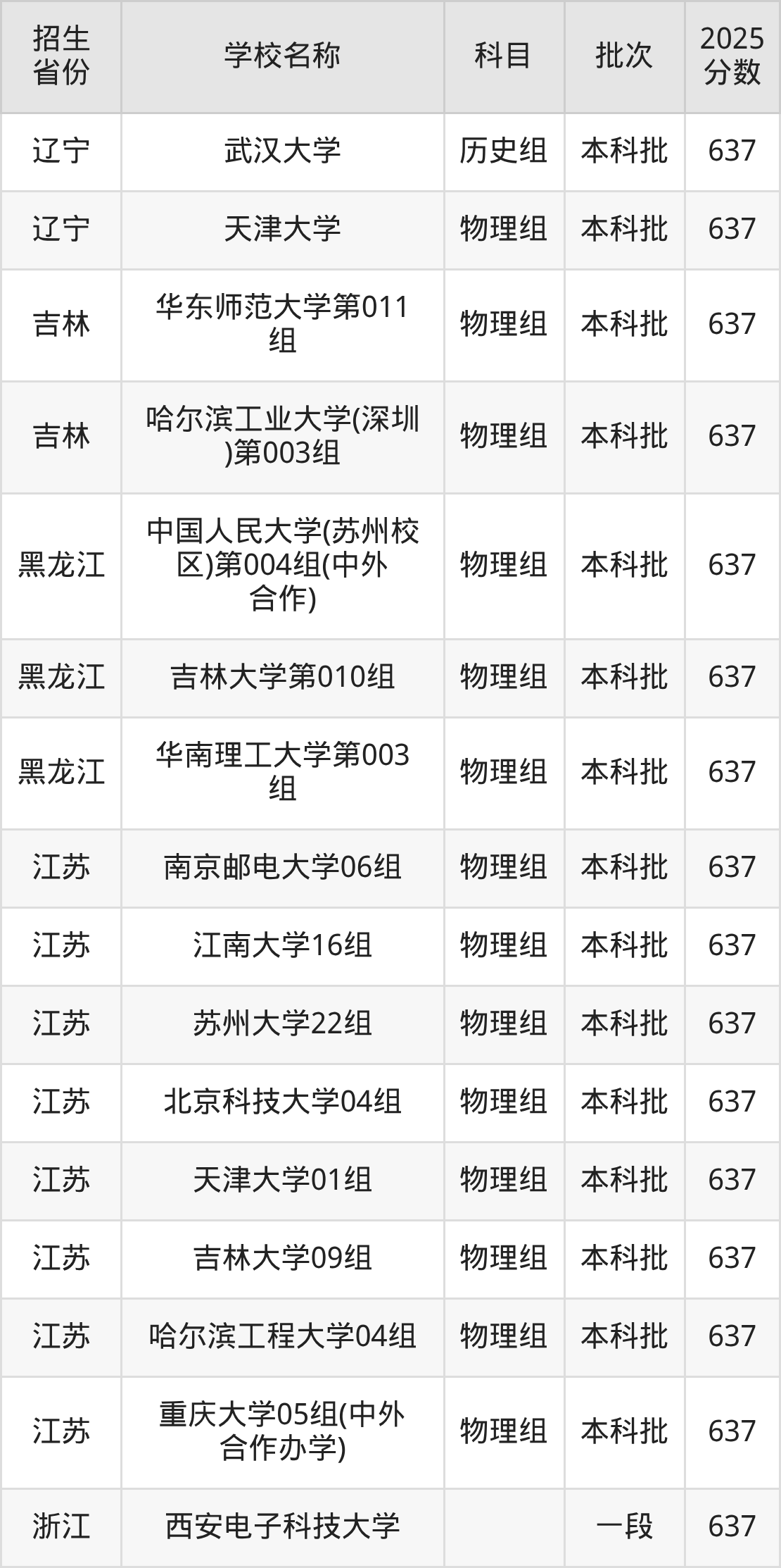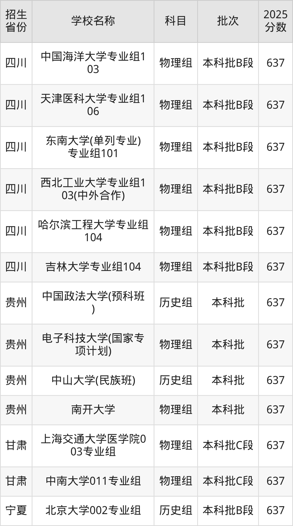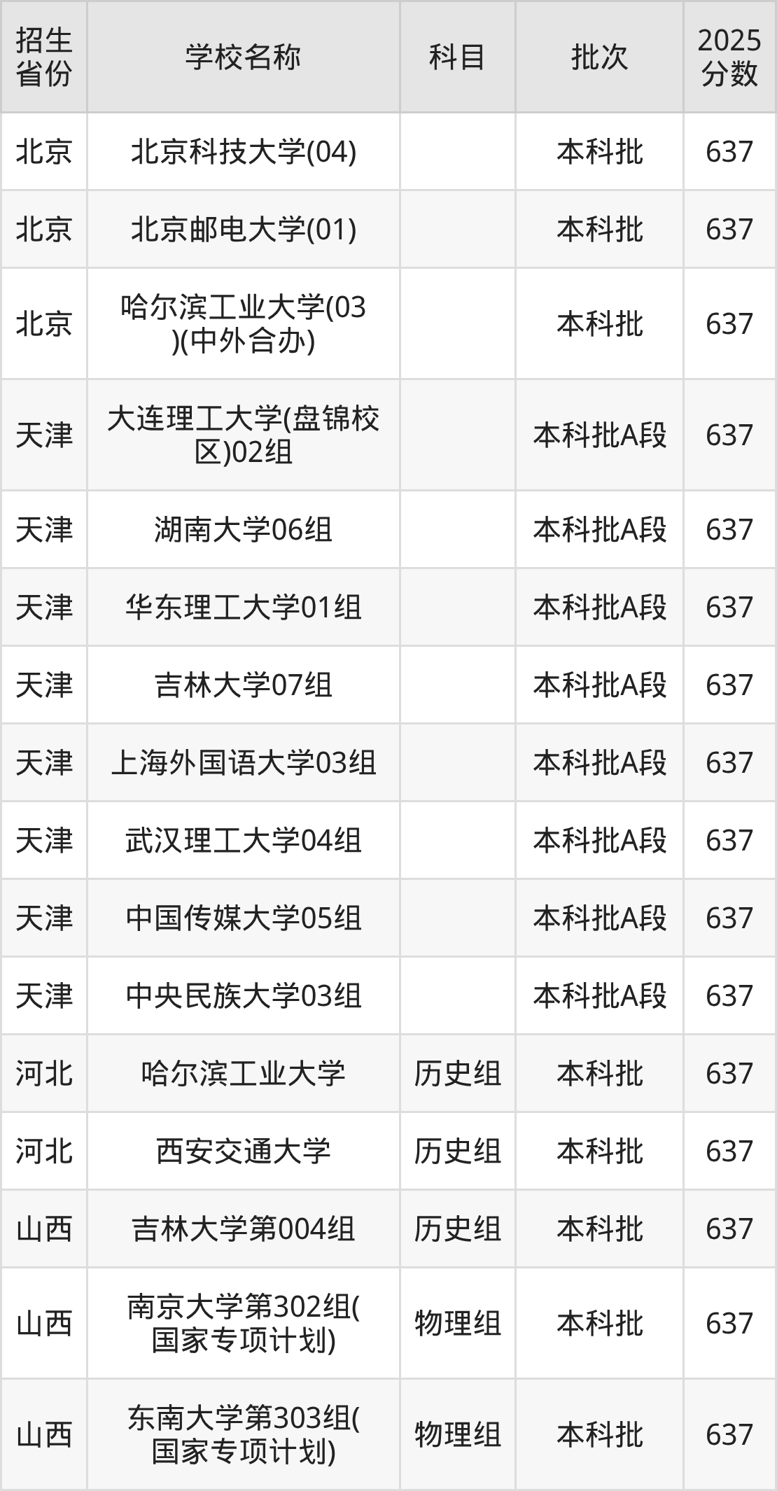 筛选全国各省2025年录取分数线为637分的重点大学如下:
