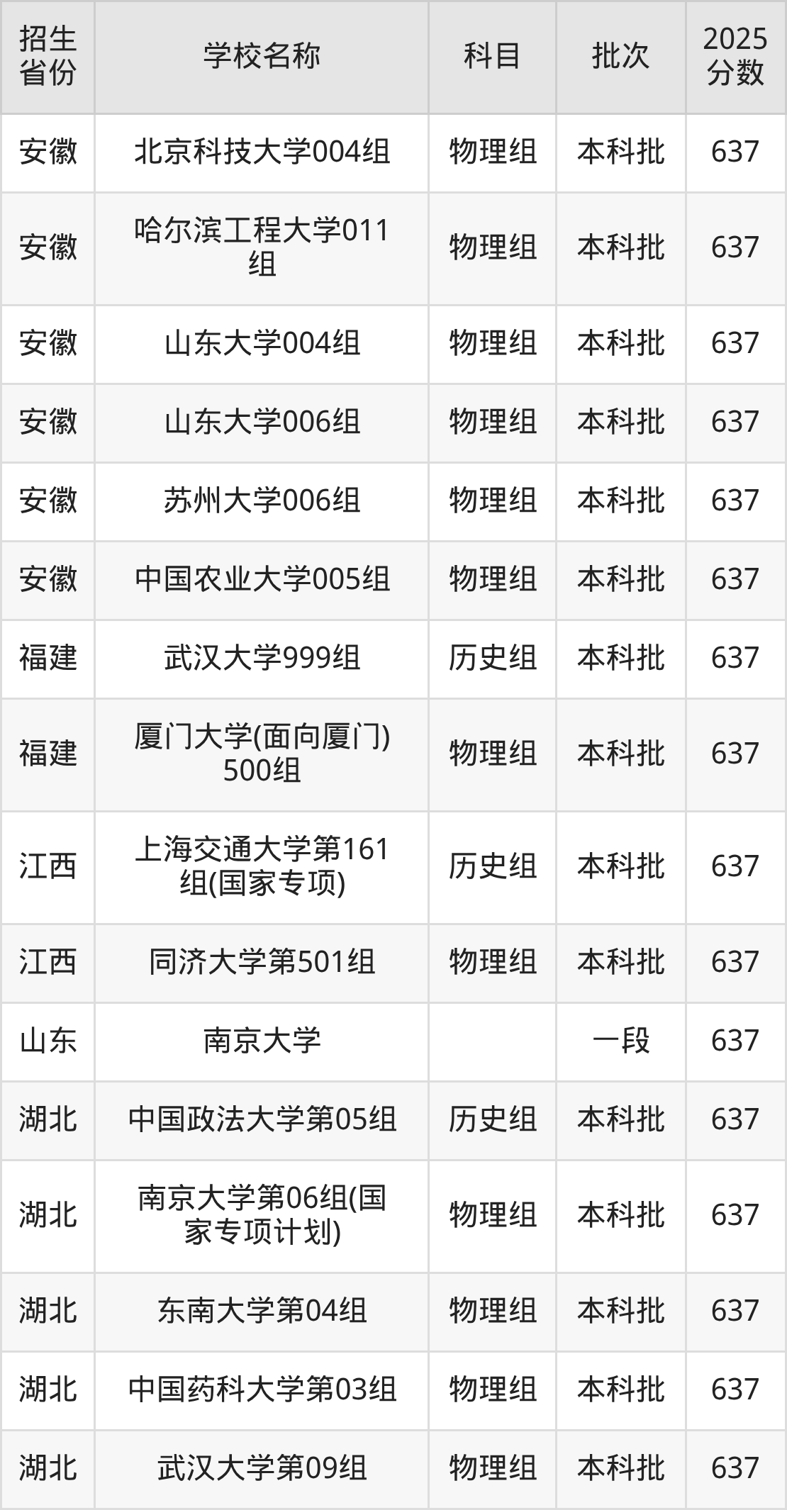 湖北省物理组分数线是637分的重点大学有:南京大学、东南大学、中国药科大学、武汉大学。