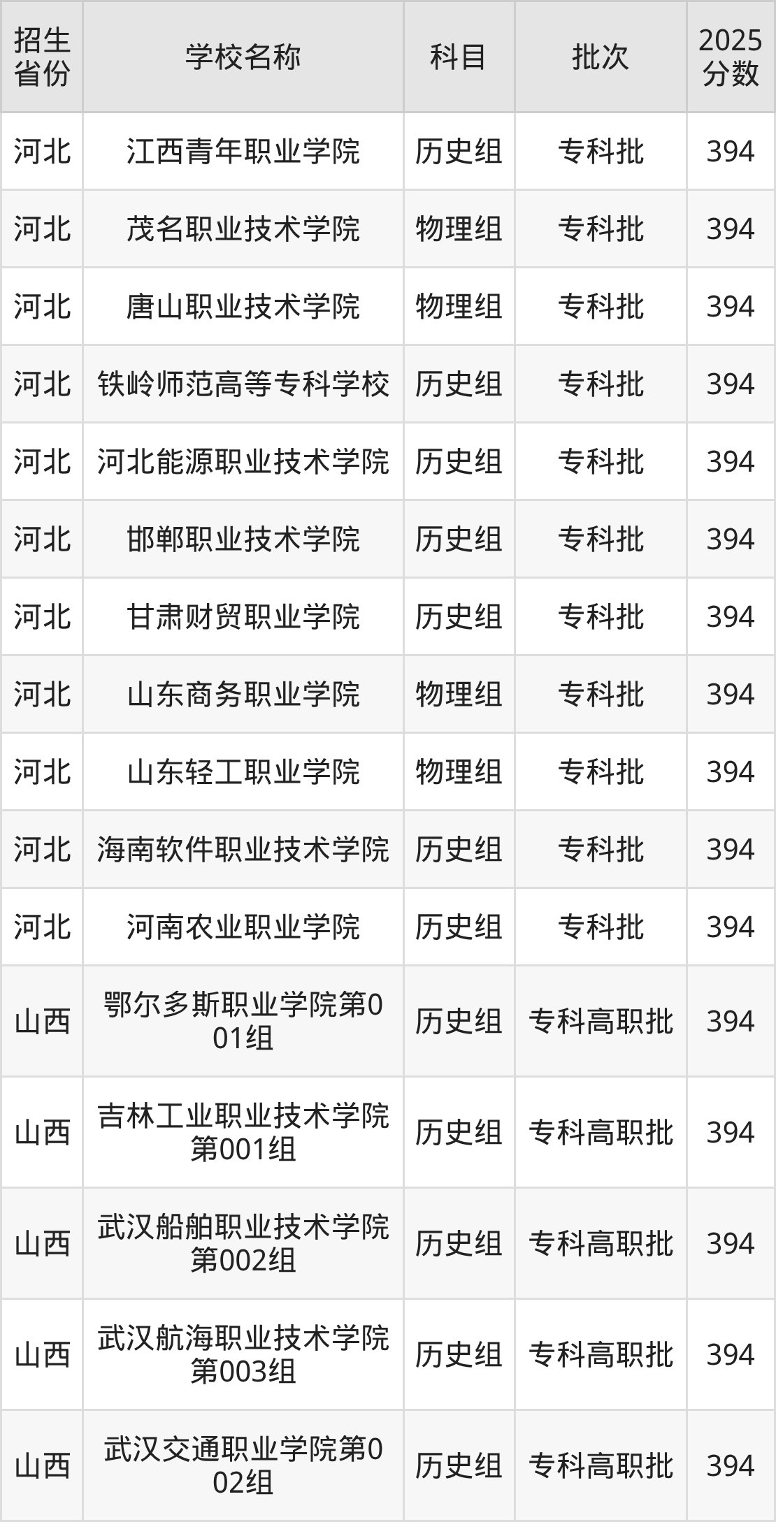 河北省物理组分数线是394分的公办专科大学有:茂名职业技术学院、唐山职业技术学院、山东商务职业学院、山东轻工职业学院。