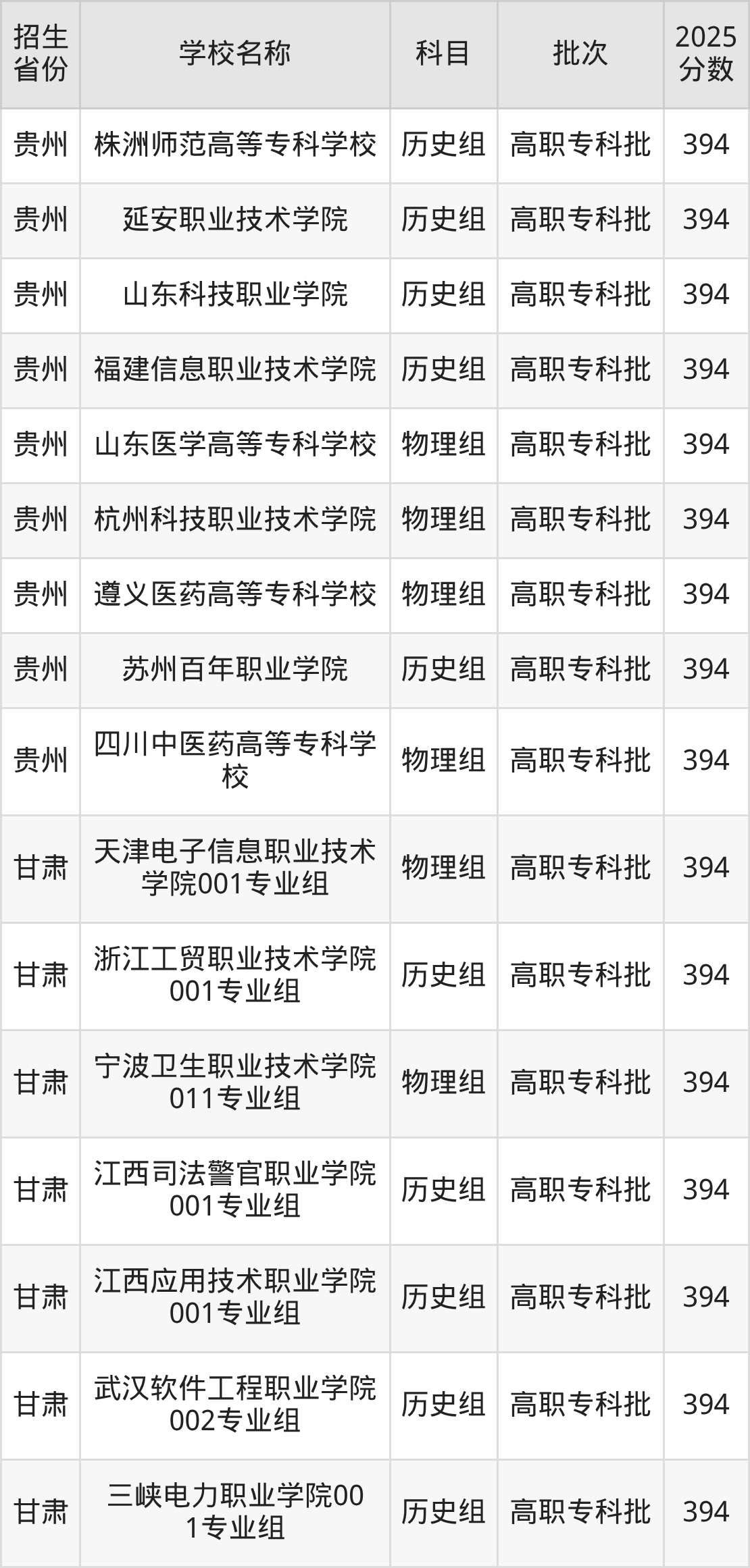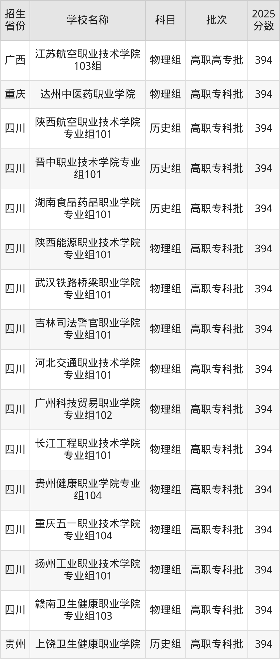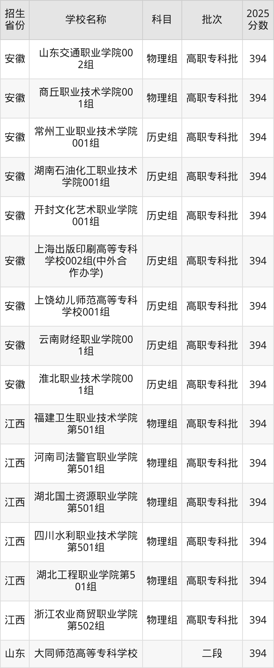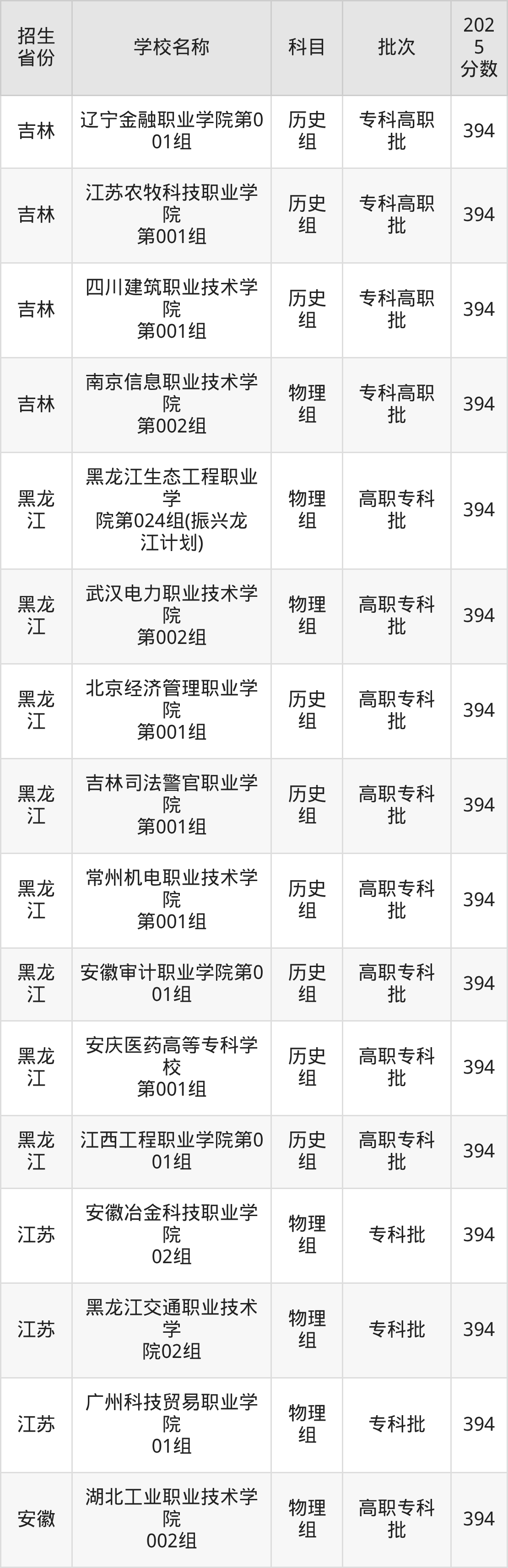 筛选全国各省2025年录取分数线为394分的公办专科大学如下: