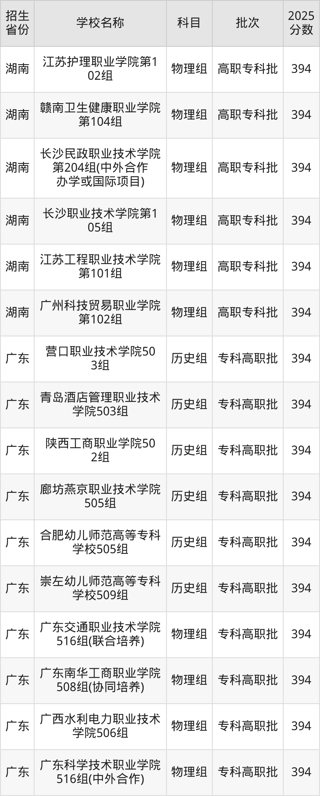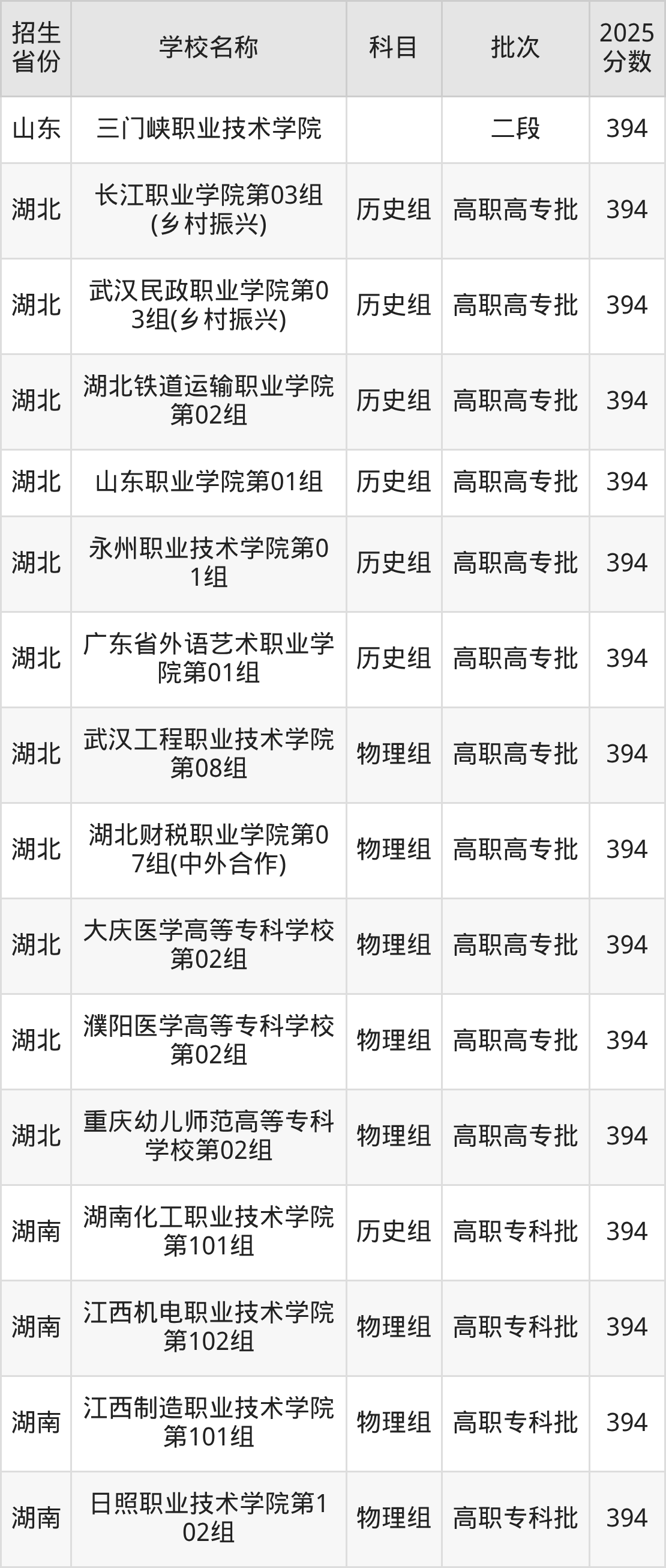 湖北省历史组分数线是394分的公办专科大学有:长江职业学院、武汉民政职业学院、湖北铁道运输职业学院、山东职业学院、永州职业技术学院、广东省外语艺术职业学院。