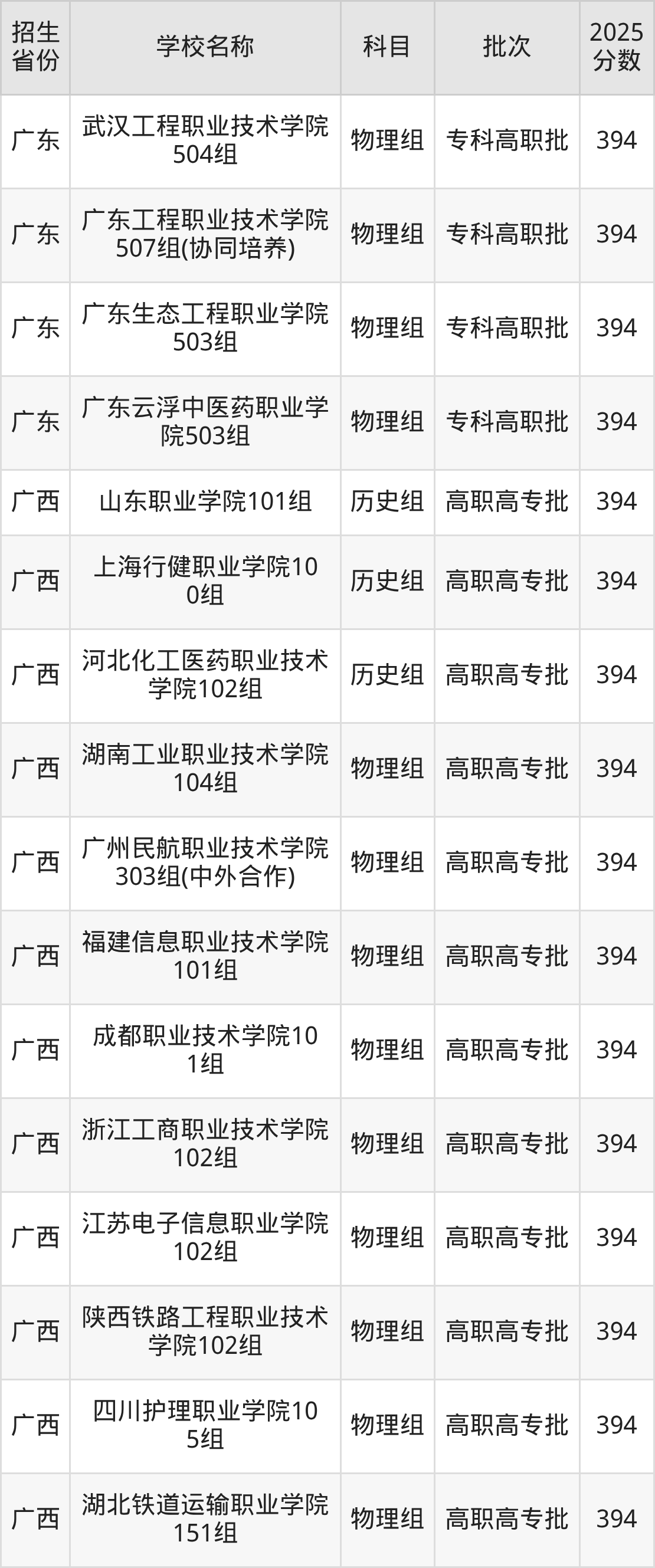 广东省物理组分数线是394分的公办专科大学有:广东交通职业技术学院、广东南华工商职业学院、广西水利电力职业技术学院、广东科学技术职业学院、武汉工程职业技术学院、广东工程职业技术学院、广东生态工程职业学院、广东云浮中医药职业学院。