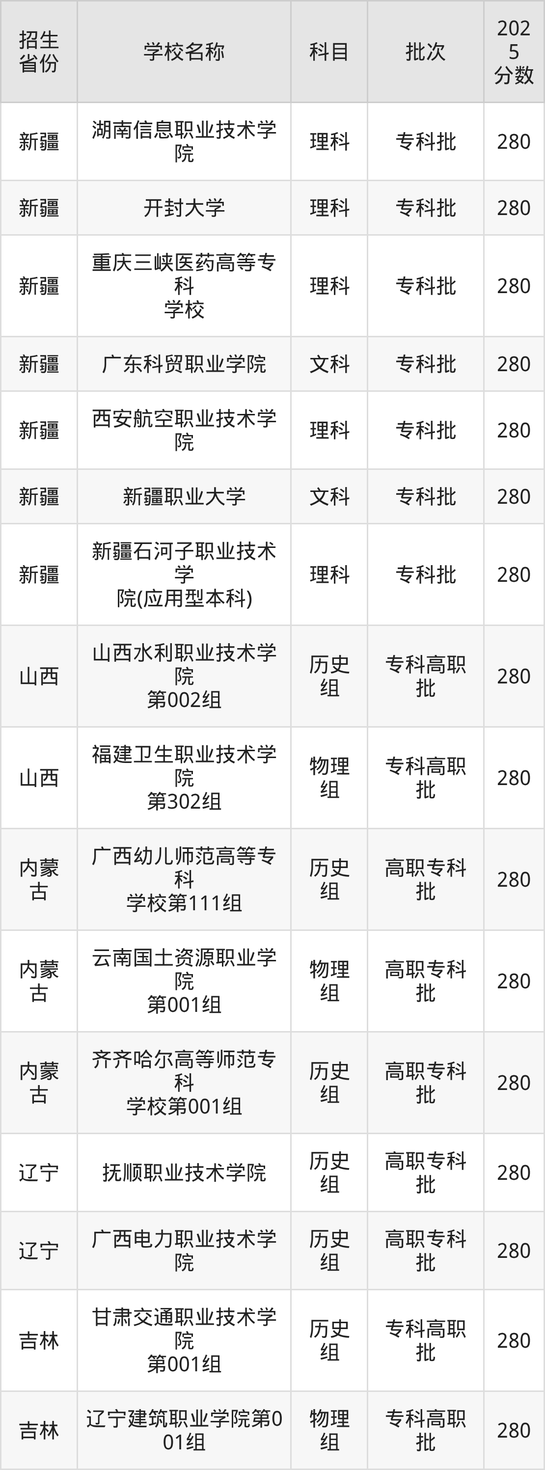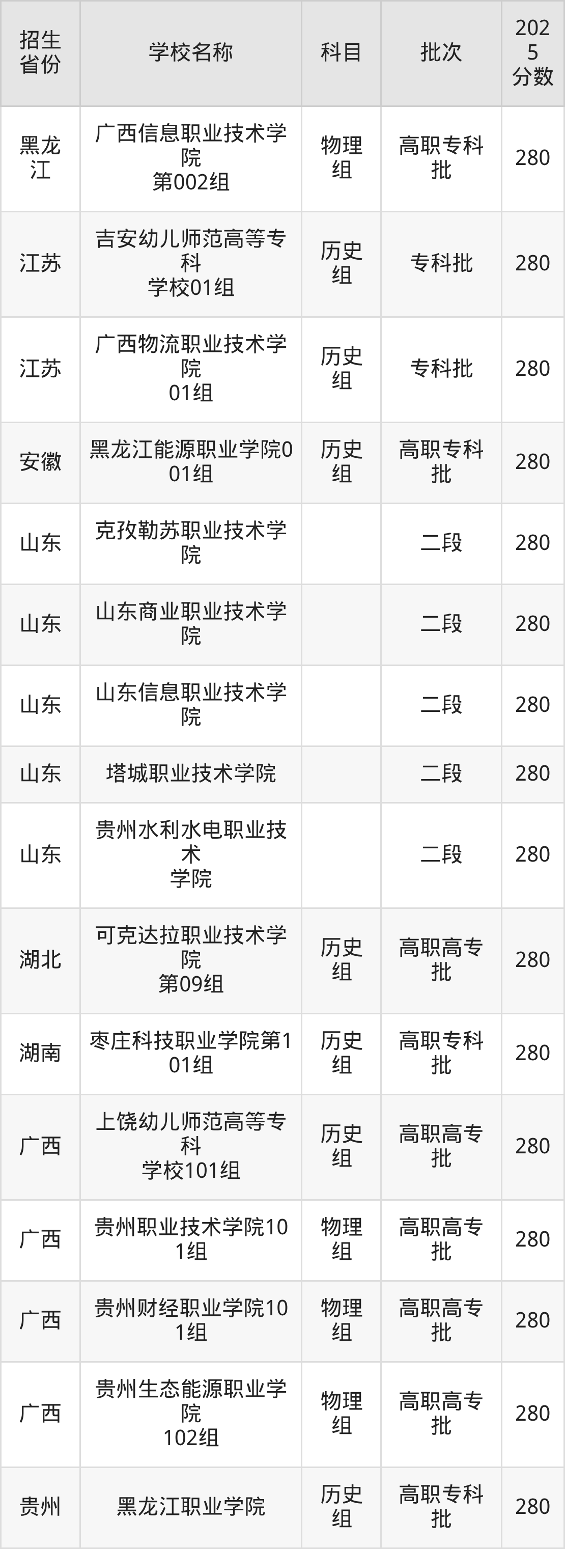 筛选全国各省2025年录取分数线为280分的公办专科大学如下:
