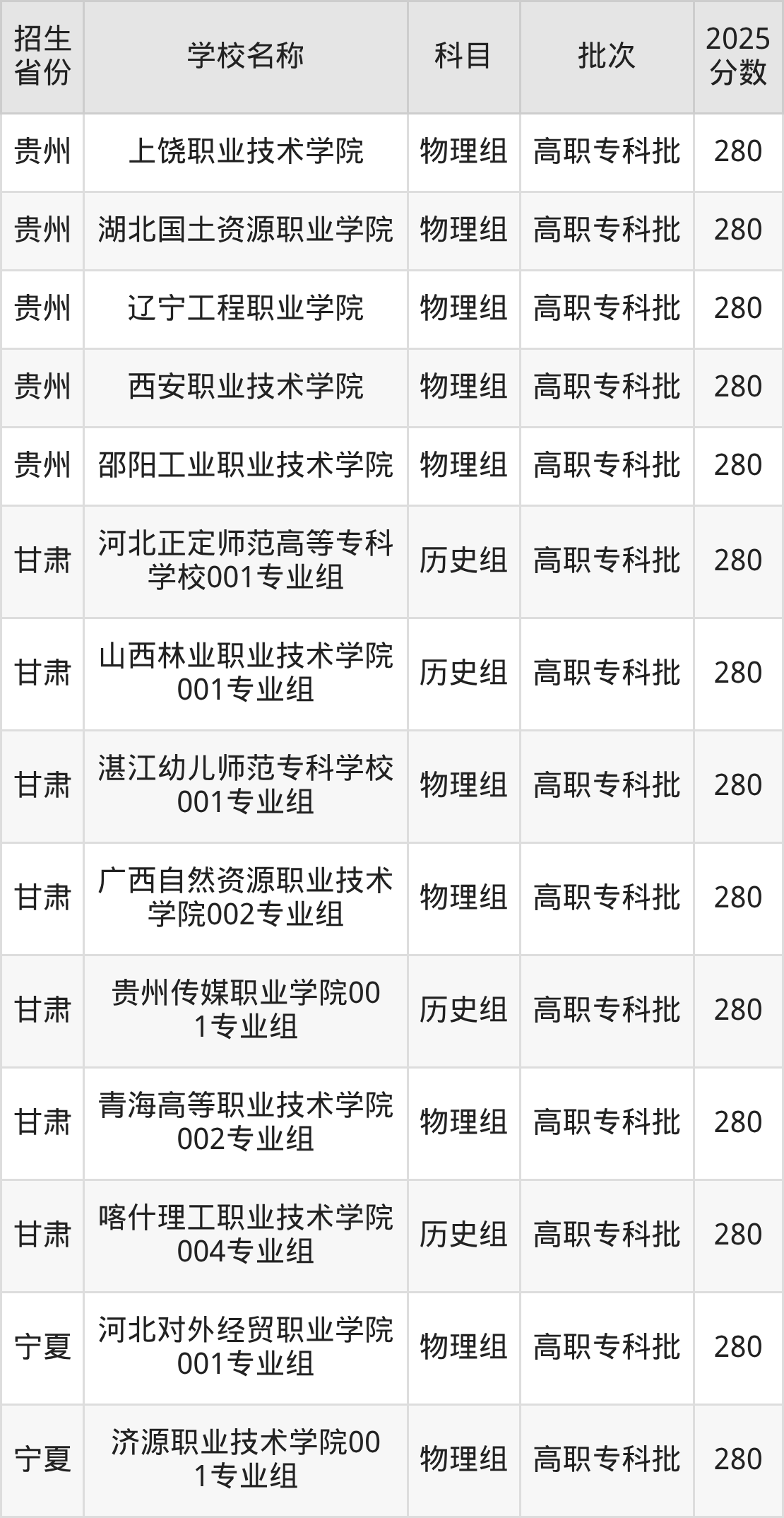 贵州省物理组分数线是280分的公办专科大学有:上饶职业技术学院、湖北国土资源职业学院、辽宁工程职业学院、西安职业技术学院、邵阳工业职业技术学院。