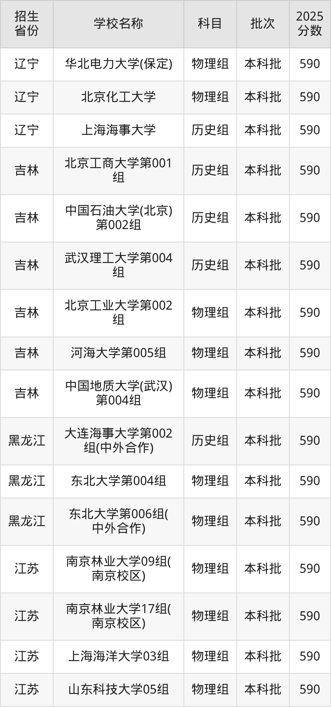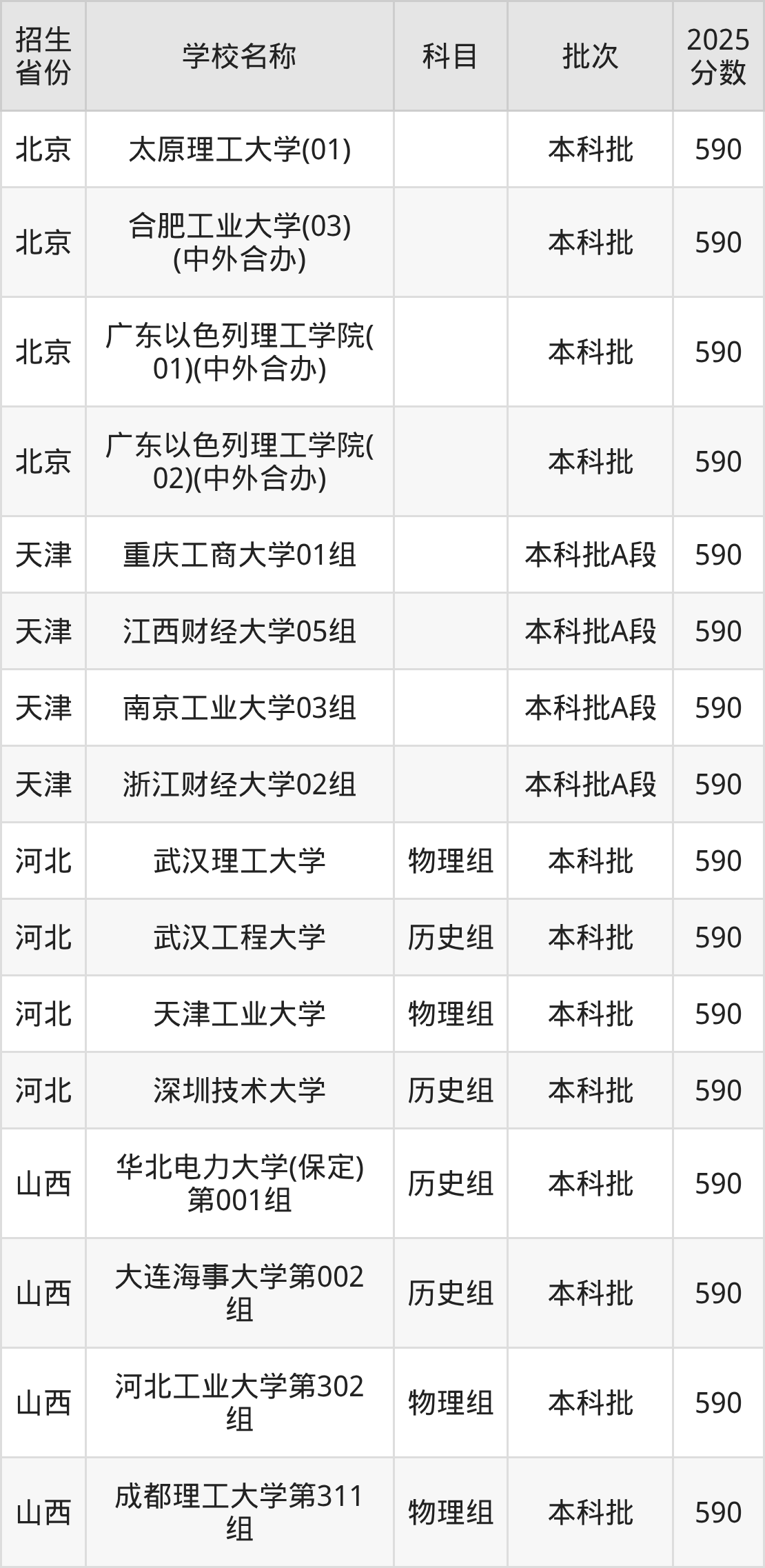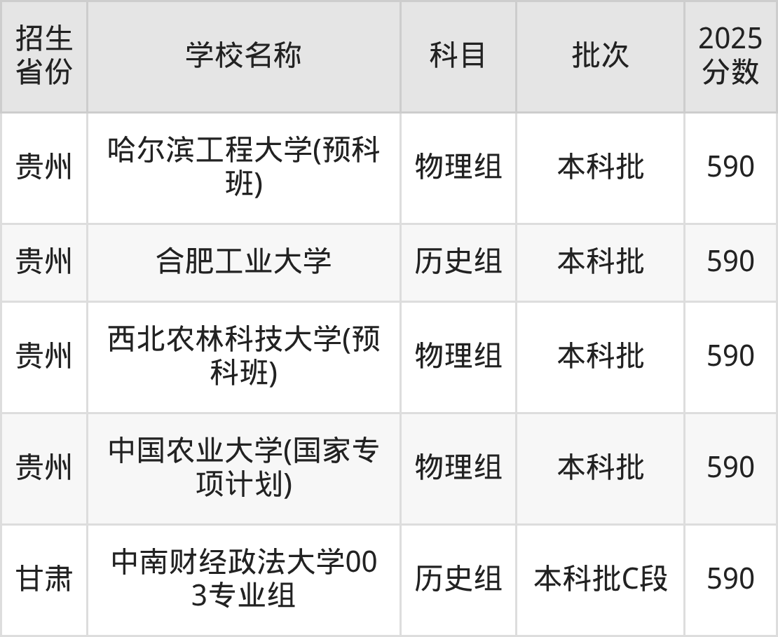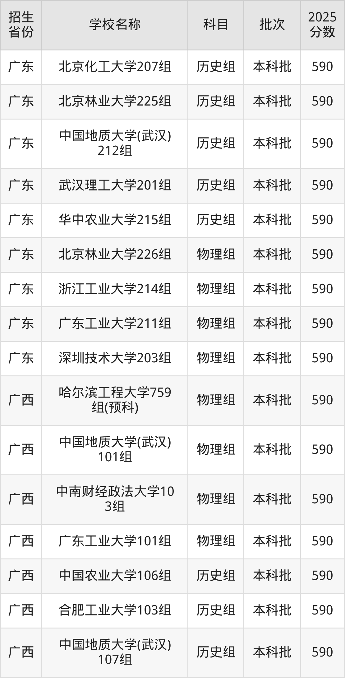 筛选全国各省2025年录取分数线为590分的理科大学如下: