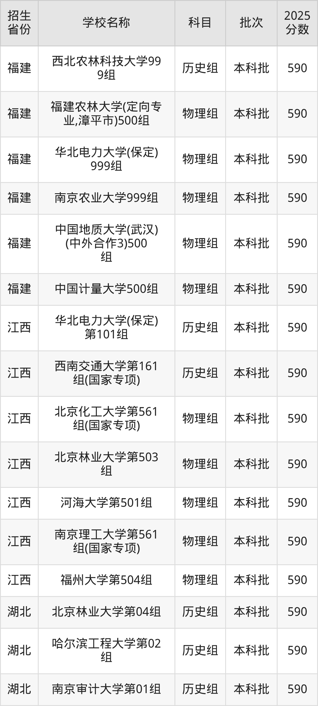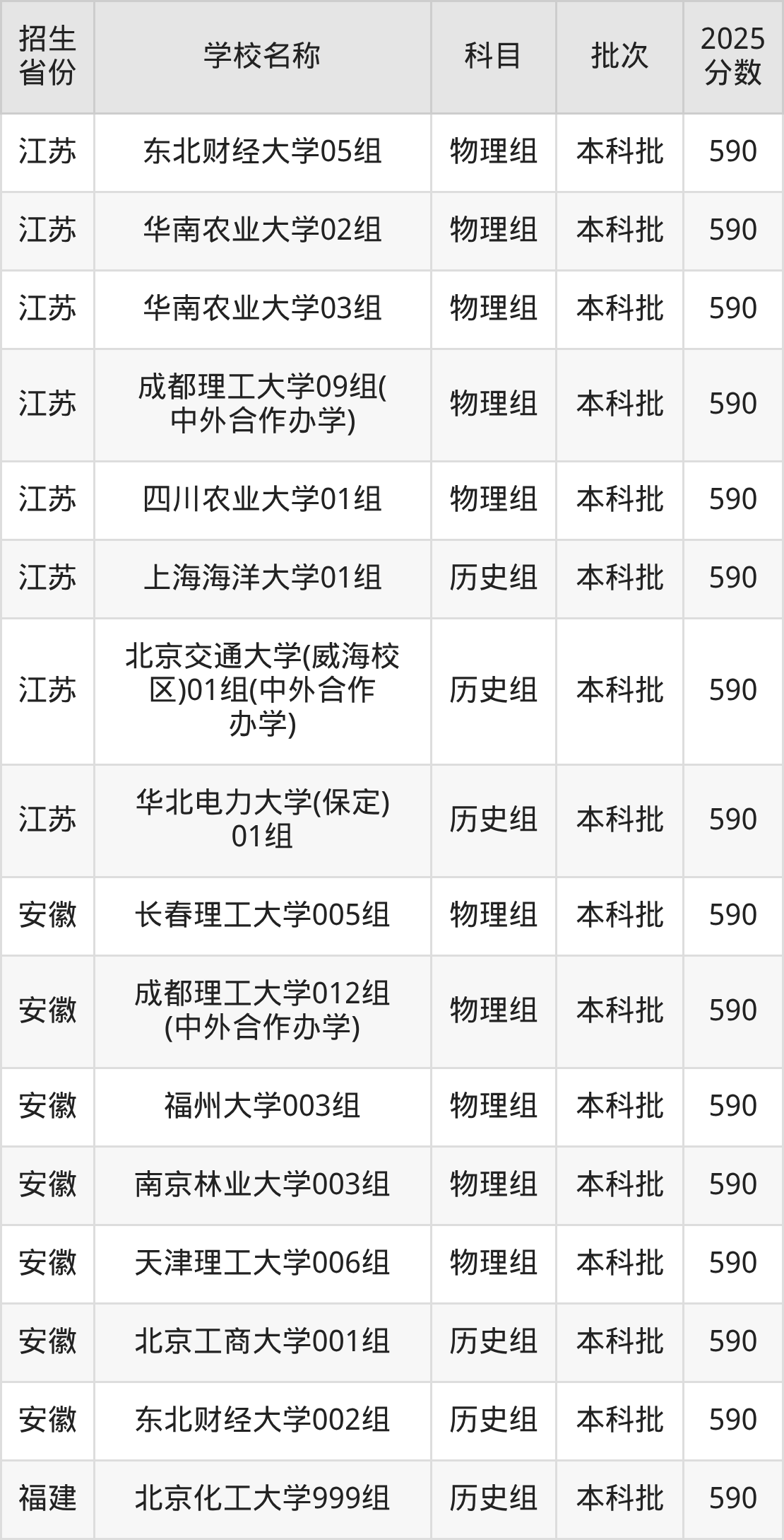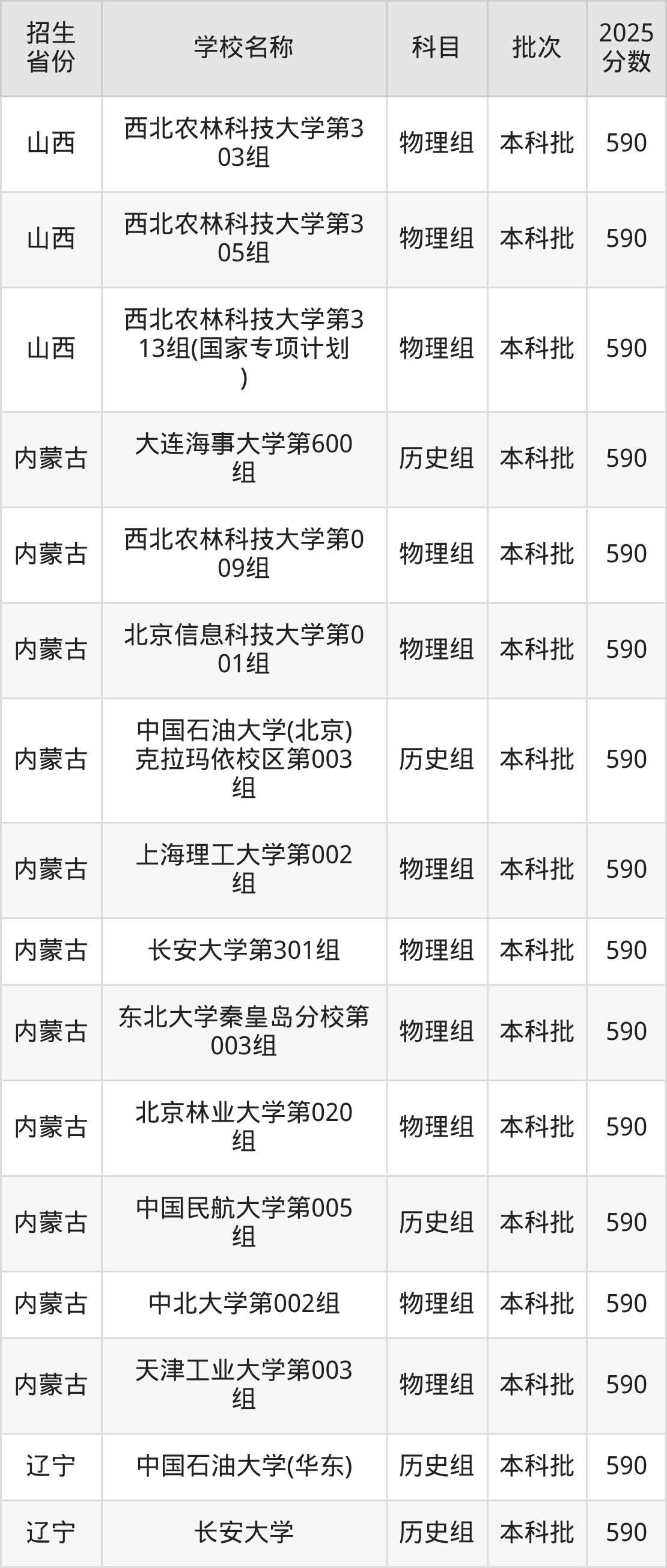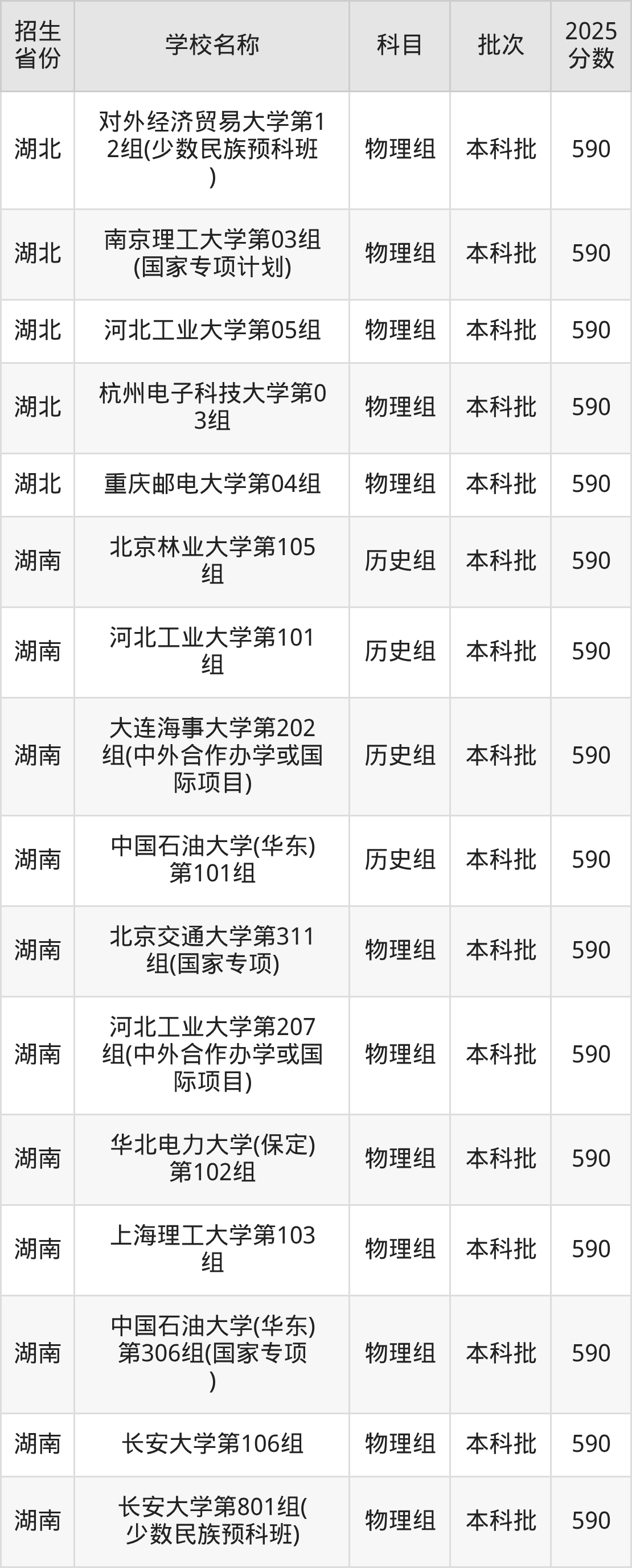 筛选全国各省2025年录取分数线为590分的理科大学如下: