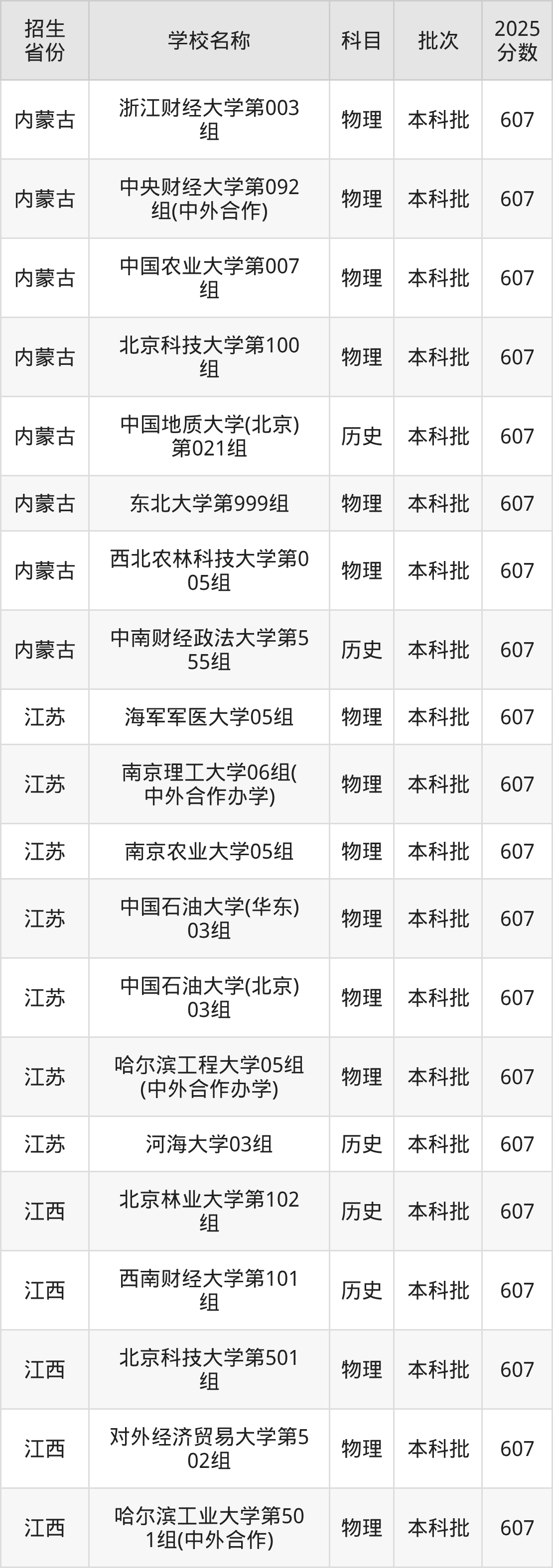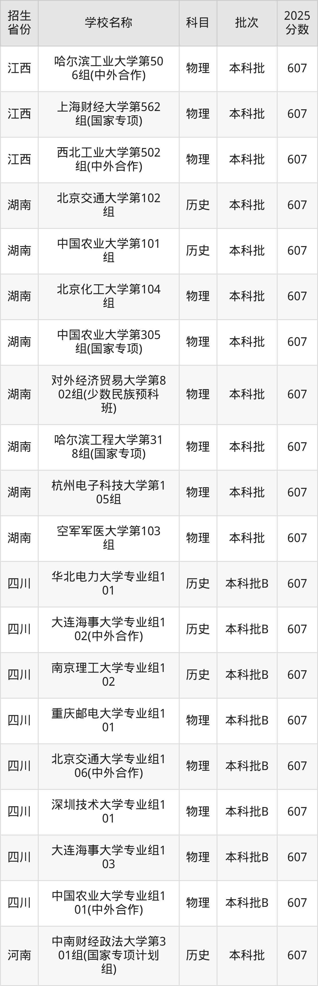 筛选全国各省2025年录取分数线为607分的理科大学如下: