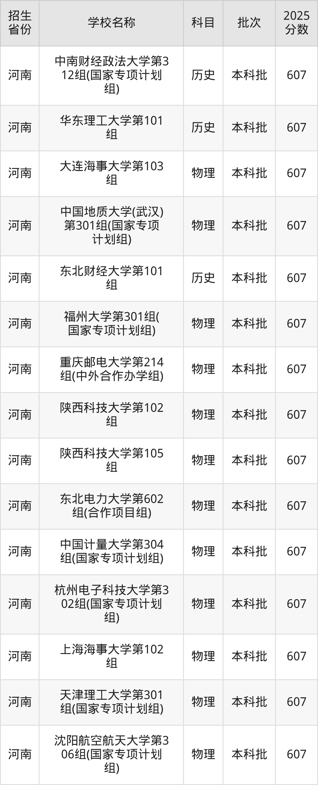 河南省历史组分数线是607分的理科大学有:中南财经政法大学、华东理工大学、东北财经大学。