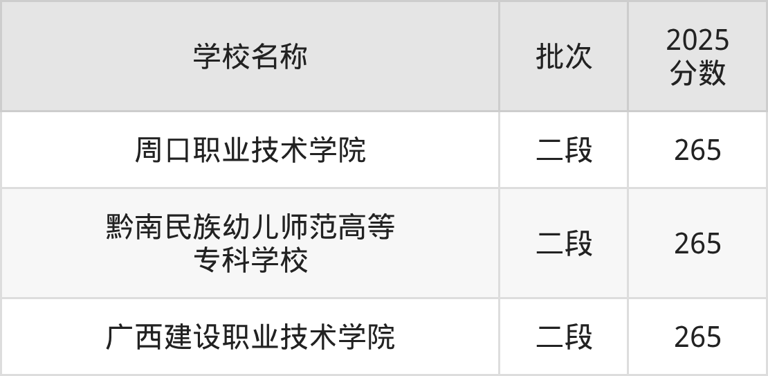 山东高考录取分数线在265分左右的公办大学一共有3所。分别是周口职业技术学院(265分)、黔南民族幼儿师范高等专科学校(265分)、广西建设职业技术学院(265分)