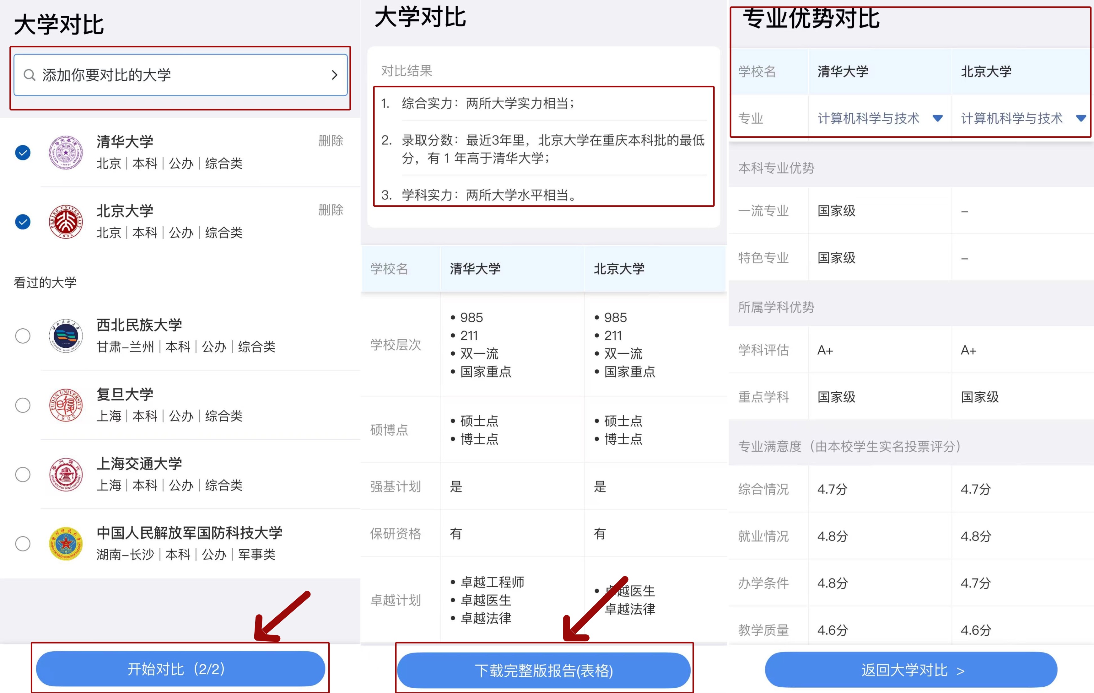 3、支持两所大学在学校层次、升学就业情况、录取分数、学科实力等多方位对比。
