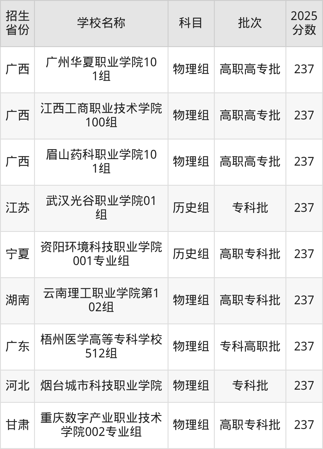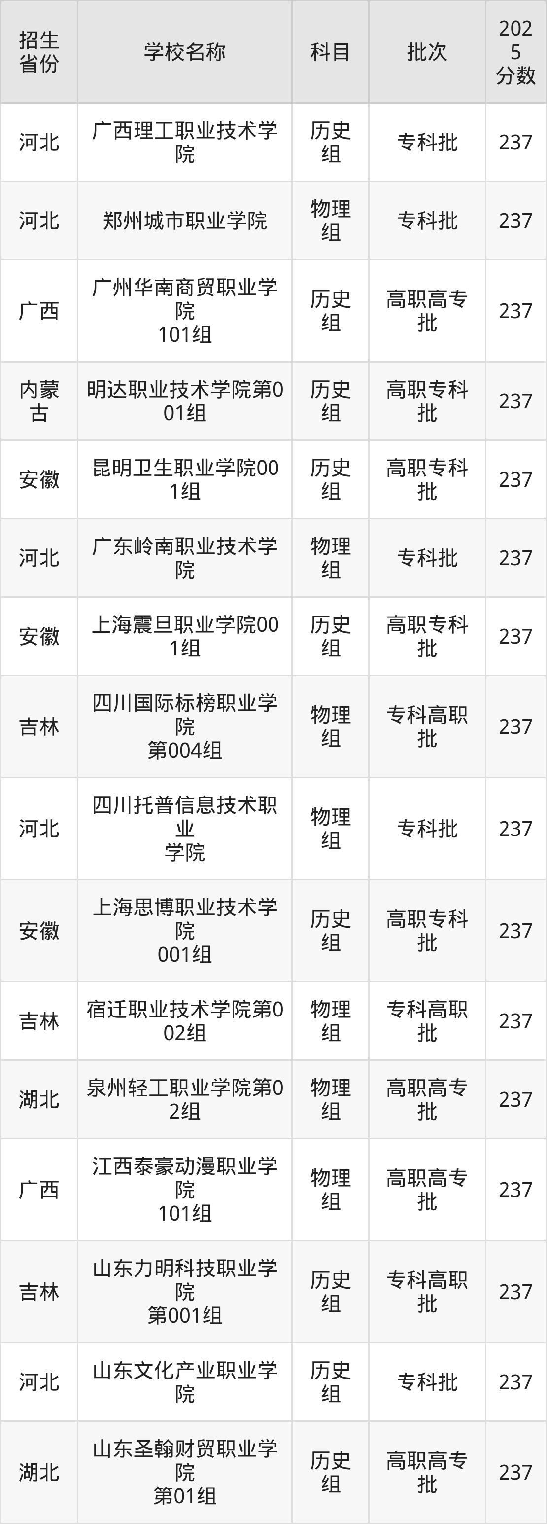 筛选全国各省2025年录取分数线为237分的民办专科学校如下: