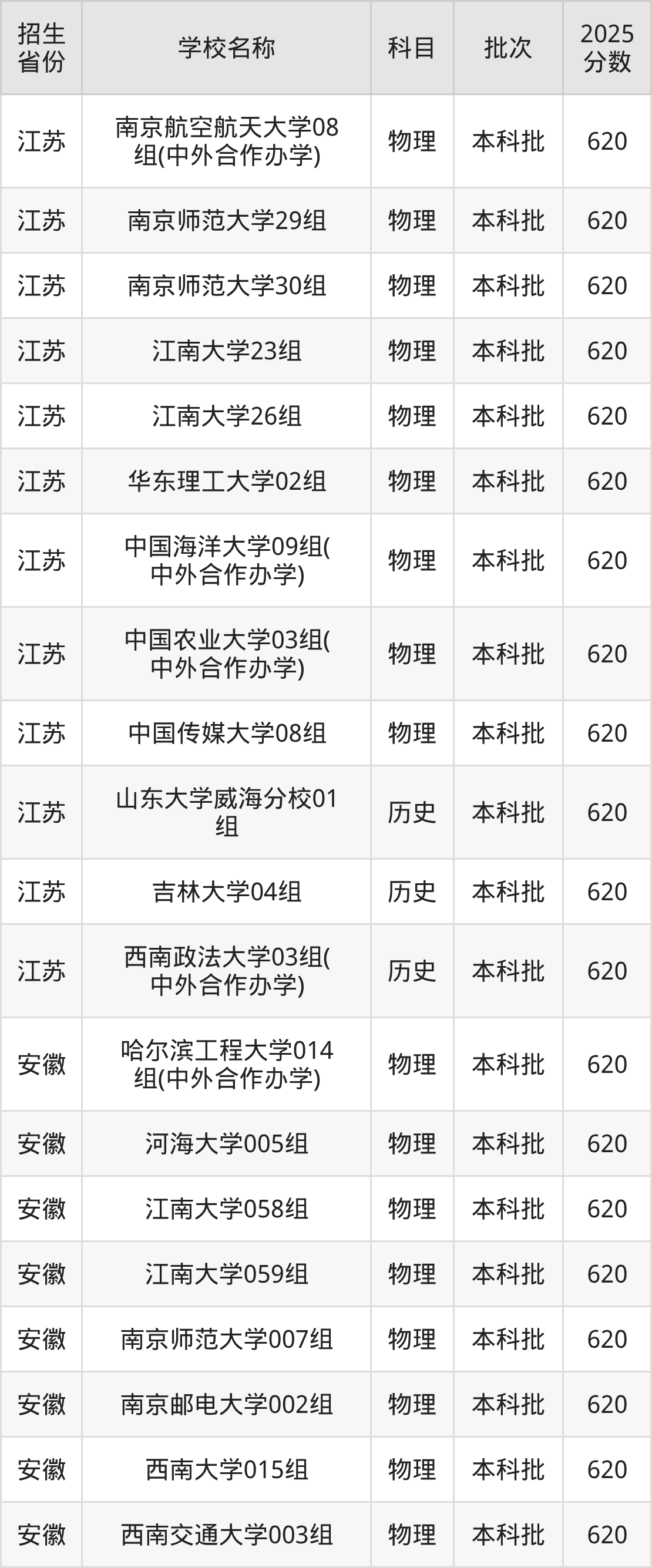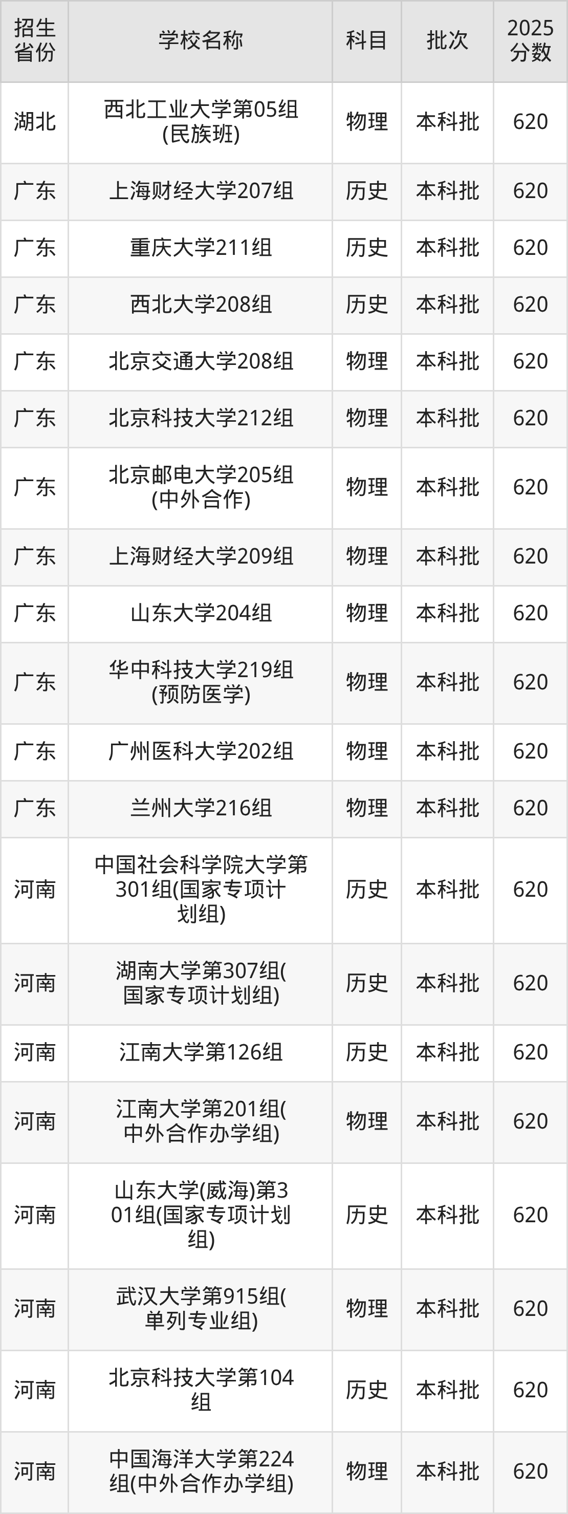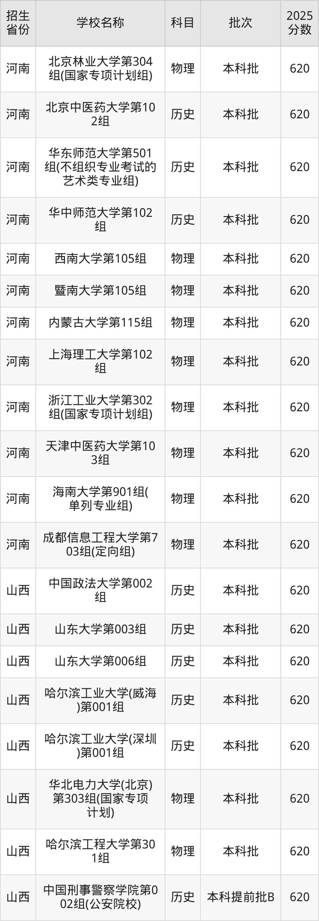 筛选全国各省2025年录取分数线为620分的重点大学如下: