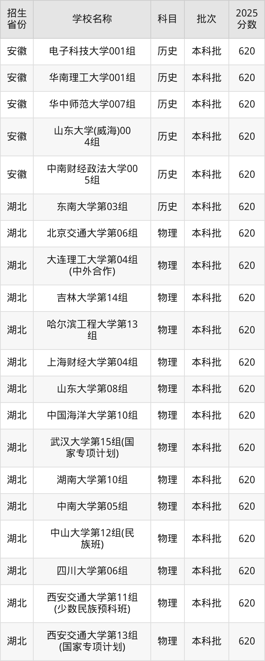 安徽省历史组分数线是620分的重点大学有:电子科技大学、华南理工大学、华中师范大学、山东大学(威海)、中南财经政法大学。
