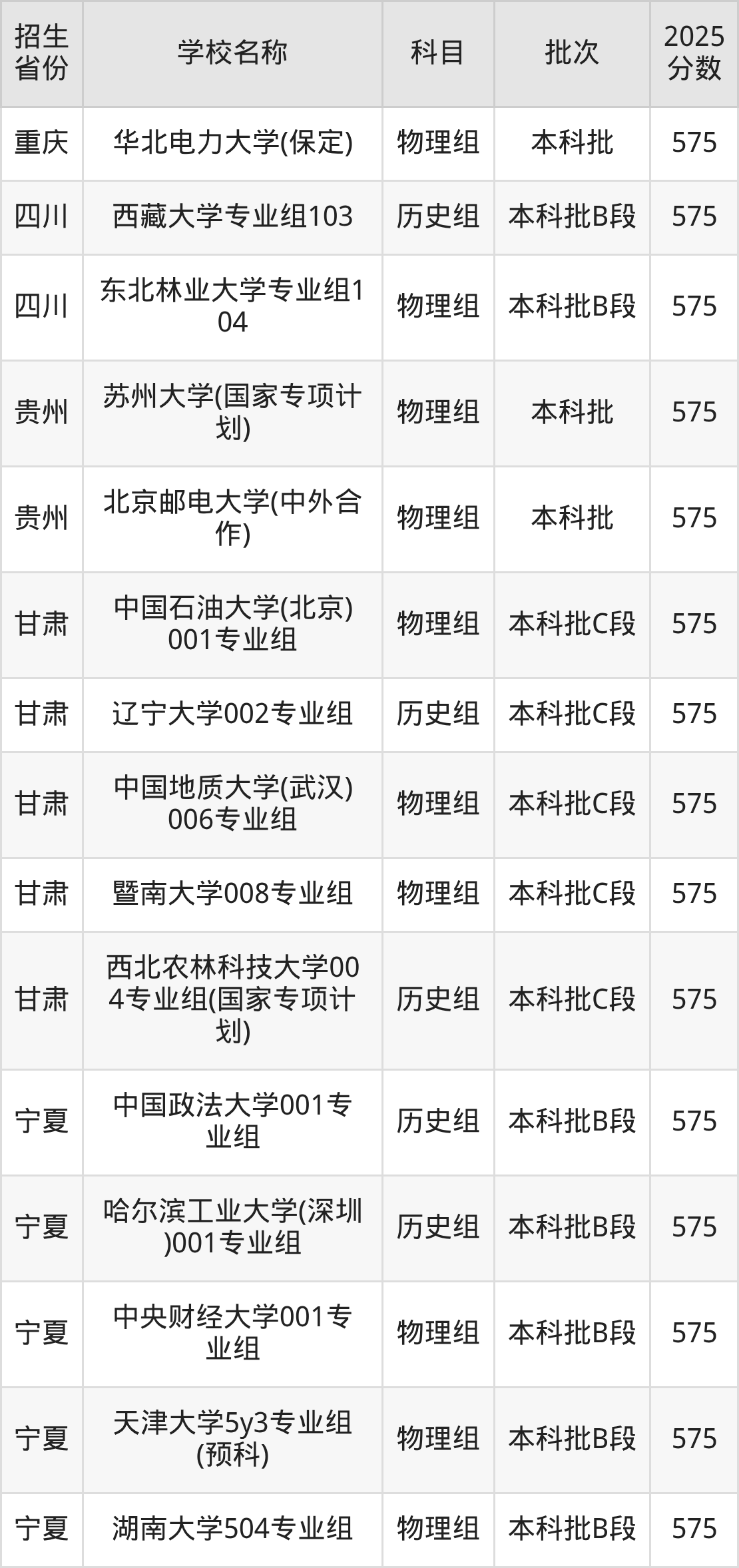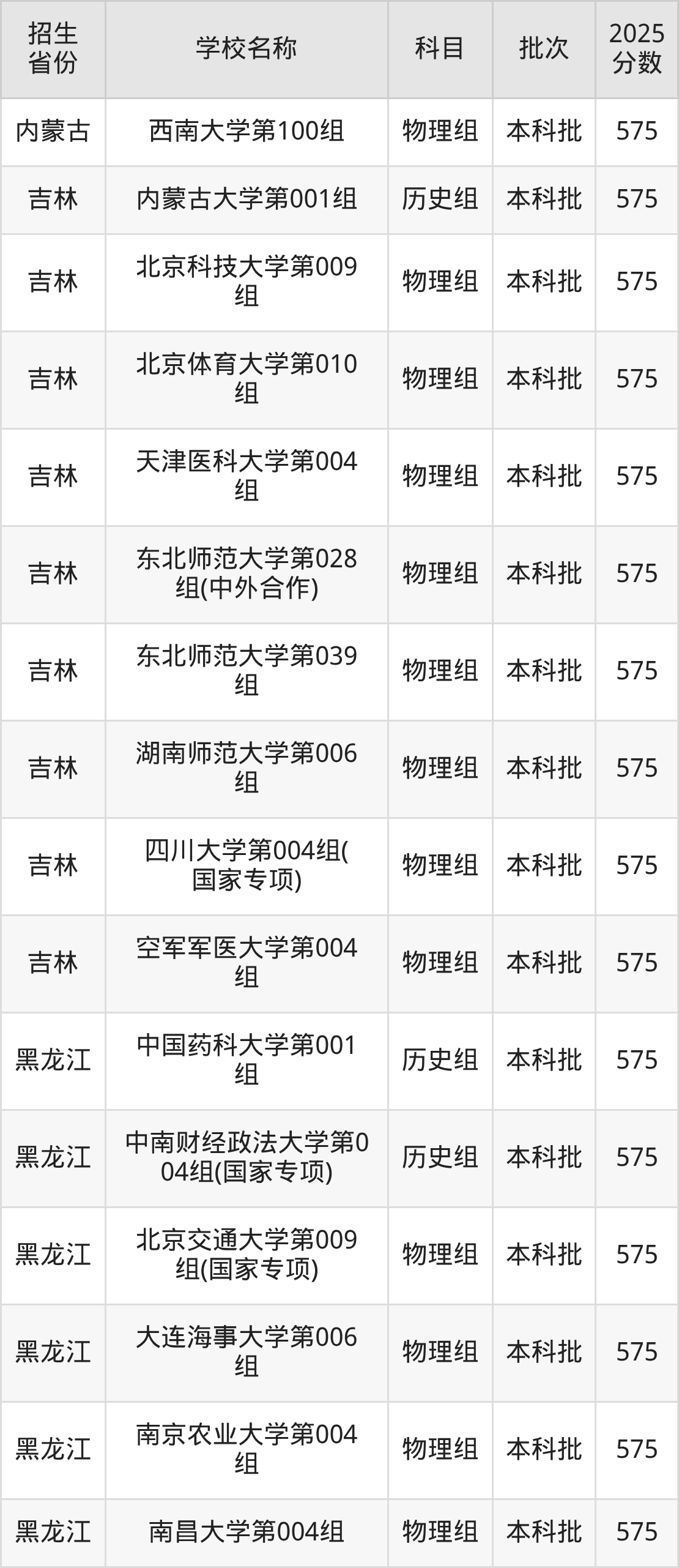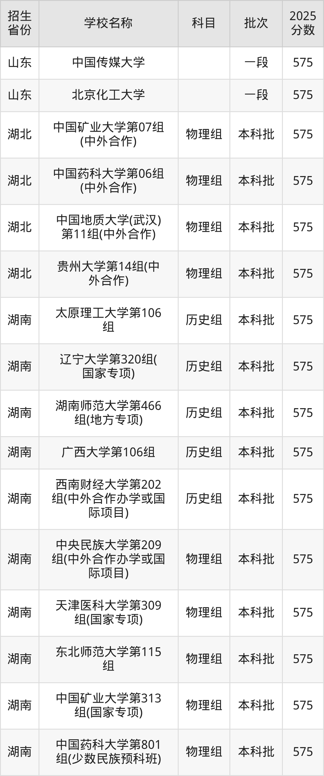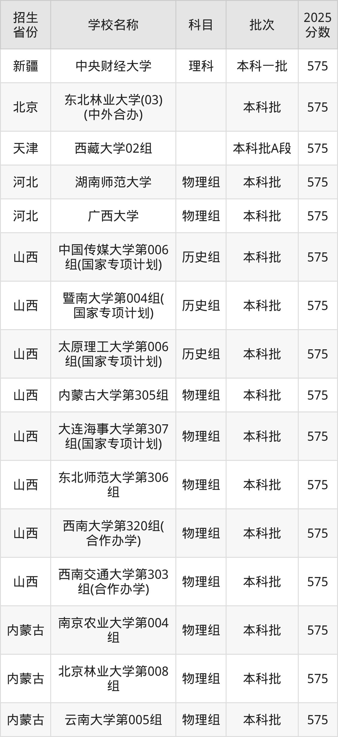 筛选全国各省2025年录取分数线为575分的211大学如下: