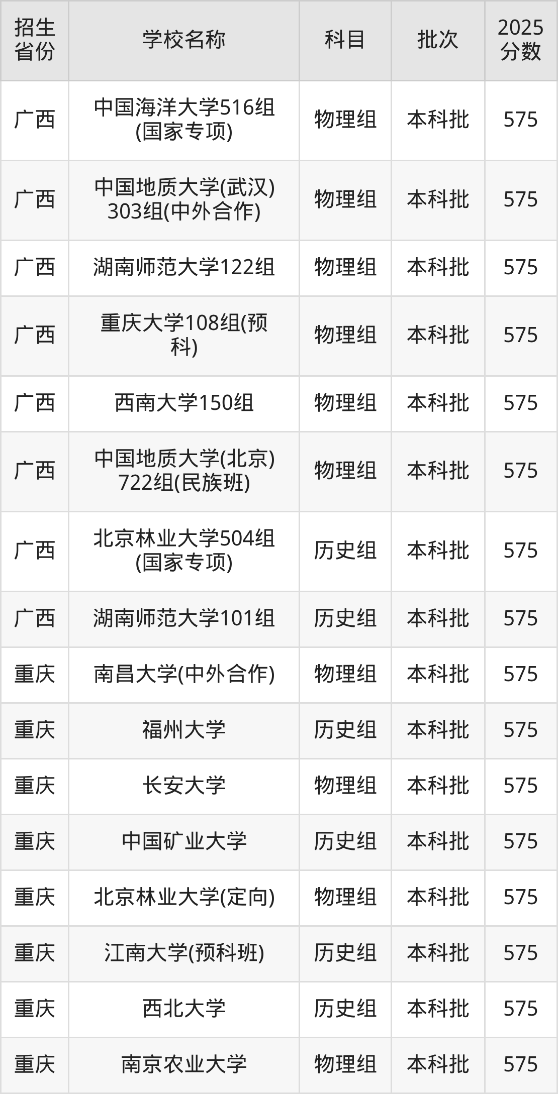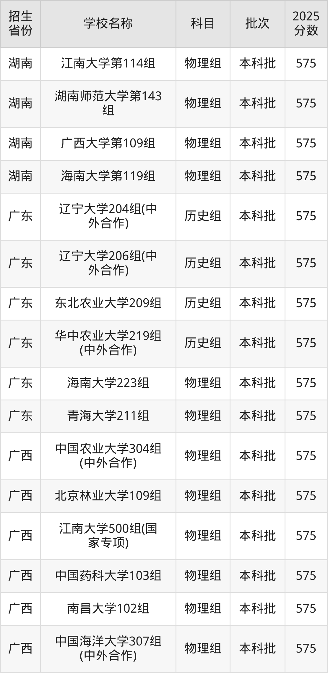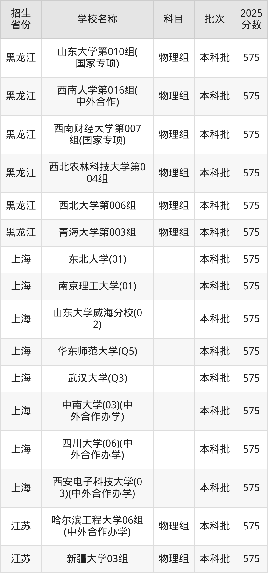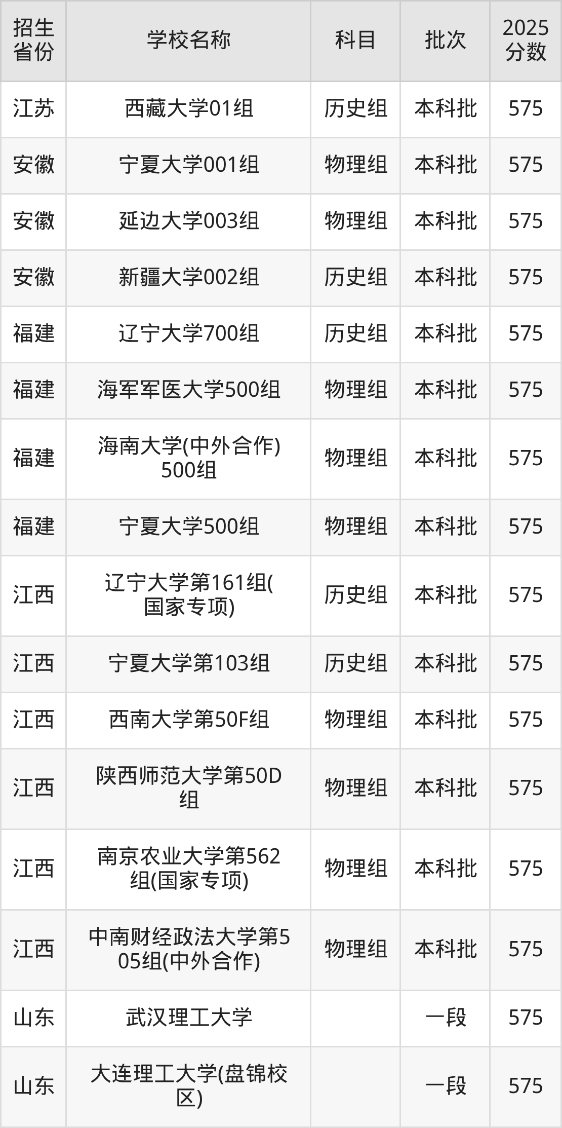 筛选全国各省2025年录取分数线为575分的211大学如下: