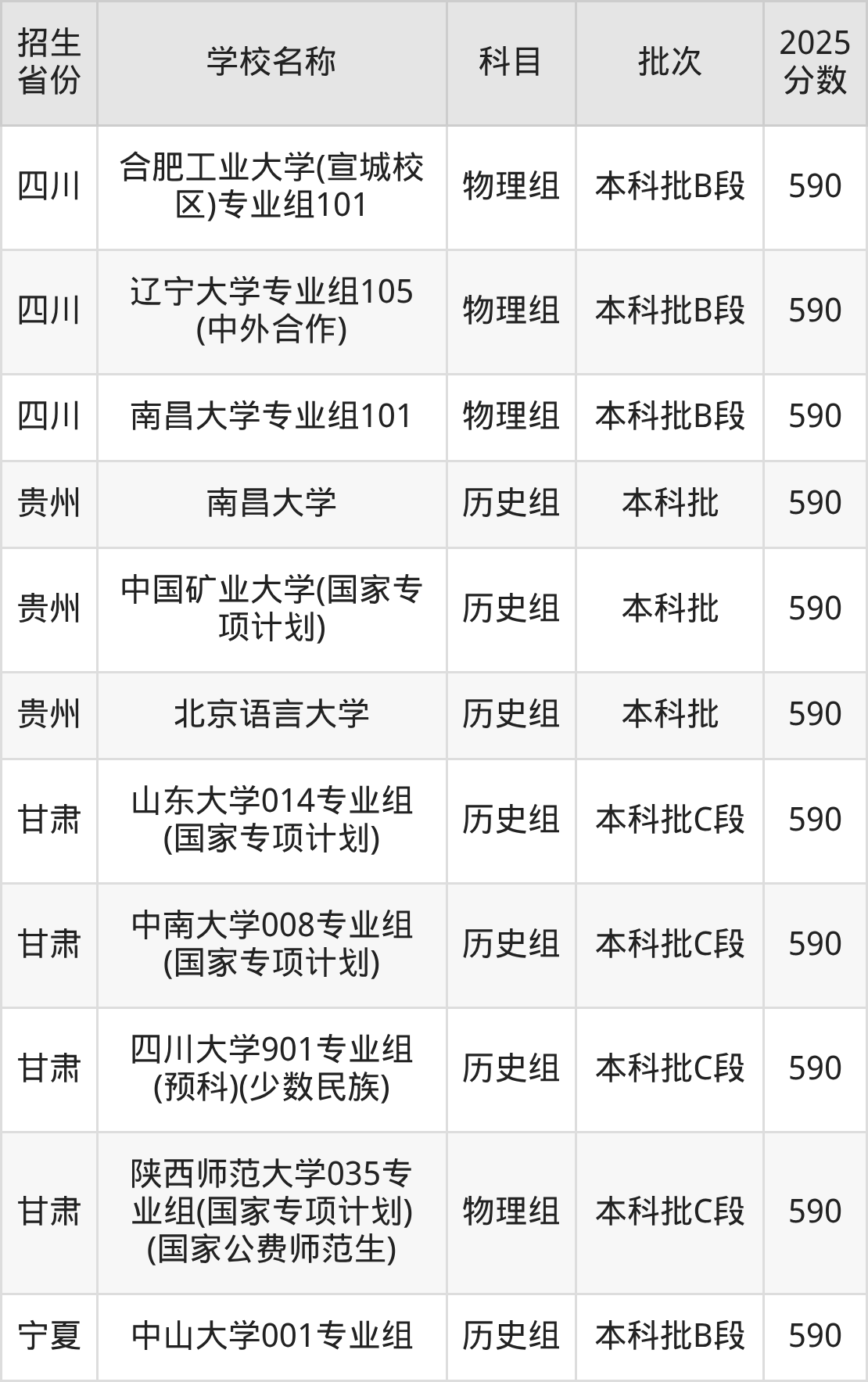 二、各省590分的文科大学名单