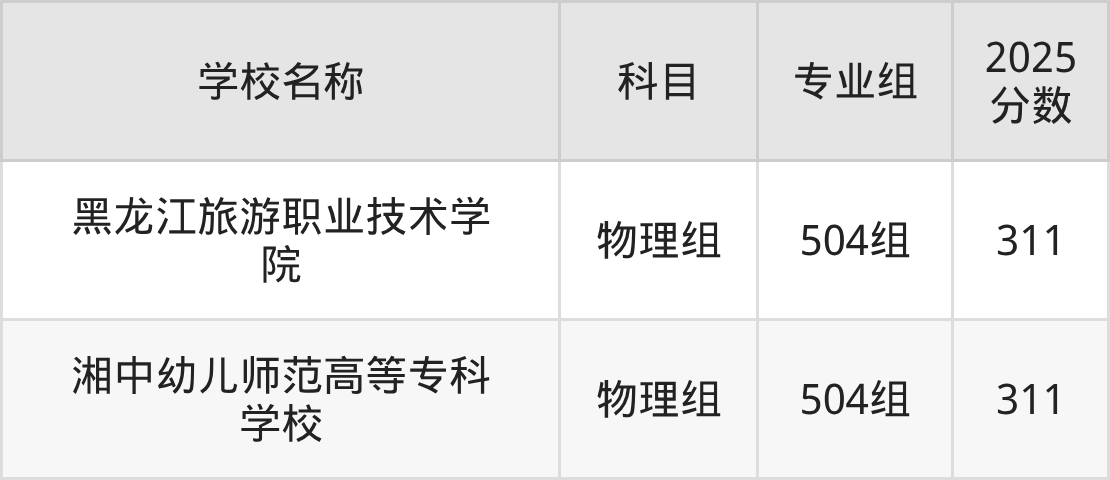 广东高考录取分数线在311分左右的公办院校专业组一共有2个,其中物理组有:黑龙江旅游职业技术学院(311分)、湘中幼儿师范高等专科学校(311分)。