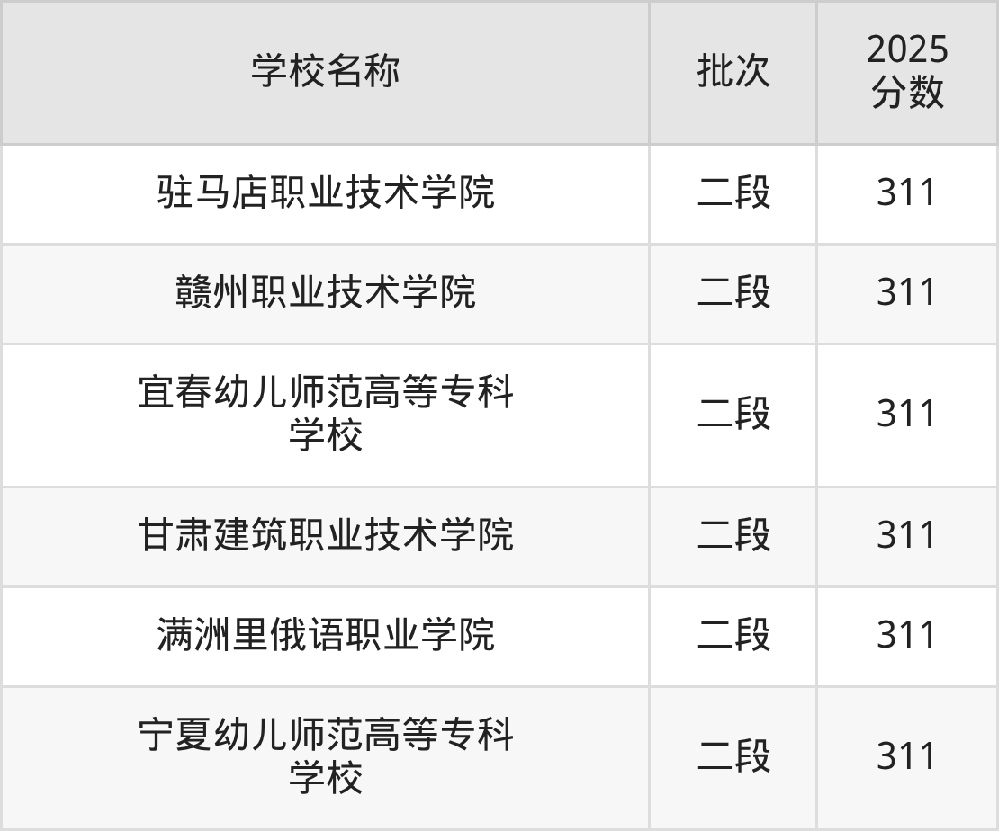 山东高考录取分数线在311分左右的公办大学一共有6所。分别是驻马店职业技术学院(311分)、赣州职业技术学院(311分)、宜春幼儿师范高等专科学校(311分)