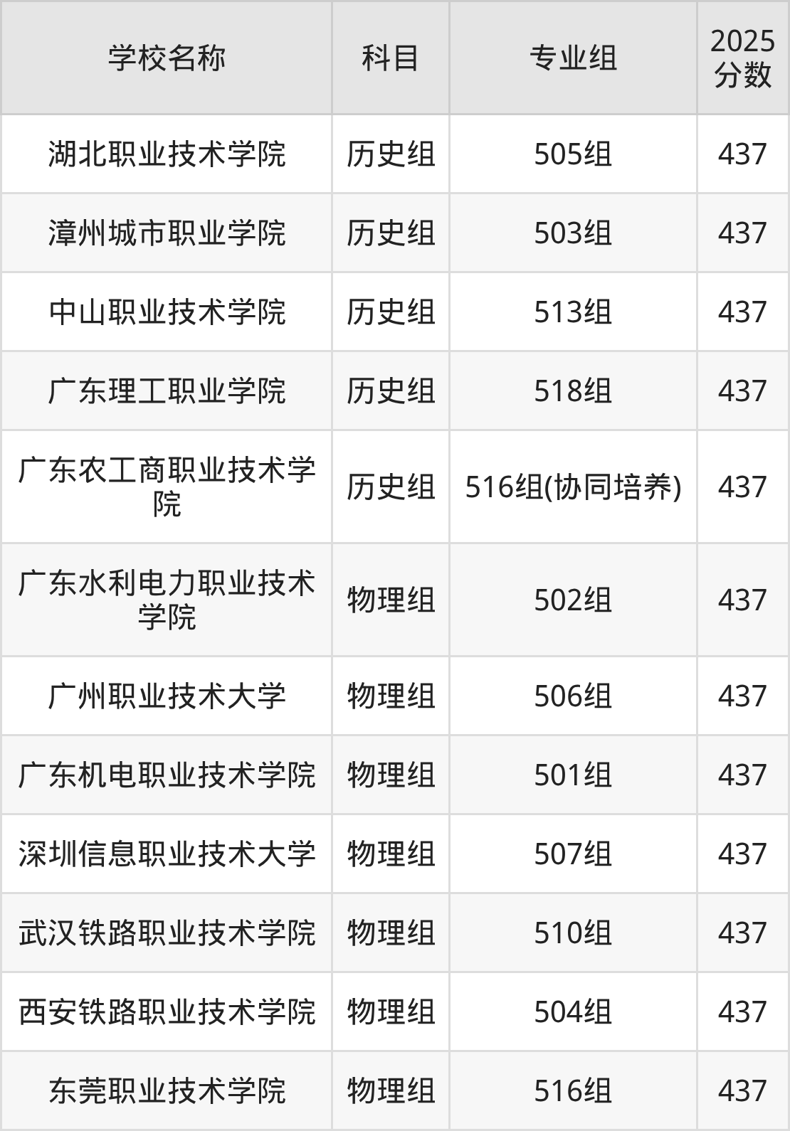 广东高考录取分数线在437分左右的公办院校专业组一共有12个,其中历史组有:湖北职业技术学院(437分)、漳州城市职业学院(437分)、中山职业技术学院(437分),物理组有:广东水利电力职业技术学院(437分)、广州职业技术大学(437分)、广东机电职业技术学院(437分)。