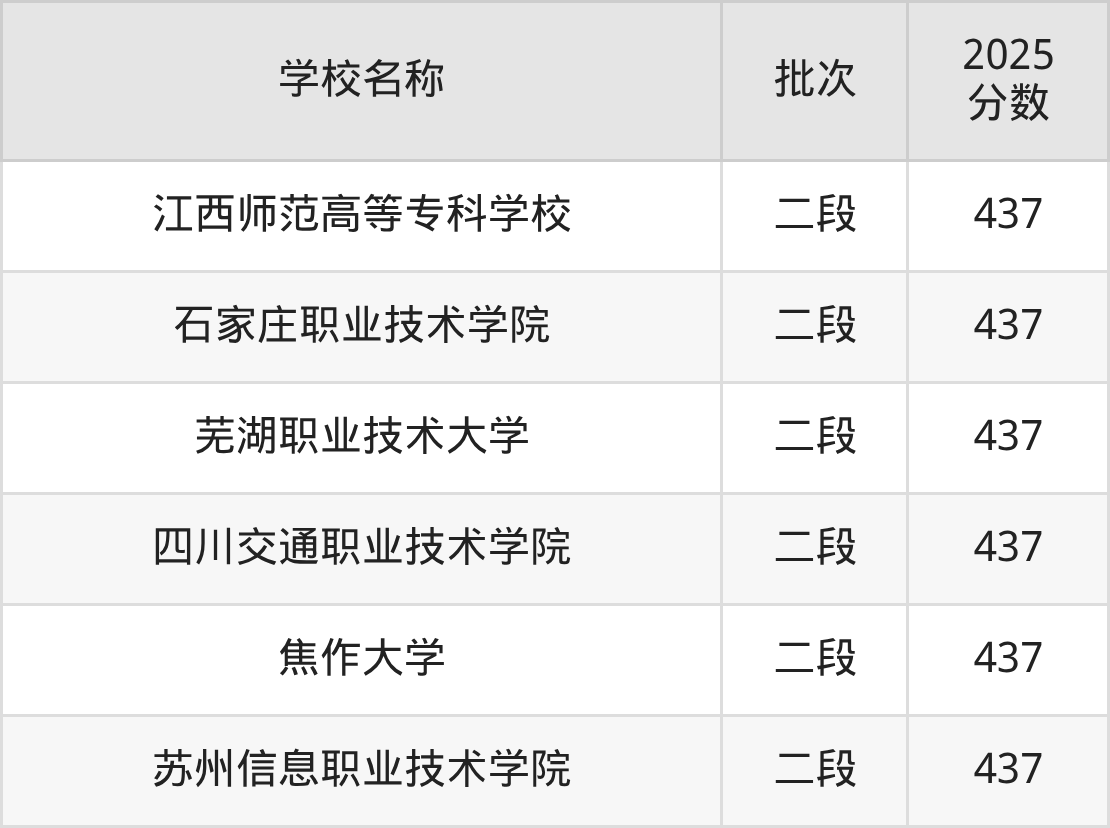 山东高考录取分数线在437分左右的公办大学一共有6所。分别是江西师范高等专科学校(437分)、石家庄职业技术学院(437分)、芜湖职业技术大学(437分)