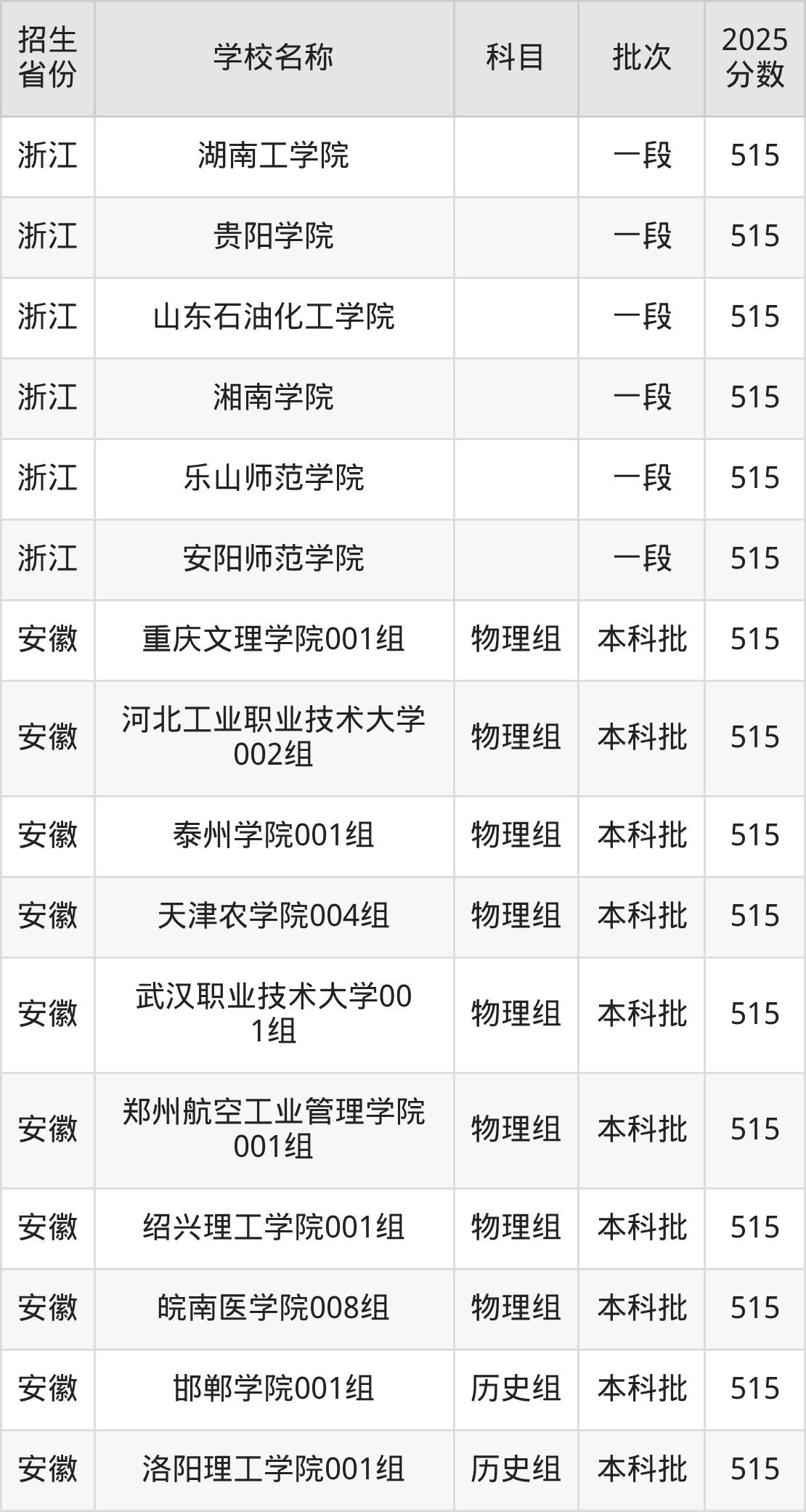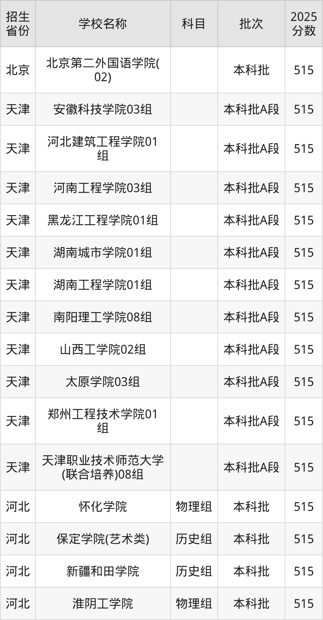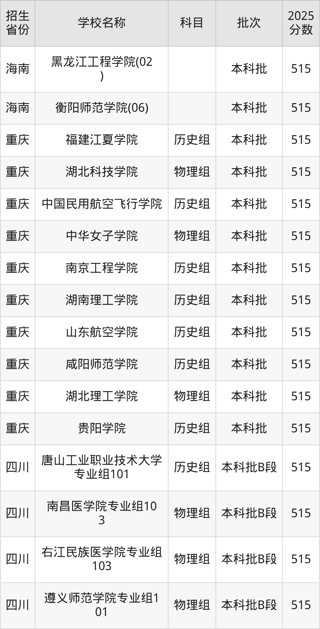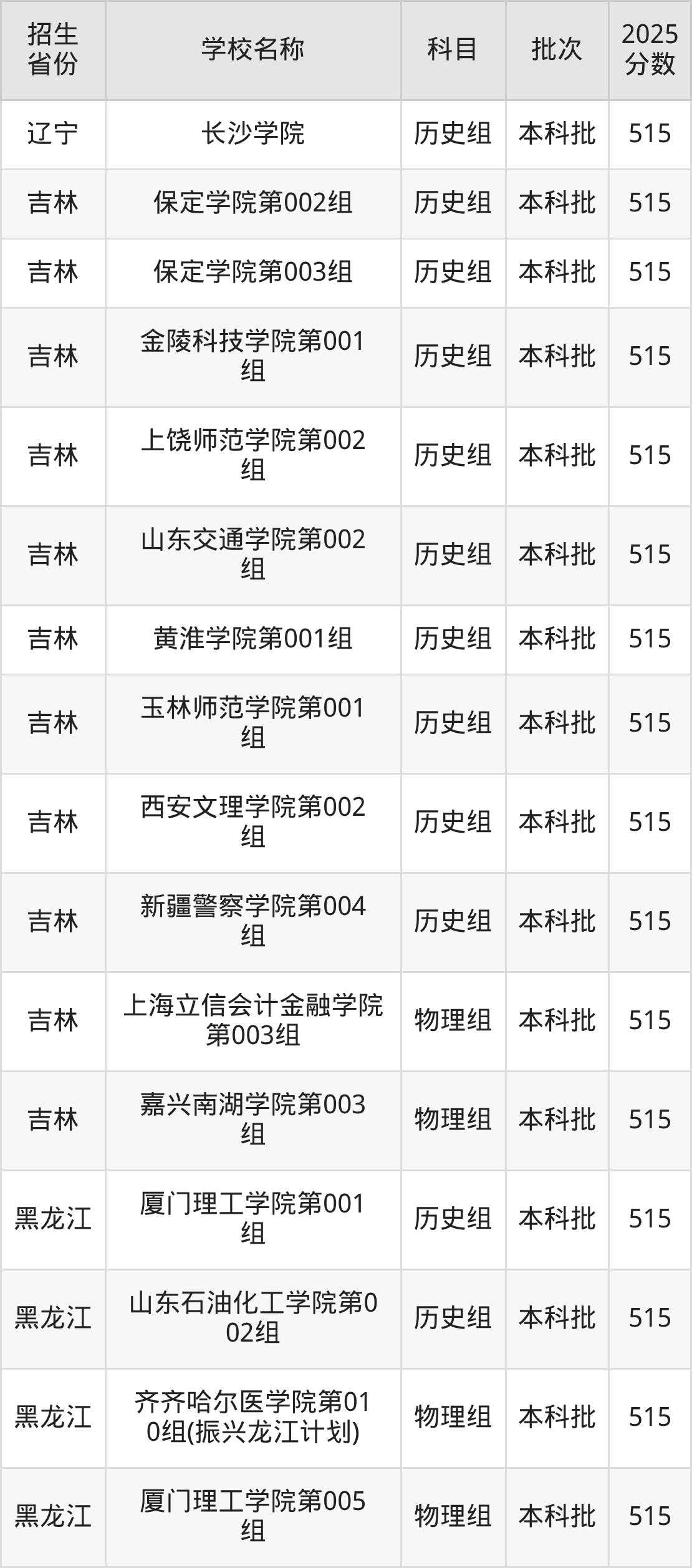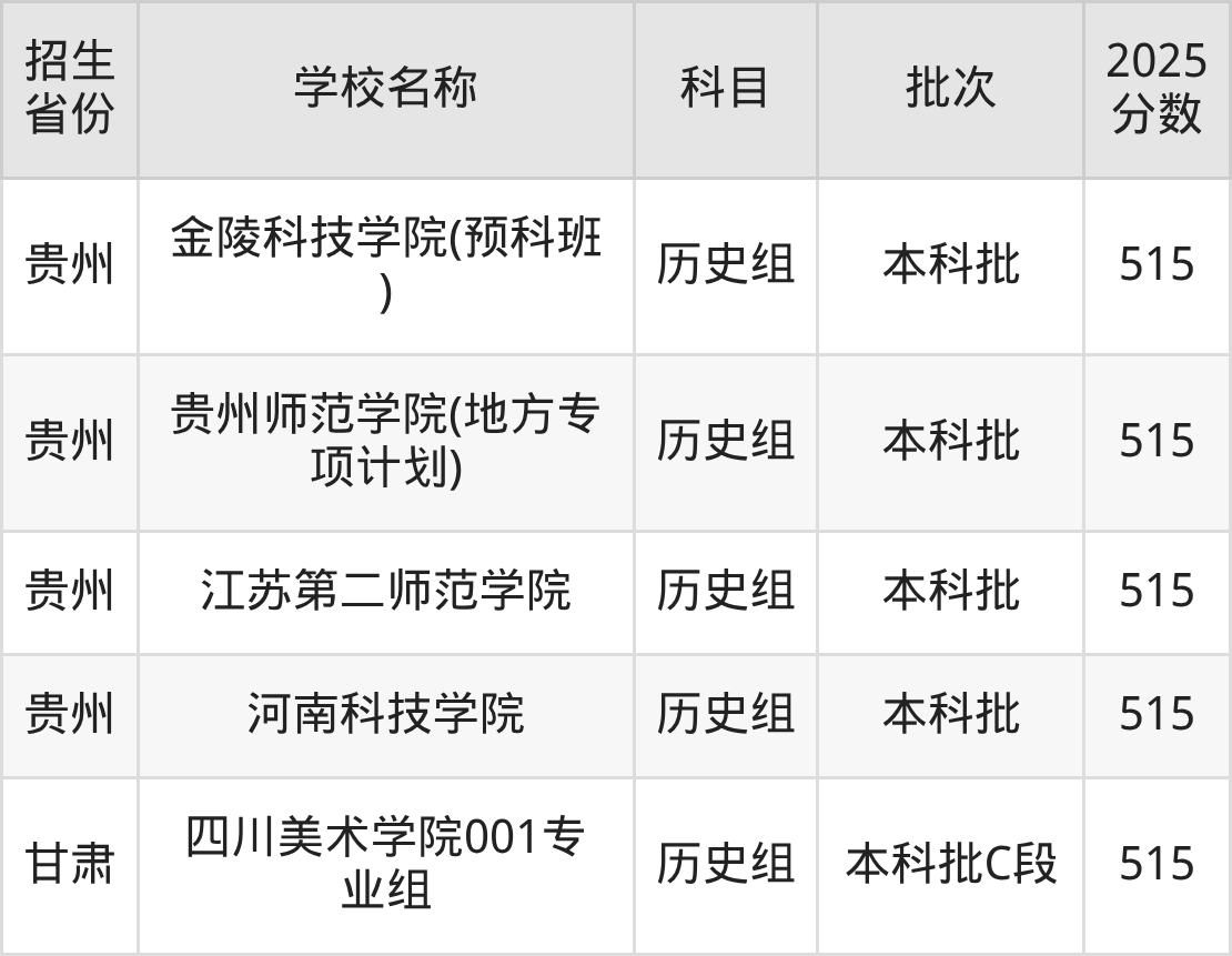 二、各省515分的二本公办大学名单