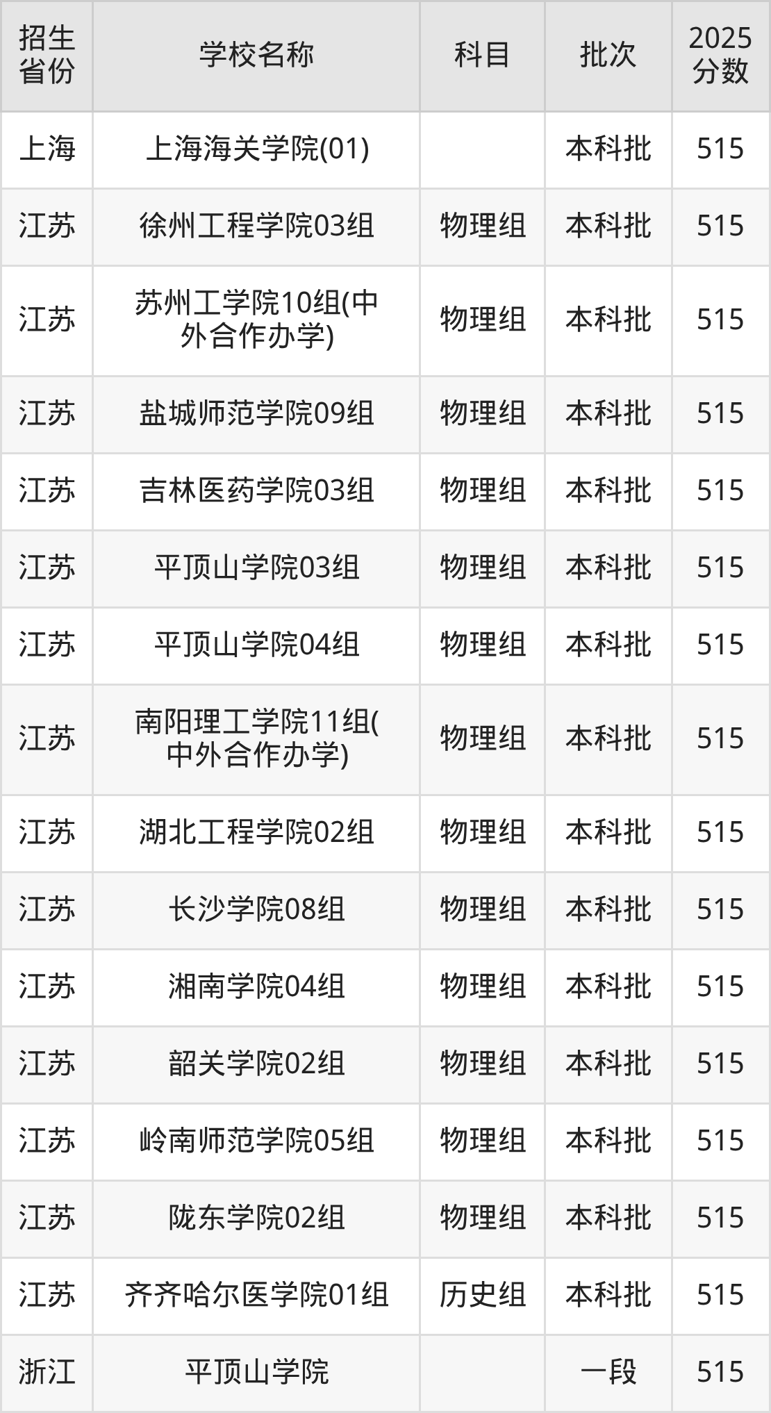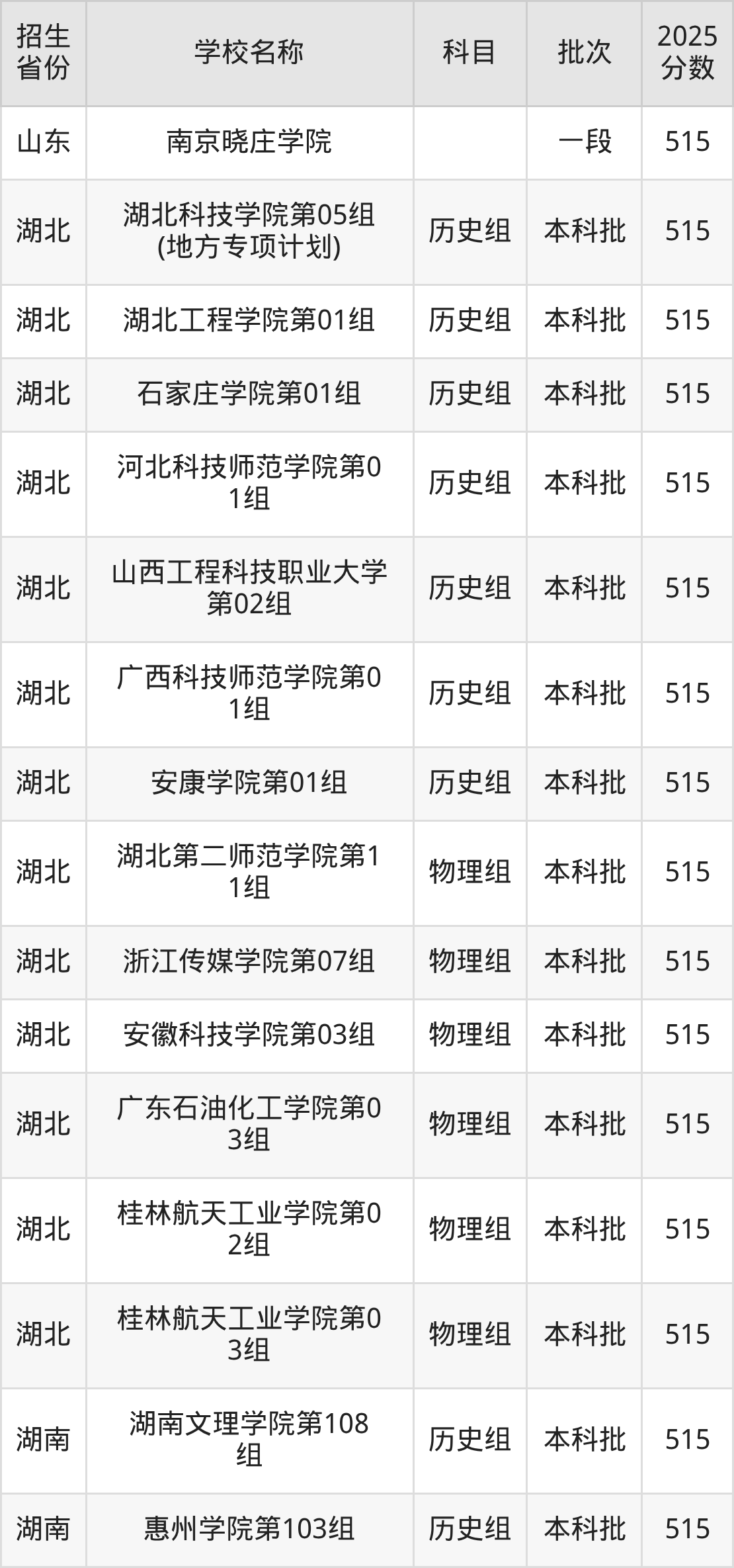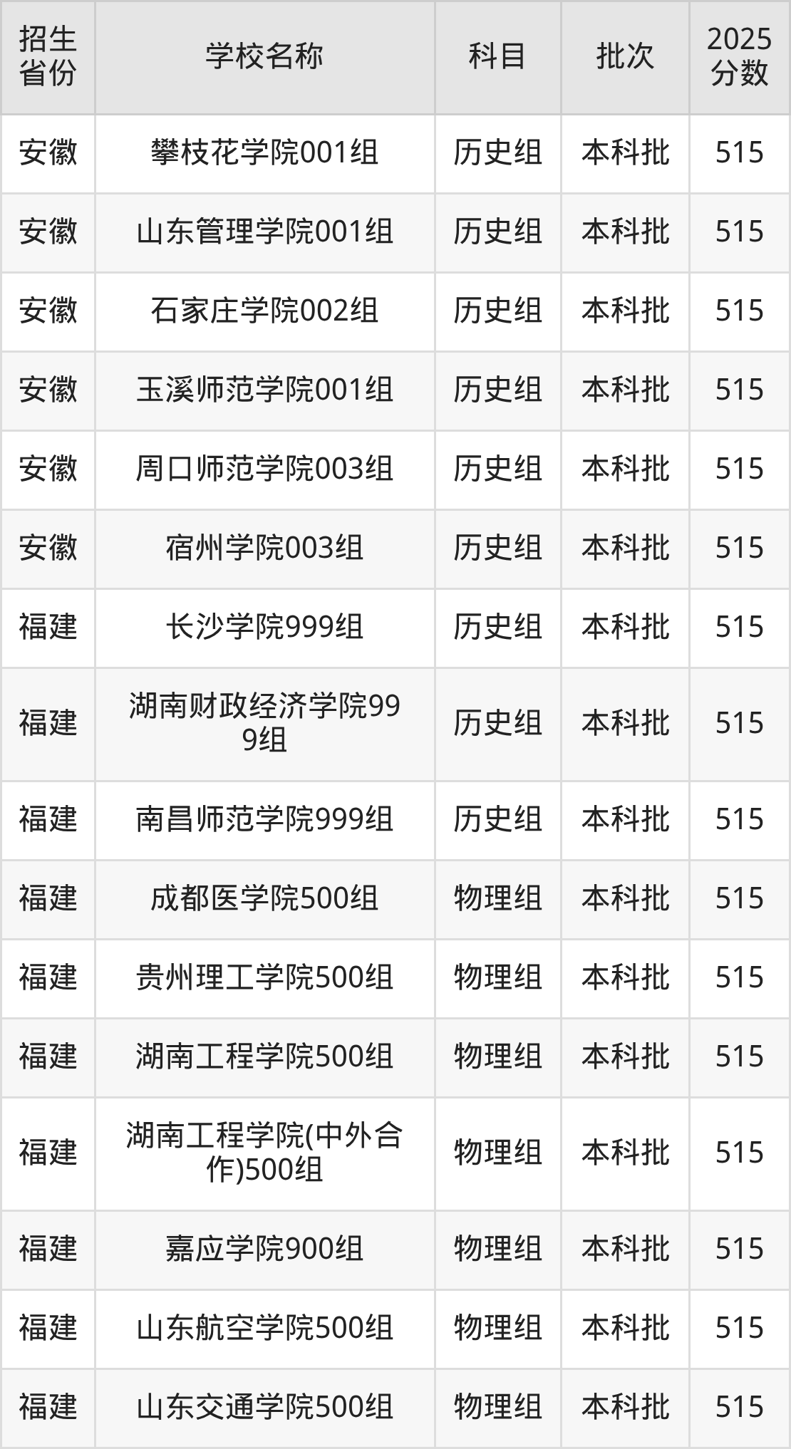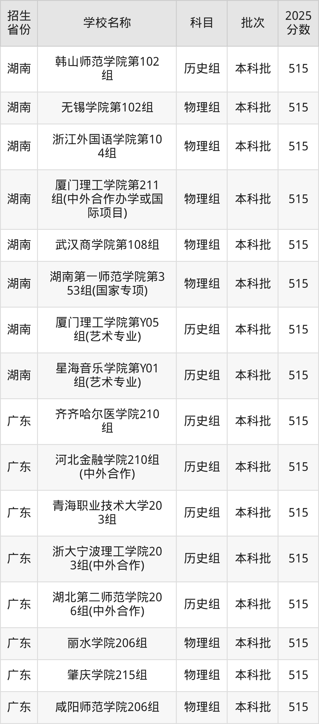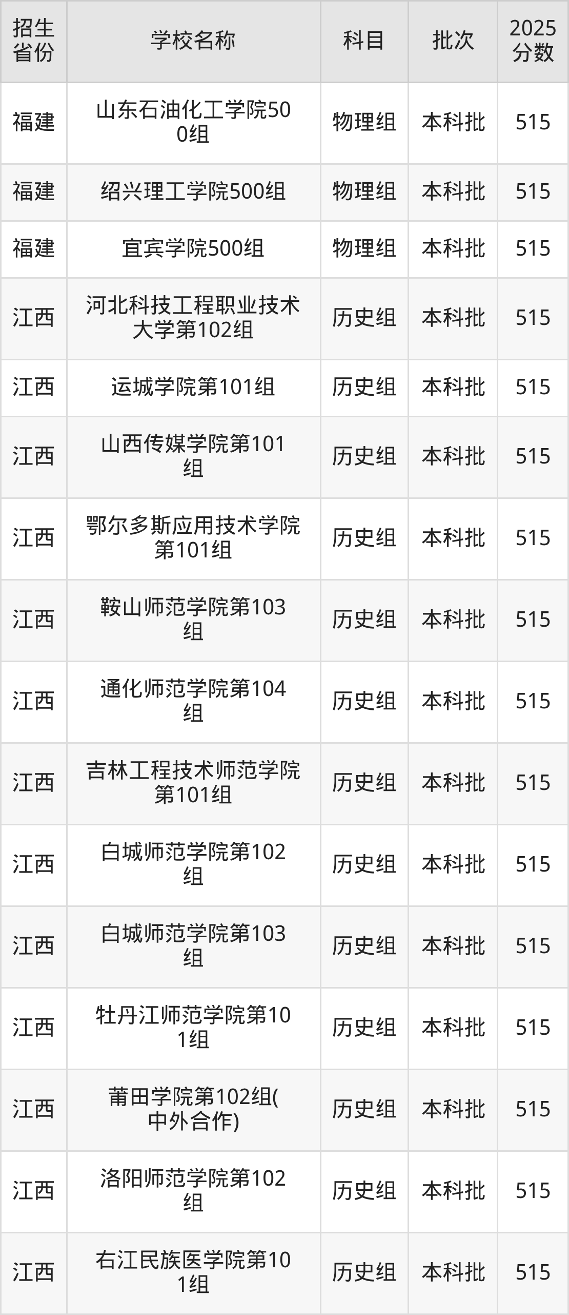二、各省515分的二本公办大学名单