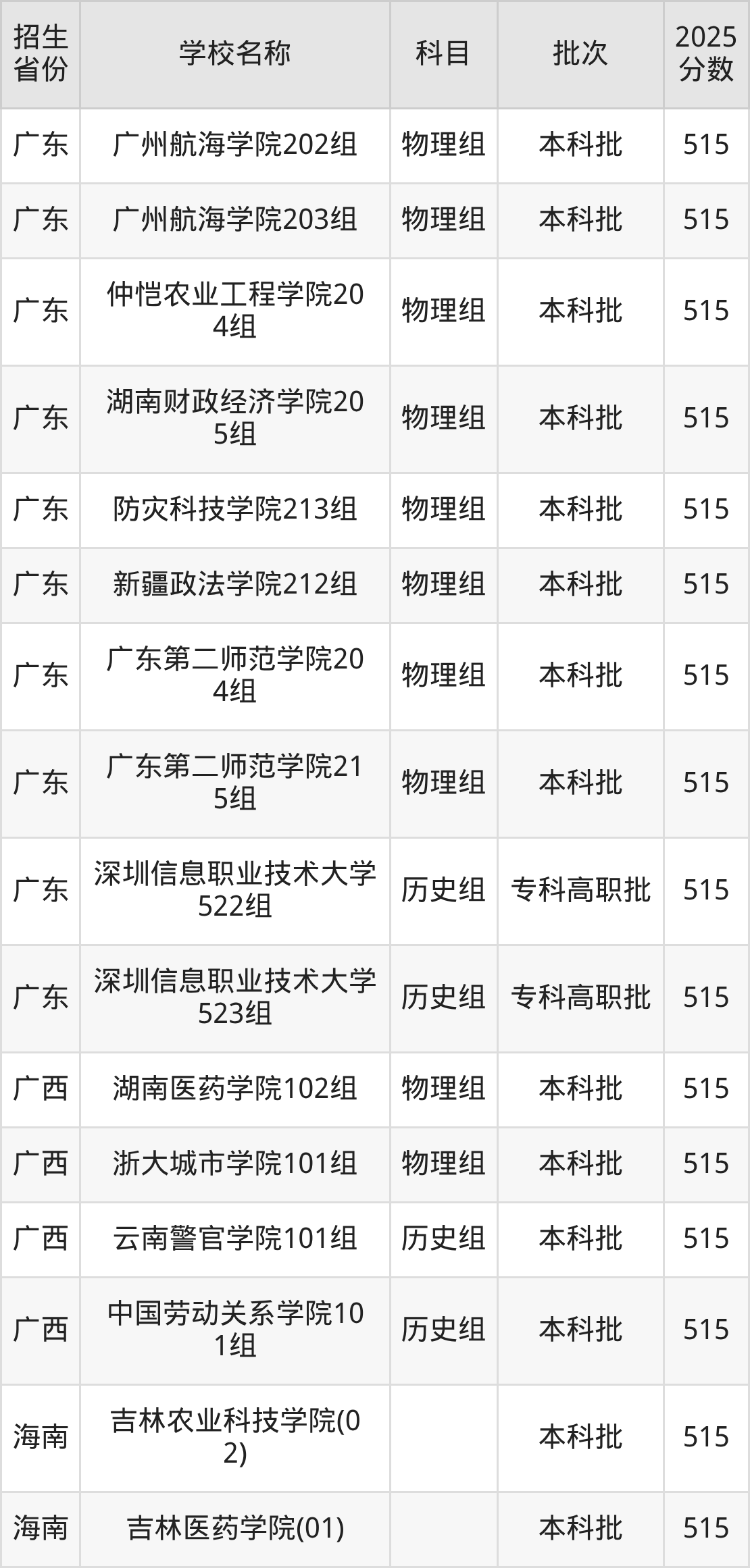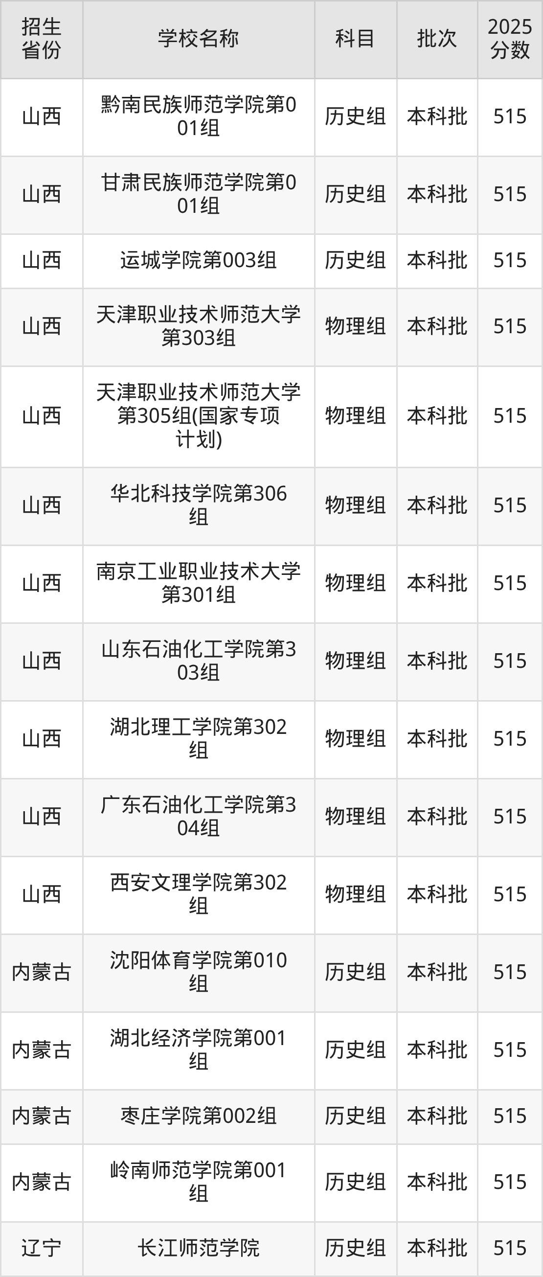 筛选全国各省2025年录取分数线为515分的二本公办大学如下: