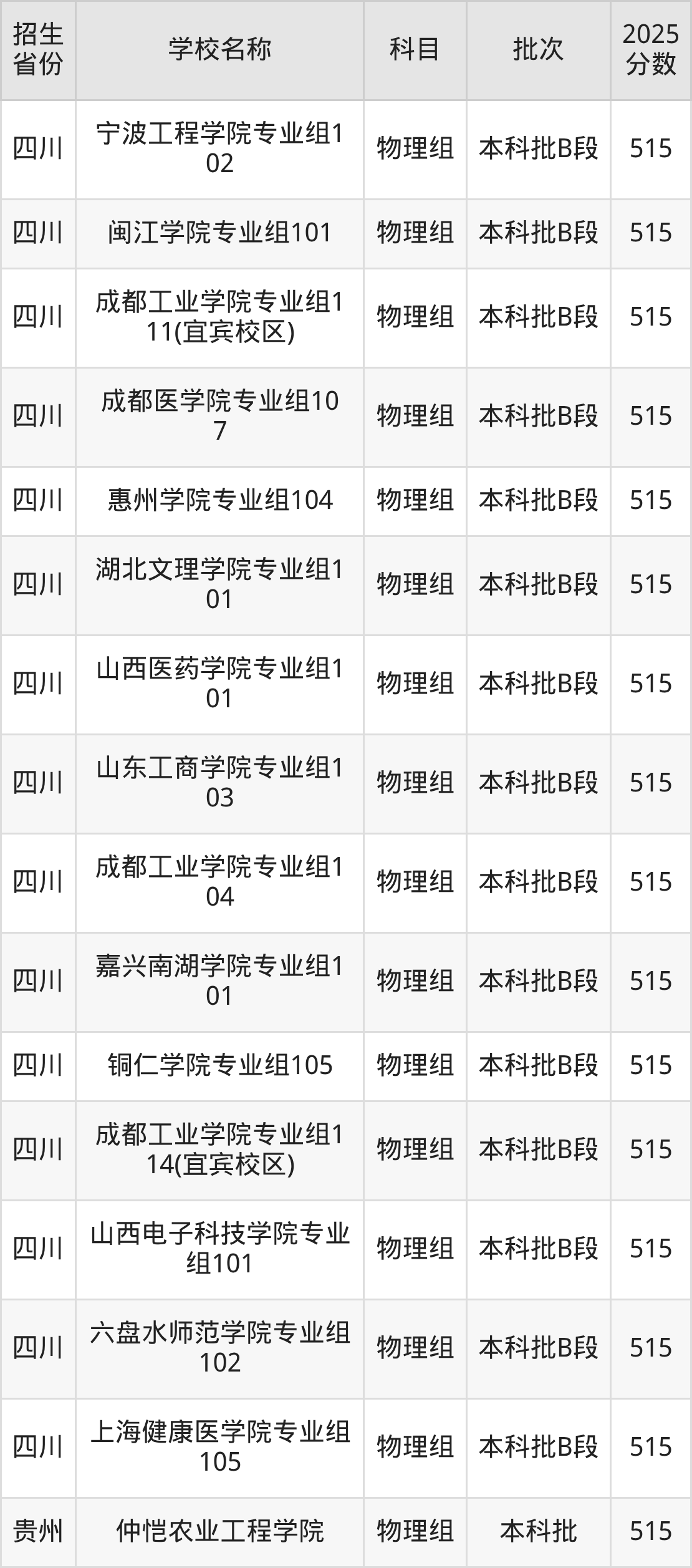 四川省物理组分数线是515分的二本公办大学有:南昌医学院、右江民族医学院、遵义师范学院、宁波工程学院、闽江学院、成都工业学院、成都医学院、惠州学院、湖北文理学院、山西医药学院。