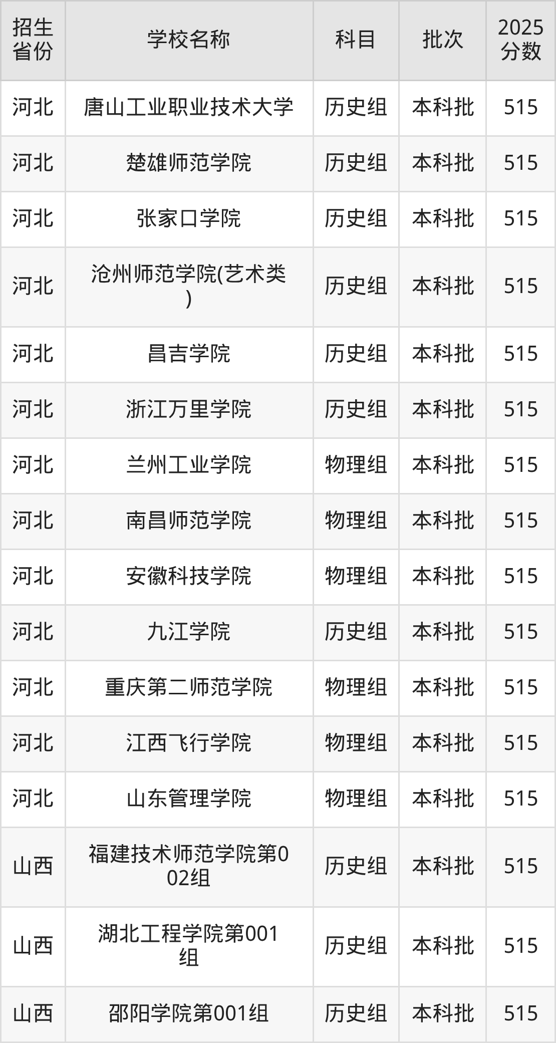 四川省历史组分数线是515分的二本公办大学有:唐山工业职业技术大学。
