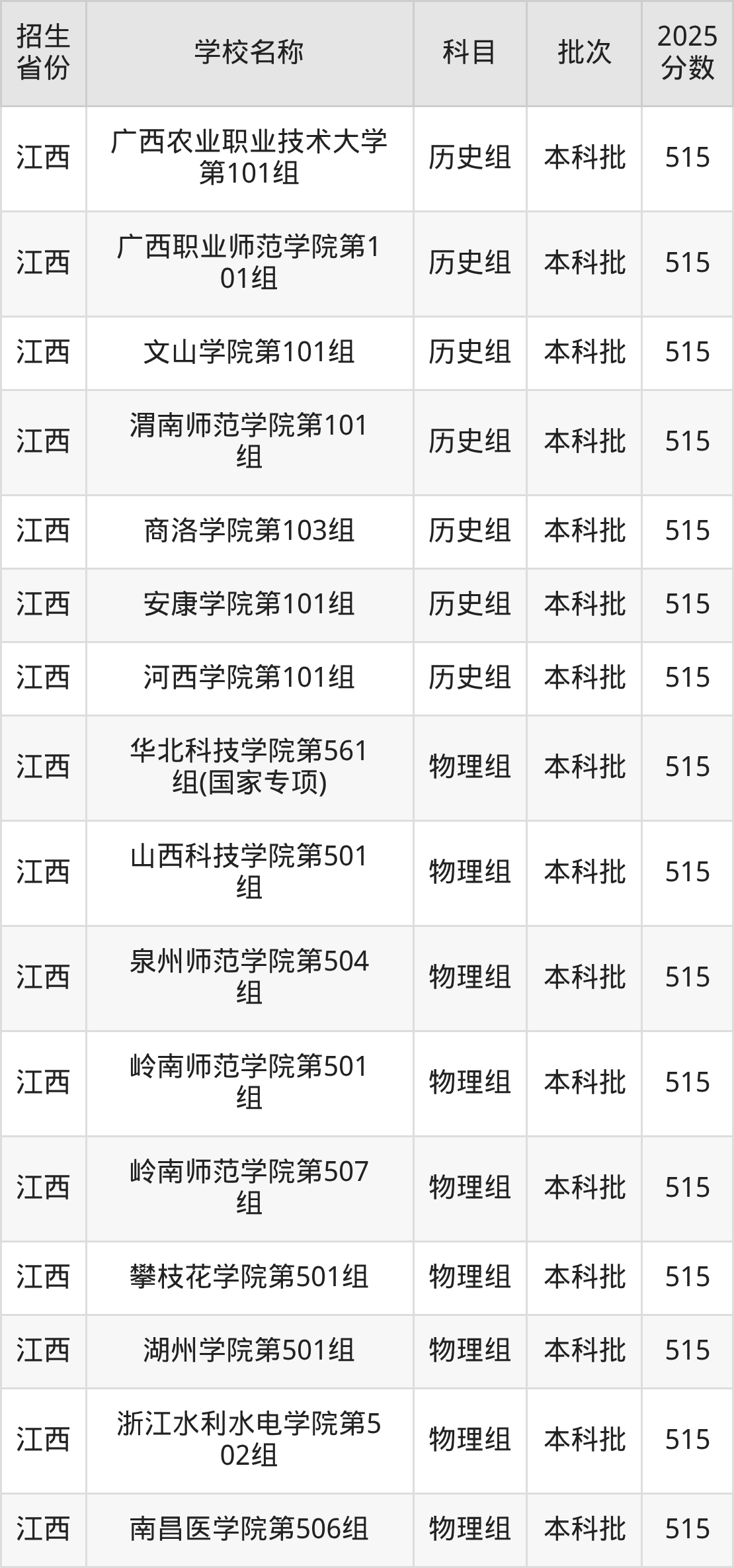 江西省物理组分数线是515分的二本公办大学有:华北科技学院、山西科技学院、泉州师范学院、岭南师范学院、攀枝花学院、湖州学院、浙江水利水电学院、南昌医学院。