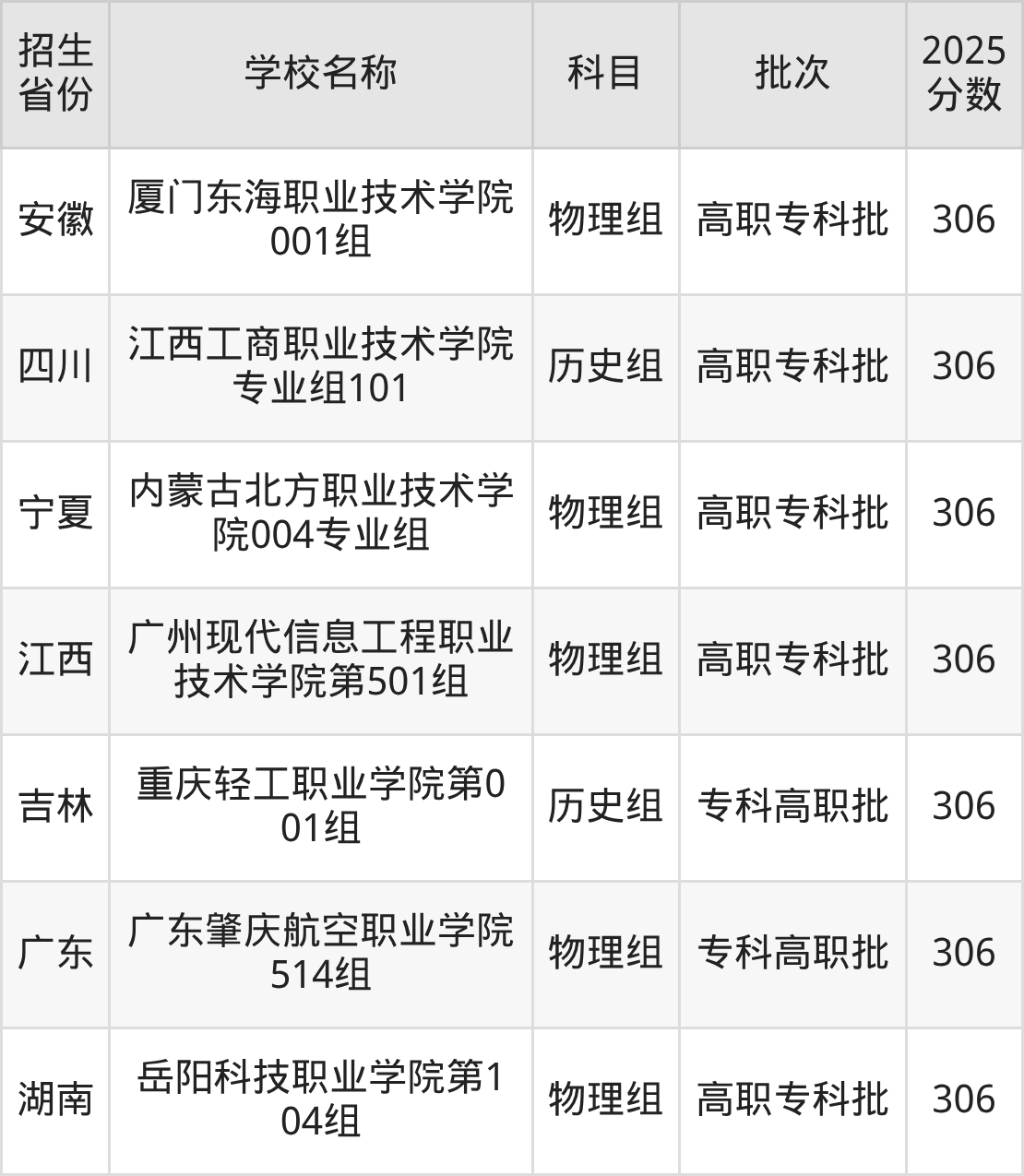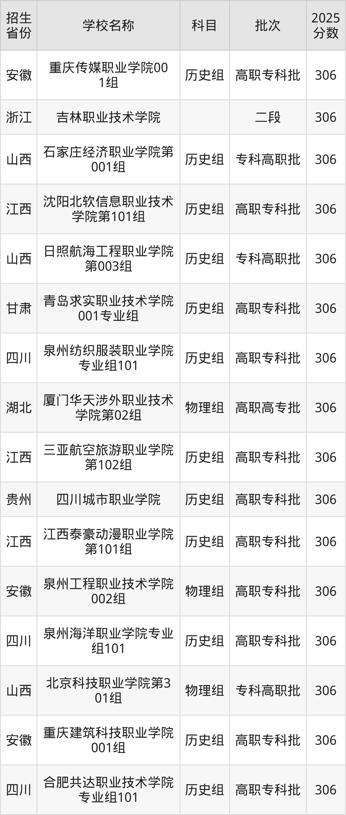 江西省历史组分数线是306分的民办专科学校有:沈阳北软信息职业技术学院、三亚航空旅游职业学院、江西泰豪动漫职业学院。