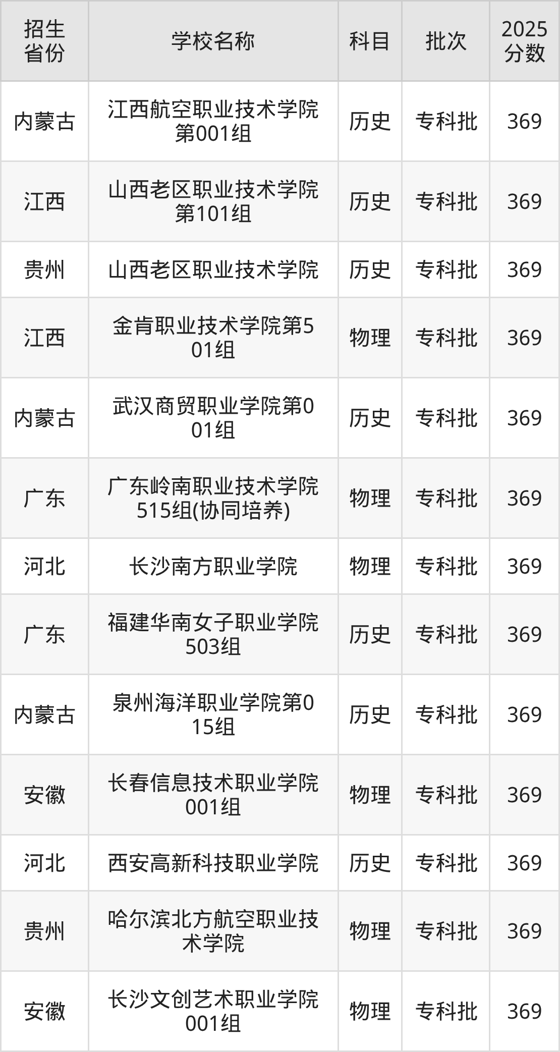 筛选全国各省2025年录取分数线为369分的民办专科学校如下: