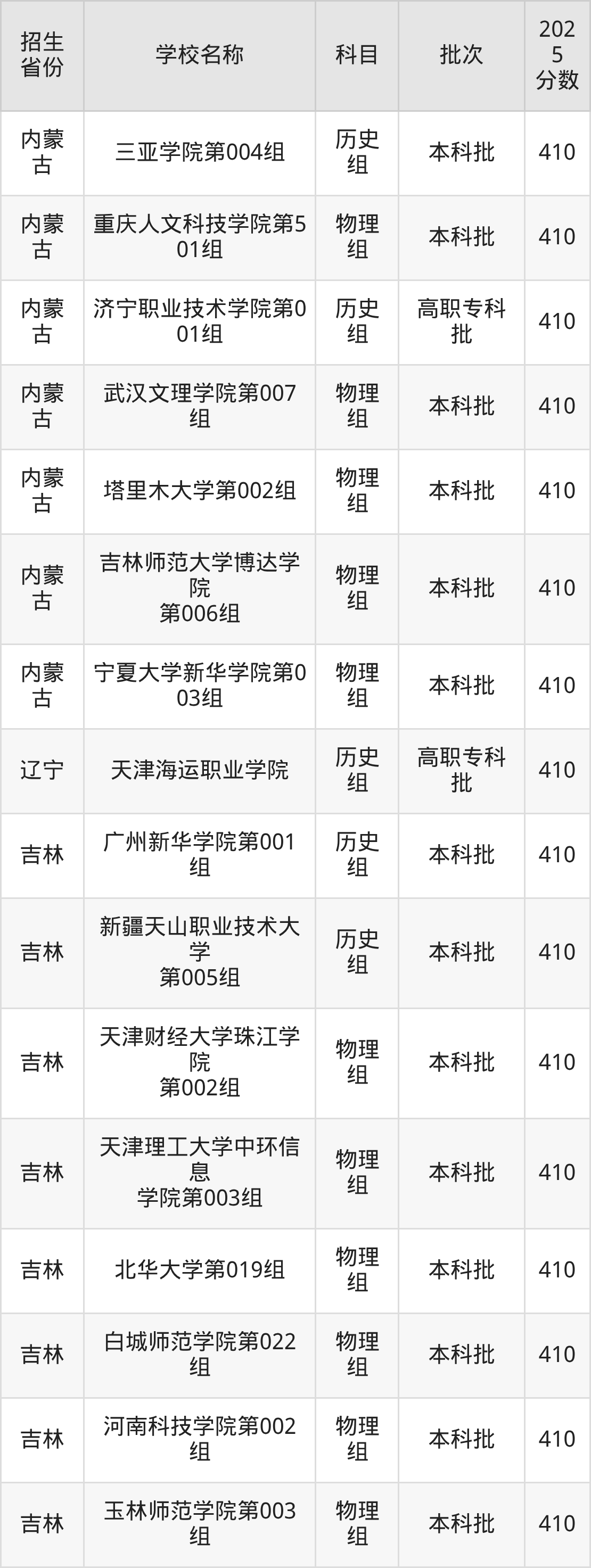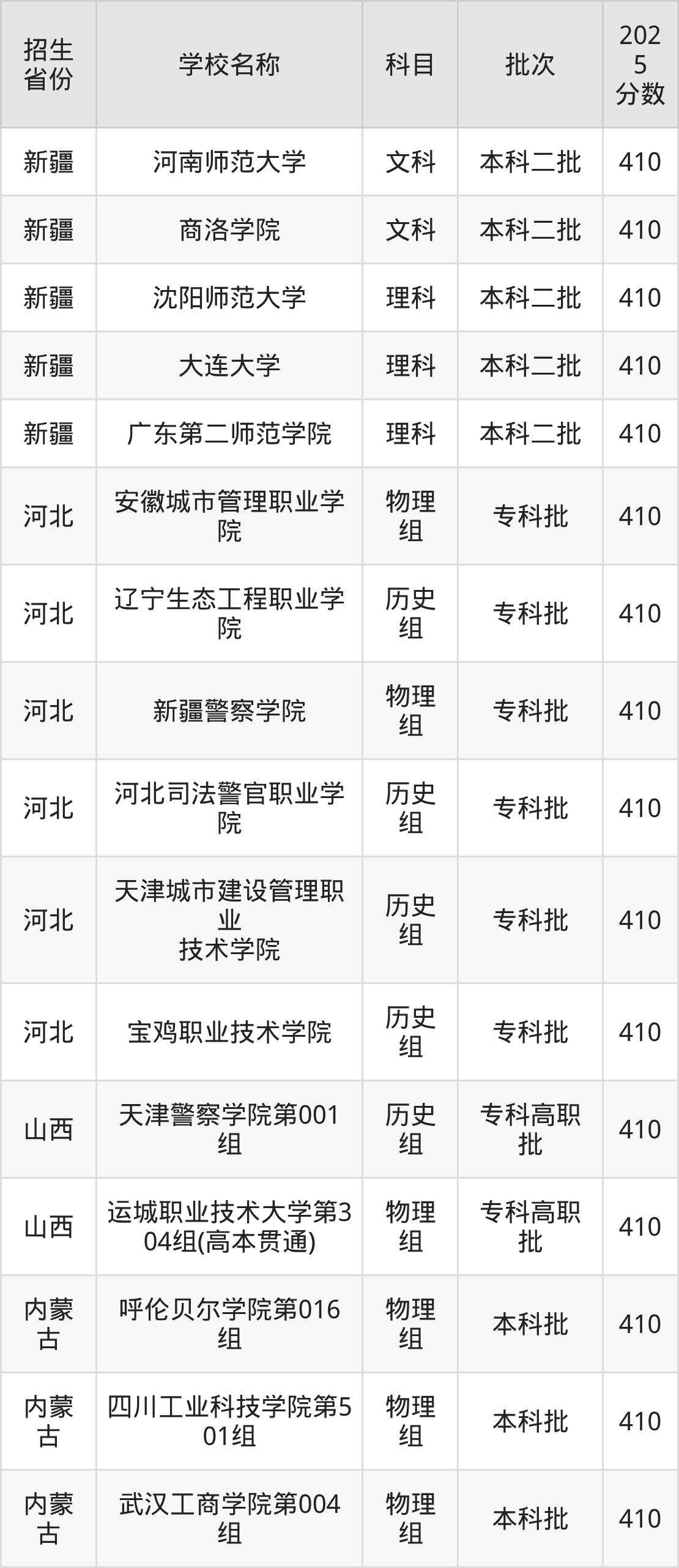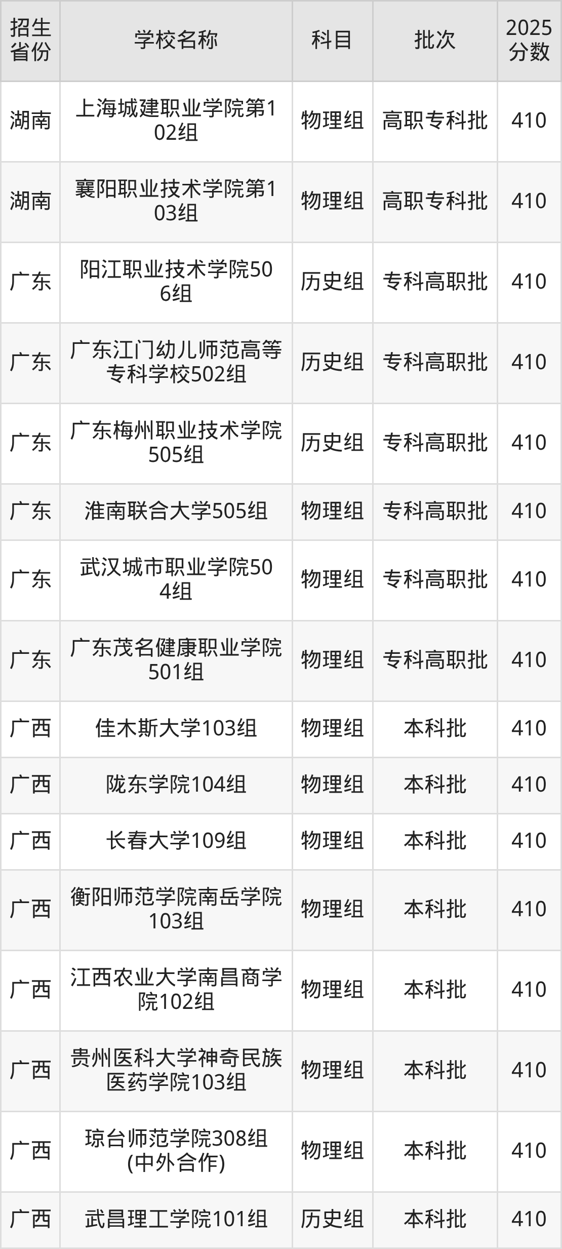 筛选全国各省2025年录取分数线为410分的文科大学如下: